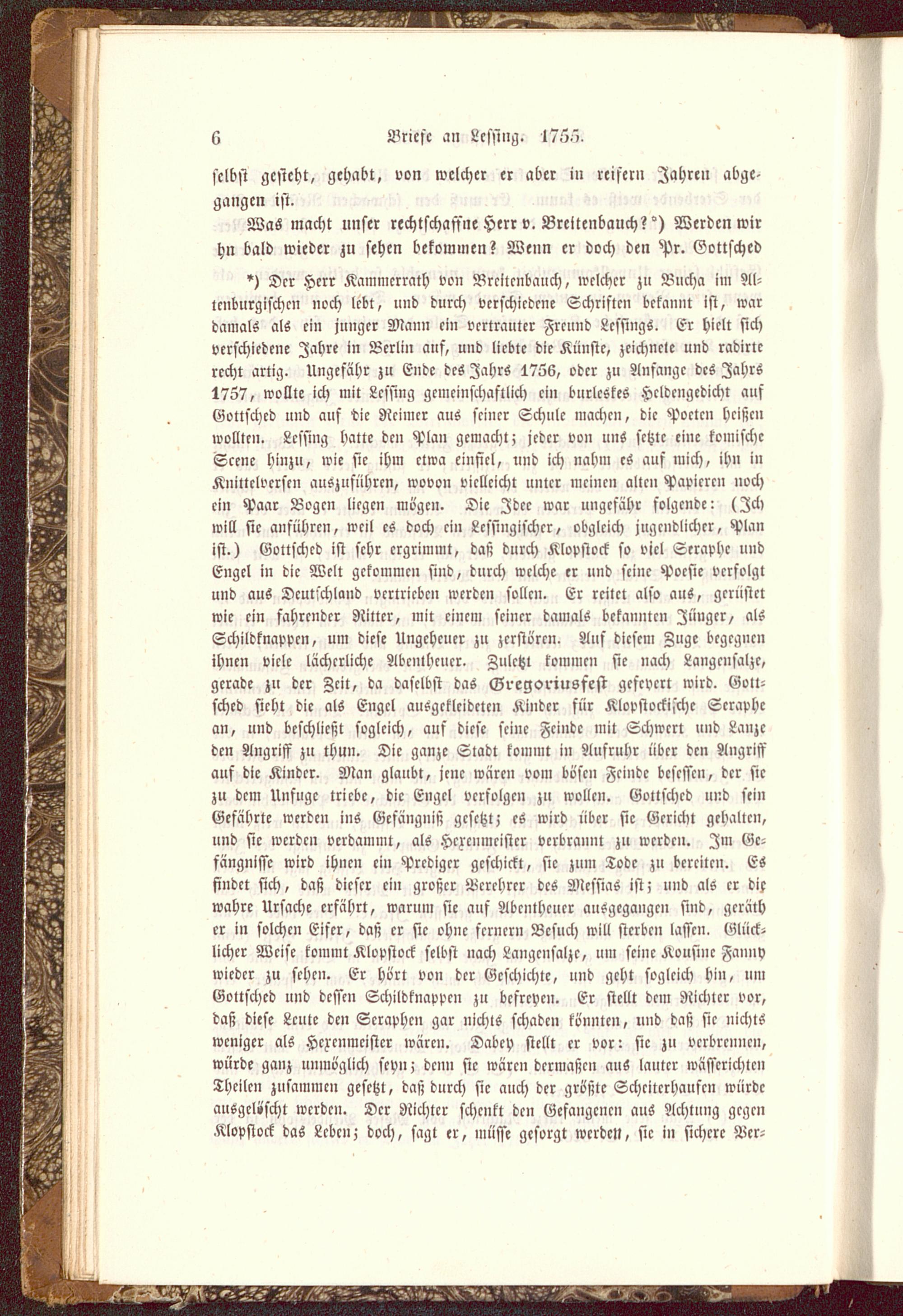 *) Der Herr Kammcrrath von Brcltcnbanch, welcher zu Buch« im Al-lcnburgischcn noch lebt, und durch verschiedene Schriften bekannt ist, wardamals als ei» junger Mann ein vertrauter Freund Lcssings. Er hielt sichverschiedene Jahre in Berlin auf, und liebte die Künste, zeichnete und radirtcrecht artig. Ungefähr zu Ende des Jahrs 1766, oder zu Anfange des Jahrs1757, wollte ich mit Lcsstng gemeinschaftlich ein burleskes Heldengedicht aufGottsched und auf "die Sicimcr aus seiner Schule machen, die Poeten heißenwollten. Lessiug hatte den Plan gemacht; jeder von uns setzte eine komischeScene hinzu, wie sie ihm etwa einfiel, und ich »ahm es aus mich, ihn inKnittelversen auszuführen, wovon vielleicht unter meine» alten Papiere» nochein Paar Böge» liegen mögen. Die Idee war ungefähr folgende: (Ichwill sie anführen, weil es doch ein Lcssittgischer / obgleich jugendlicher, Planist.) Gottsched ist sehr ergrimmt, daß durch Klopstock so viel Seraphe undEngel in die Welt gekommen sind, durch welche er und seine Poesie verfolgtund aus Deutschland vertrieben werden solle». Er reitet also aus, gerüstetwie ein fahrender Ritter, niit einem seiner damals bekannten Jünger, alsSchildknappen, um diese Ungeheuer zu zerstören. Aus diesem Zuge begegne»ihnen viele lächerliche Abcinhcucr. Zuletzt konimen sie »ach Langciisalzc,gerade zu der Zeit, da daselbst das Gregoriusfest gescpcrt wird. Gott-sched sieht die als Engel ausgekleideten Kinder für Klopstockijchc Seraphean, und beschließt sogleich, auf diese seine Feinde mit Schwert und Lanzeden Angriff zu thun. Die ganze Stadt kommt in Aufrubr über den Angriffauf die Kinder. Man glaubt, jene wären vom böse» Feinde besessen, der siezu dem Unfugc triebe, die Engel verfolge» zu wollen. Gottsched und sei»Gefährte werde» ins Gefängniß gesetzt; es wird über sie Gericht gehalten,und sie werden verdammt, als Hcrcnmrisicr verbrämn zu werden. Im Ge-fängnisse wird ihnen ein Prediger geschickt, sie zum Tode zu bereiten. Esfindet sich, daß dieser ei» großer Verehrer des Messias ist; und als er diewahre Ursache erfährt, warum sie auf Abcnthcucr ausgegangen sind, gcräther in solche» Eifer, daß er sie ohne fernern Besuch will sterben lassen. Glück-licher Weise kommt Klopstock selbst nach Langciisalzc, um seine Kousinc Faiinvwieder zu sehen. Er Hort von der Geschichte, und geht sogleich hin, nniGottsched und dcssen Schildknappen zu bcfrcve». Er stellt dem Richter vor,daß diese Leute den Seraphen gar nichts schaden konnte», u»d daß sie nichtsweniger als Hcrcnmcister wären. Dabcv stellt er vor: sie zu verbrenne»,würde ganz unmöglich seyn; denn sie wäre» dermaßen aus lauter wässcrichlc»Theilen zusammen gesetzt, daß durch sie auch der größte Scheiterhaufen würdeauegelüscht werden. Der Richter schenkt den Gefangenen aus Achtung gegenKlopstock das Lebe»; doch, sagt er, müsse gesorgt werden, stc in sichere Wer-