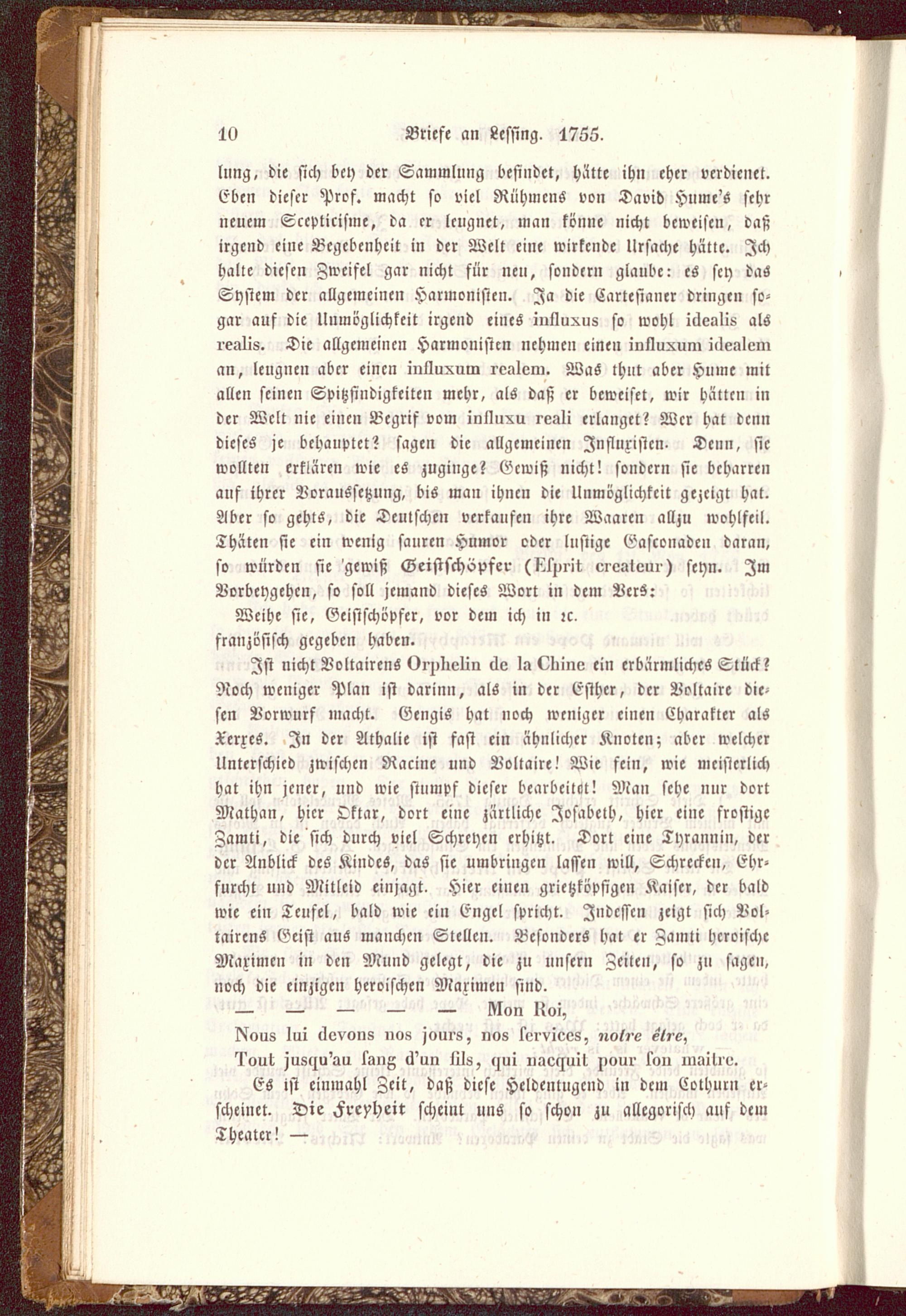 Ist nicht VoltairenS vi'i>üeliii äe la iüliine ein erbärmliches Stück?Roch weniger Plan ist darin», als in der Esther, der Voltaire die-sen Vorwurf macht. Gengis hat noch weniger einen Charakter als5'erxeS. In der Alhaiie ist fast ein ähnlicher Knoten; aber welcherUnterschied zwischen Racine und Voltaire! Wie fein, wie meisterlichhat ihn jener, und wie stumpf dieser bearbeitet! Mau sehe nur dortMathan, hier Oktar, dort eine zärtliche Iosabeth, hier eine frostigeZamti, die sich durch viel Schreyen erhitzt. Dort eine Tyrannin, derder Anblick des KiudeS, das sie umbringen lassen will, Schrecke», Ehr-furcht und Mitleid einjagt. Hier einen grietzköpsigen Kaiser, der baldwie ein Teufel, bald wie ein Engel spricht. Indessen zeigt sich Vol-taircns Geist aus manchen Stellen. Besonders hat er Zamti heroischeMaximen in den Mund gelegt, die zu unsern Zeilen, so zn sage»,noch die einzigen heroischen Marimen sind.— — — — — IVlon lioi,I^ous lui llovons ncis joui'8, N08 tvl'vieos, ,!v/,ö e/?e,?ouk juü^u'llu kimg klls, ,zui nacszuil. ^iour son inuilrv.ES ist einmahl Zeit, daß diese Heldentugeud iu dein Lothurn er-scheinet. Die Freyheit scheint uns so schon zu allegorisch auf demTheater! —