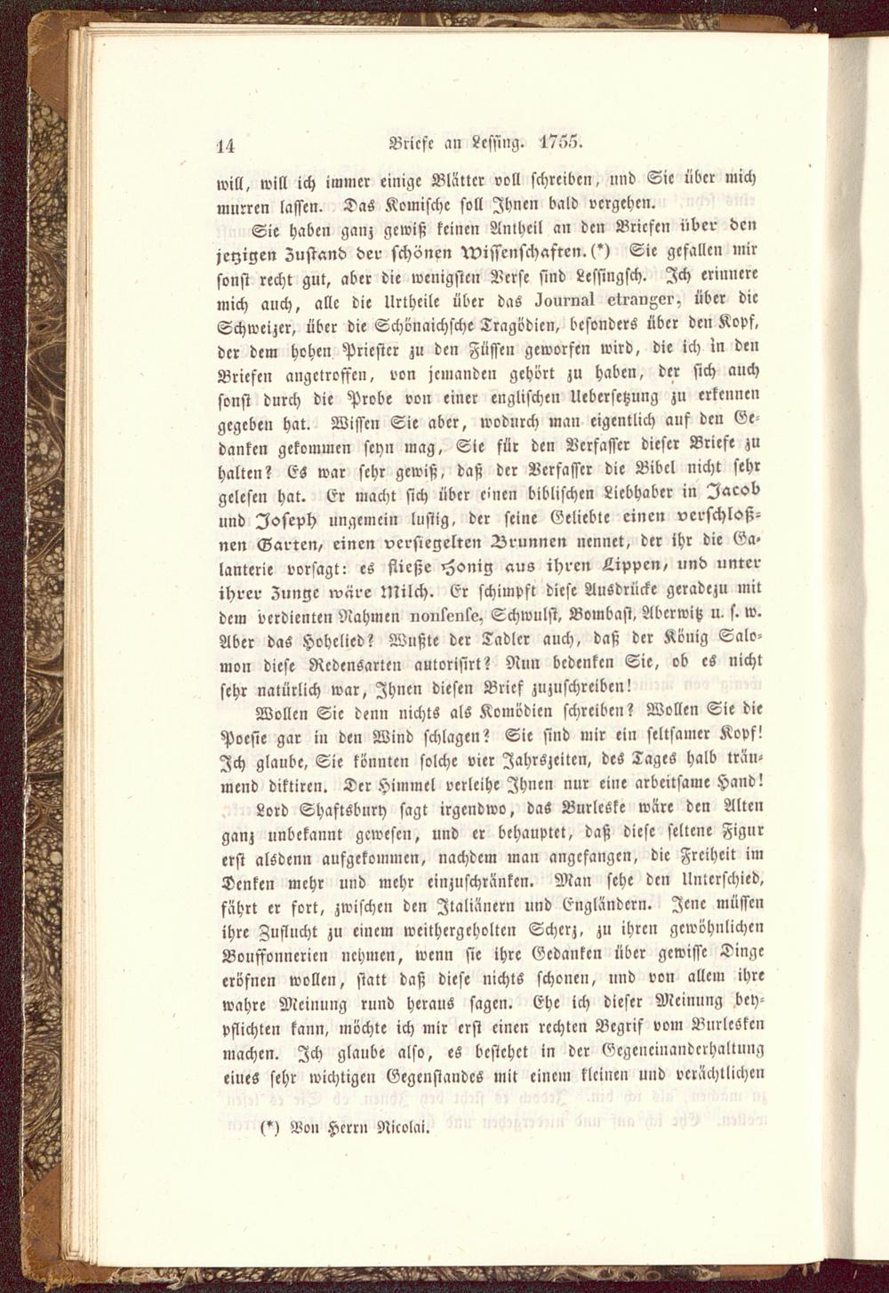 Sie haben ganz gewiß keinen Antheil an den Briefen über dc»jetzigen Zustand der schönen Wissenschaften. (') Sie gefallen mirsonst recht gut, aber die wenigsten Verse sind Lcssingsch. Ich erinneremich auch, alle die Urtheile über das Journal okr.inMr. über dieSchweizer , über die Schönaichsche Tragödien, besonders über den Kopf,der dem hohen Priester zu den Füssen geworfen wird, die ich in denBriefen angetroffen, von jemanden gehört zu haben, der sich auchsonst durch die Probe von einer englischen Uebersetzung zu erkennengegeben hat. Wissen Sie aber, wodurch man eigentlich auf den Ge-danken gekommen seyn mag, Sie für den Verfasser dieser Briefe zuhalten? vs war sehr gewiß, daß der Verfasser die Bibel nicht sehrgelesen hat. Er macht sich über einen biblischen Liebhaber in Jacobund Joseph lingeincin lustig, der seine Geliebte einen verschloß-nen Garten, einen versiegelten Brunnen nennet, der ihr die Ga-lanterie vorsagt: es fließe Honig aus ihren Lippen, und unterihrer Zunge wäre Milch. Er schimpft diese Ausdrücke geradezu mitdem verdienten Nahmen nmilenle, Schwulst, Bombast, Aberwitz u, s. w.Aber das Hohelied? Wußte der Tadlcr auch, daß der König Salo-mon diese Redensarten aulorisirt? Nun bedenken Sie, ob es nichtsehr natürlich war, Ihnen diesen Brief zuzuschreiben!