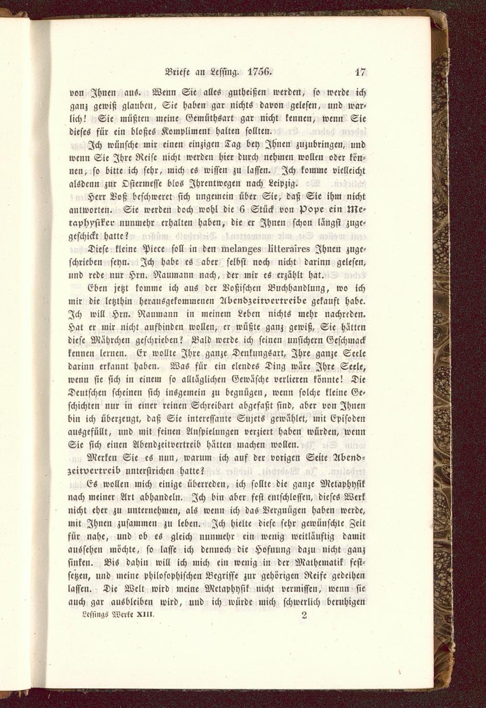 Herr Boß beschweret sich ungemein über Sie, daß Sie ihm nichtantworten. Sie werden doch wohl die 6 Stück von Pope ein Me-taphysiker nunmehr erhalten haben, die er Ihnen schon langst zugc-geschickt hatte?