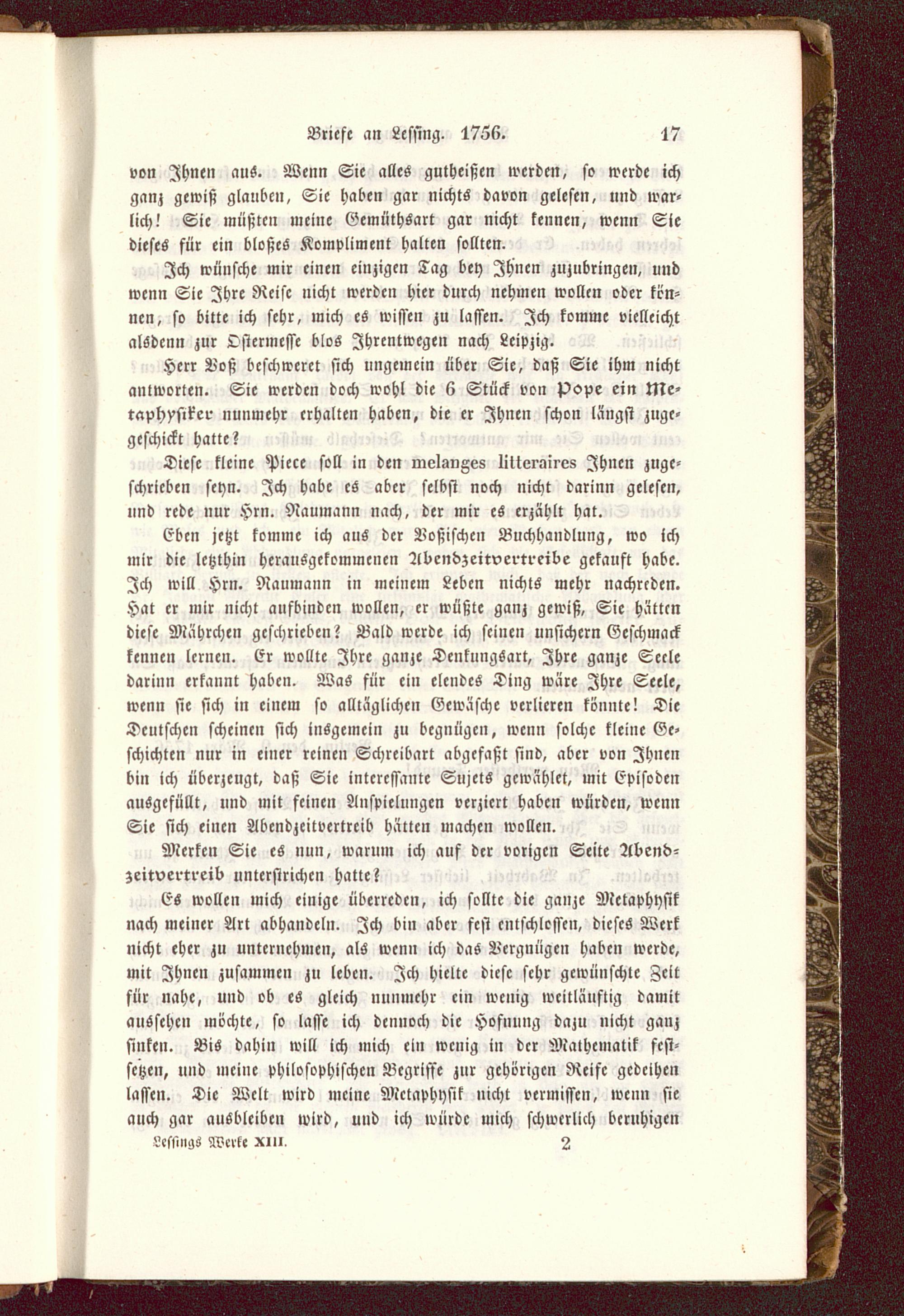 Es wollen mich einige überreden, ich sollte die ganze Metaphysiknach meiner Art abhandeln. Ich bin aber fest entschlossen, dieses Werknicht eher zu unternehmen, als wenn ich das Vergnügen haben werde,mit Ihnen zusammen zu leben. Ich hielte diese sehr gewünschte Zeitfür nahe, und ob es gleich nunmehr ein wenig wcitläuftig damitaussehe» möchte, so lasse ich dennoch die Hofnung dazu nicht ganzsinken. Bis dahin will ich mich ein wenig in der Mathematik fest-setzen, und meine philosophischen Begriffe zur gehörigen Reife gedeihenlassen. Die Welt wird meine Metaphysik nicht vermissen, wenn sieauch gar ausbleiben wird, und ich würde mich schwerlich beruhigenLessmgS Werk« xm, 2