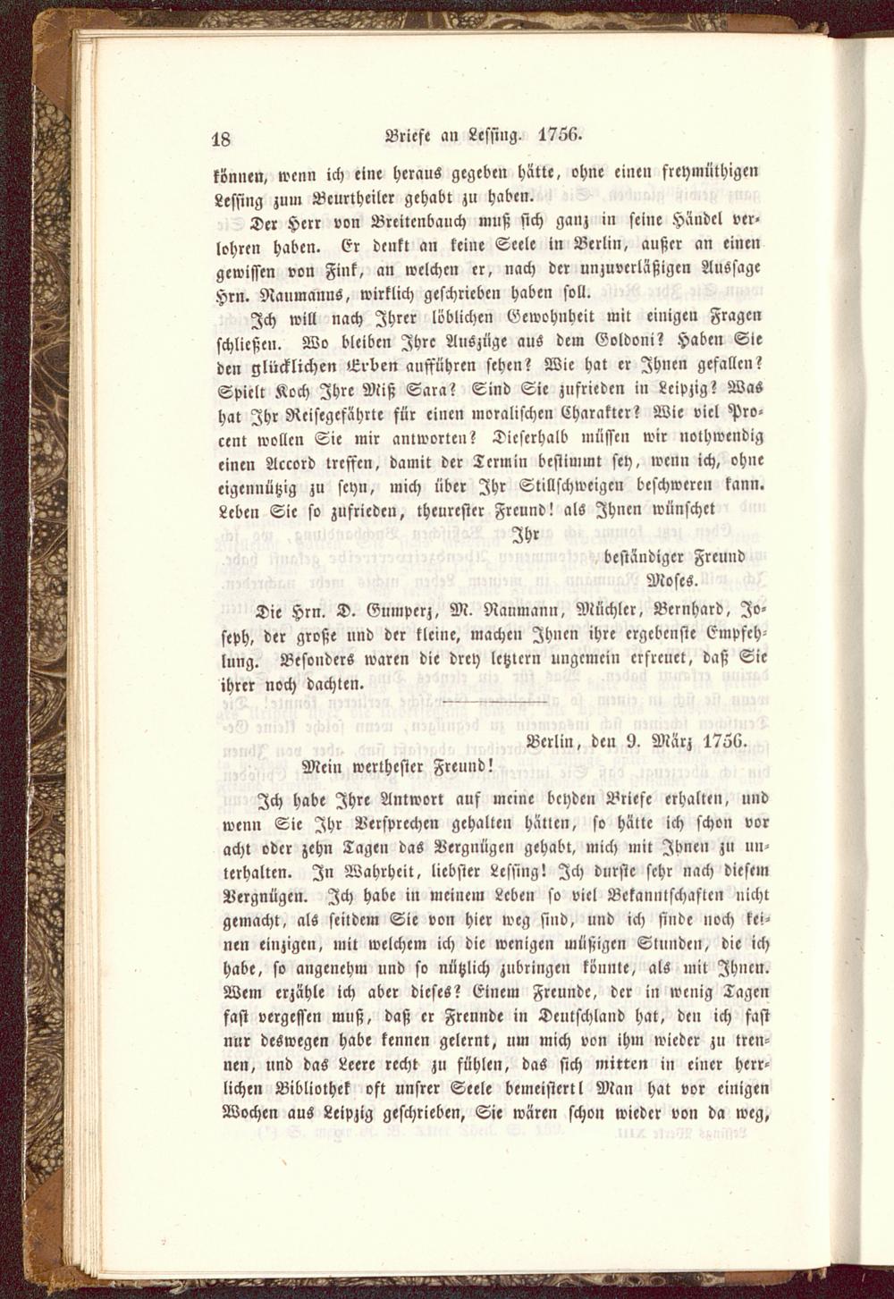 Ich habe Ihre Antwort auf meine beyde» Briefe erhalte», undwenn Sie Ihr Versprechen gehalten hätte», so hätte ich schon voracht oder zehn Tagen das Vergnügen gehabt, mich mit Ihnen zu un-terhalten. In Wahrheit, liebster Lessiug! Ich durste sehr nach diesemVergnügen. Ich habe in meinem Leben so viel Bekanntschaften nichtgemacht, als seitdem Sie von hier weg sind, und ich finde »och kei-nen einzigen, mit welchem ich die wenigen müßigen Stunde», die ichhabe, so angenehm und so nützlich zubringen könnte, als mit Ihnen.Wem erzähle ich aber dieses? Einem Freunde, der in wenig Tagenfast vergessen mnß, daß er Freunde i» Deutschland hat, den ich fastnur deswegen habe kennen gelernt, um mich von ihm wieder zu tren-nen, nnd das Leere recht zu fühlen, das sich mitten in einer herr-lichen Bibliothek oft unsrer Seele bemeistcrtl Man hat vor einigenWochen aus Leipzig geschrieben, Sie wären schon wieder von da weg,