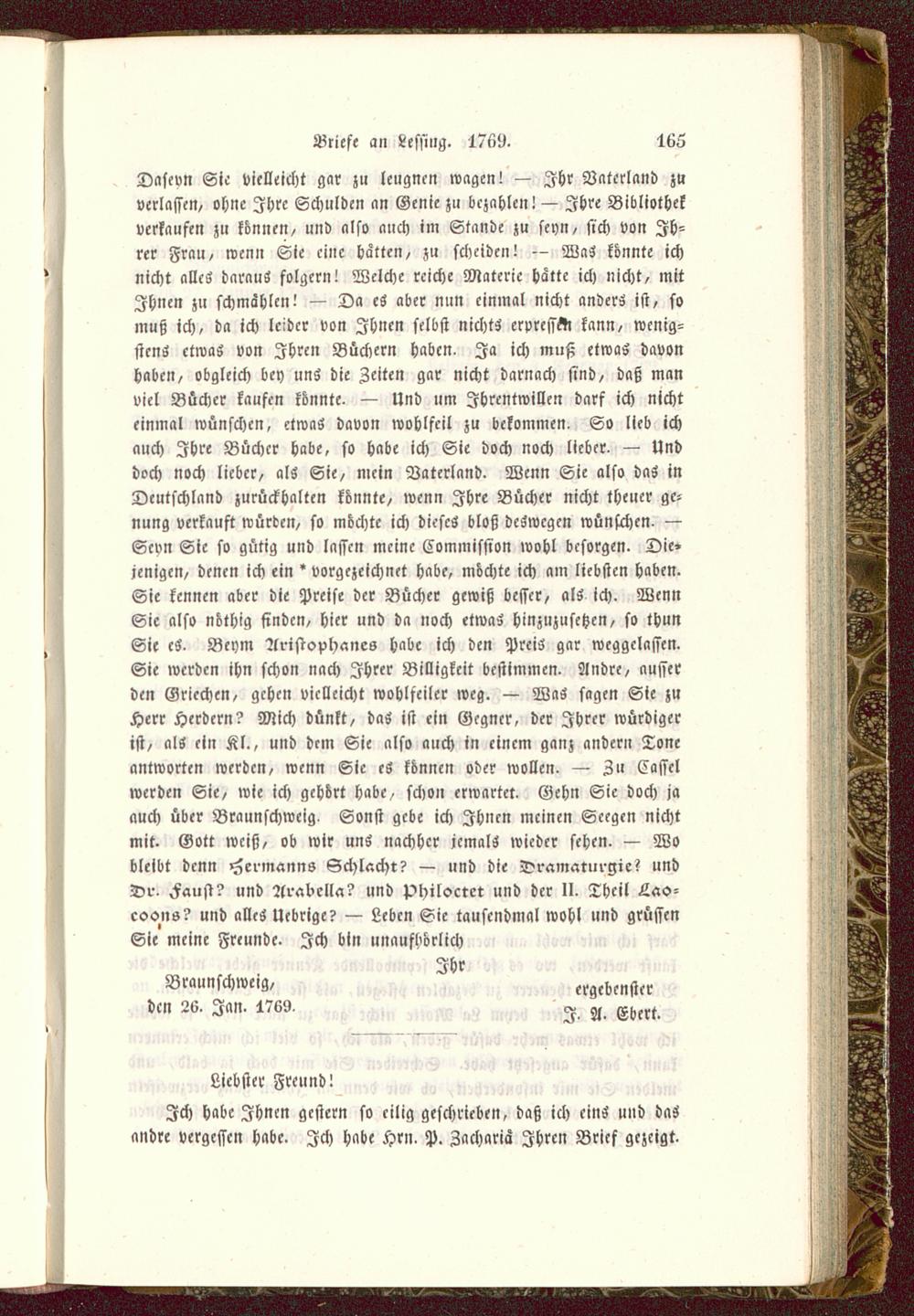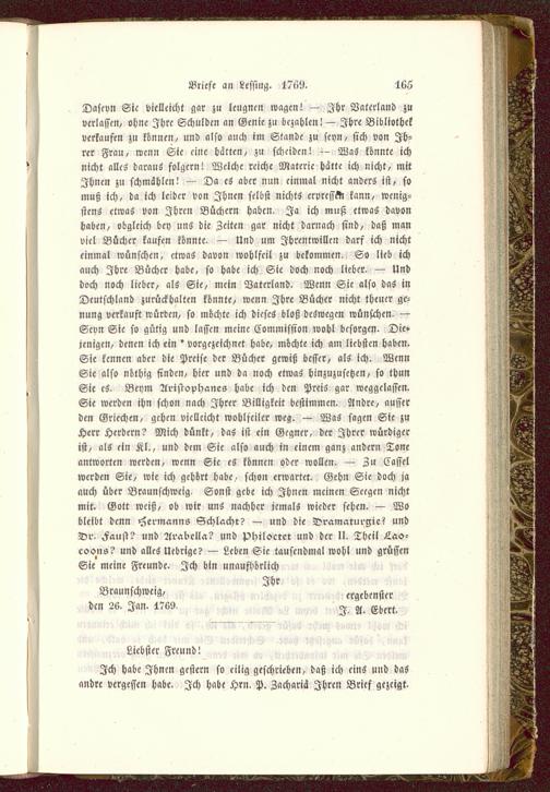 Dasevn Sie vielleicht gar zu leugnen wagen! — Ihr Vaterland zuverlassen/ ohne Ihre Schulden an Genie zu bezahlen! — Ihre Bibliothekverkaufen zu können, und also auch im Stande zu seyn, sich von Ih-rer Frau, wenn Sie eine hatten, zu scheiden! — WaZ konnte ichnicht alles daraus folgern! Welche reiche Materie hätte ich nicht, mitIhnen zu schmählen! — Da cS aber nun einmal nicht anders ist, somuß ich, da ich leider von Ihnen selbst nichts erpresset kann, wenig-stens etwas von Ihren Büchern haben. Ja ich muß etwas davonhaben, obgleich bey uns die Zeiten gar nicht darnach sind, daß manviel Bücher kaufen könnte. — Und um Jhrentwillen darf ich nichteinmal wünschen, etwas davon wohlfeil zu bekommen. So lieb ichauch Ihre Bücher habe, so habe ich Sie doch noch lieber. — Unddoch noch lieber, als Sie, mein Vaterland. Wenn Sie also das inDeutschland zurückhalten könnte, wenn Ihre Bücher nicht theuer gc-nung verkauft würden, so möchte ich dieses bloß deswegen wünschen. —Scvn Sie so gütig und lassen meine Commission wohl besorgen. Die»jenigcn, denen ich ein * vorgezcichnet habe, möchte ich am liebsten haben.Sie kennen aber die Preise der Bücher gewiß besser, als ich. WennSie also nöthig finden, hier und da noch etwas hinzuzusetzen, so thunSie cS- Beym Aristophanes habe ich den Preis gar weggelassen.Sie werden ihn schon nach Ihrer Billigkeit bestimmen. Andre, ausserden Griechen, gehen vielleicht wohlfeiler weg. — WaS sagen Sie zuHerr Herdern? Mich dünkt, das ist ein Gegner, der Ihrer würdigerist, als ein Kl., und dem Sie also auch in einem ganz andern Toneantworten werden, wenn Sie cS können oder wollen. — Zu Cassclwerden Sie, wie ich gehört habe, schon erwartet. Gehn Sie doch jaauch über Braunschweig . Sonst gebe ich Ihnen meinen Scegcn nichtmit. Gott weiß, ob wir uns nachher jemals wieder sehen. — Wobleibt denn Hermanns Schlacht? — und die Dramaturgie? undDr. Faust? und Arabella? und philoctet und der II. Theil Las-cocms? und alles Uebrige? — Leben Sie tausendmal wohl und grüsscnSie meine Freunde. Ich bin unaufhörlich
