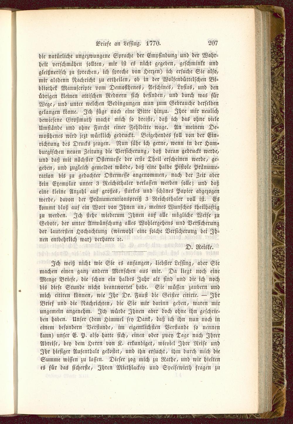 die natürliche ungezwungene Sprache der Empfindung und der Wahr-heit verschmähen sollten/ mir ist es nicht gegeben, geschminkt undgleißncrisch zu sprechen, ich spreche von Herzen) ich ersuche Sie also,mir alSdenn Nachricht zu ertheilen, ob in der Wolfcnbüttelschen Bi-bliothek Mannscriptc vom Demosthenes, Aeschines , LvsiaS, und denübrigen kleinen attischen Rednern sich befinden, und durch was fürWege, und unter welchen Bedingungen man zum Gebrauche derselbengelangen könne. Ich füge noch eine Bitte hinzu. Ihre mir neulichbewiesene Großmuth macht mich so dreiste, daß ich das ohne vieleUmstände und ohne Furcht einer Fehlbitte wage. An meinem De-mosthenes wird jczt würklich gedruckt. BcigehendeS soll von der Ein-richtung des Drucks zeugen. Nun sähe ich gerne, wenn in der Ham-burgischen neuen Zeitung die Versicherung, daß daran gedruckt werde,und daß mit nächster Ostcrmcsse der erste Theil erscheinen werde, ge-geben, und zugleich gemeldet würde, daß eine halbe Pistole Pränume-ratton bis zu gedachter Ostcrmcsse angenommen, nach der Zeit aberkein Exemplar unter 3 RcichSthalcr verlassen werden solle; und daßeine kleine Anzahl auf großes, starkes und schönes Papier abgezogenwerde, davon der PränumcralionSprciß 3 Reichsthaler voll ist. Eskommt bloß auf ein Wort von Ihnen an, meines Wunsches theilhaftigzu werden. Ich stehe wiederum Ihnen auf alle mögliche Weise zuGebote, der unter Amvünschung alles Wohlergehens und Versicherungder lautersten Hochachtung (wiewohl eine solche Versicherung bei Ih-nen entbehrlich war) verharre;c.