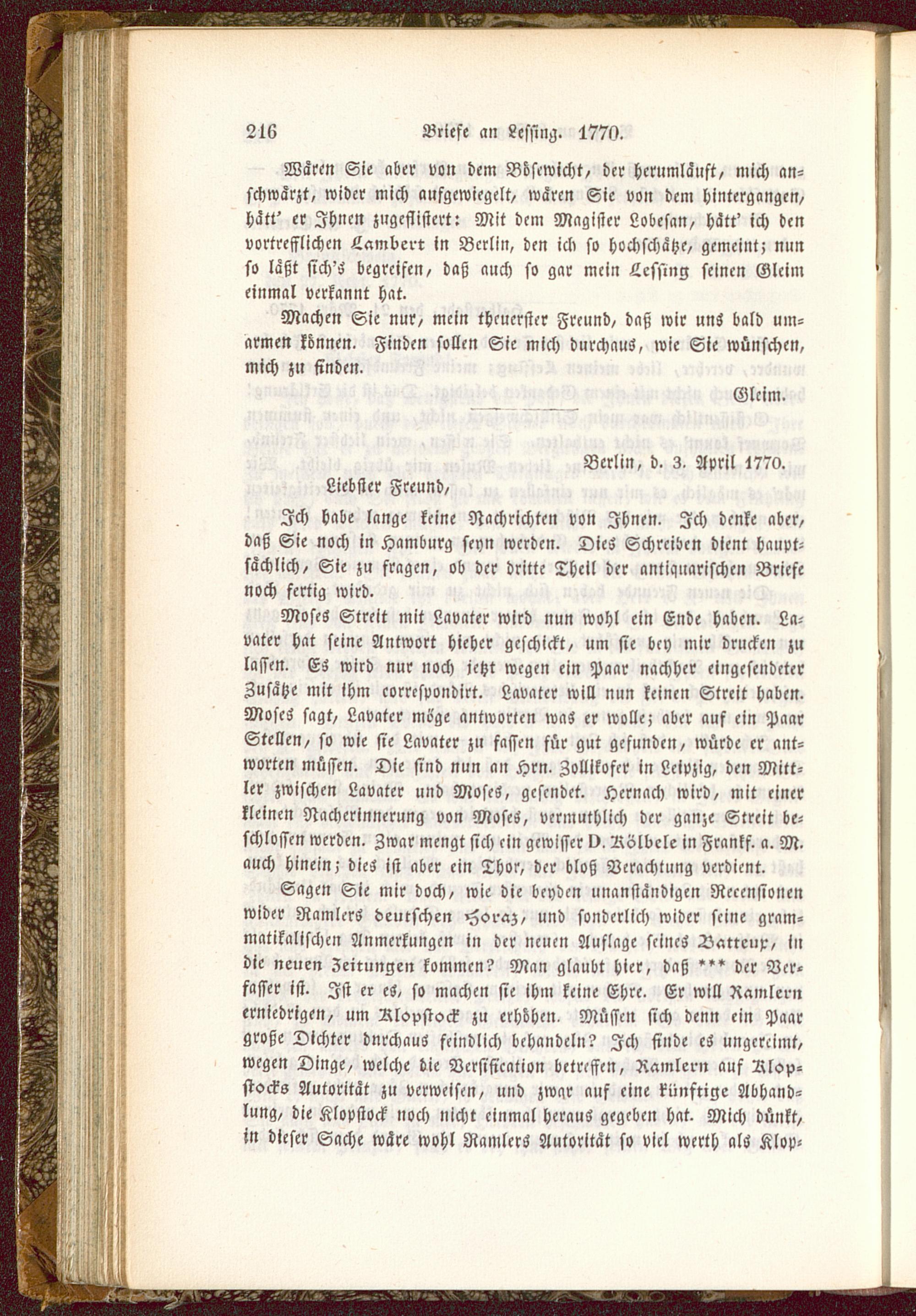Sagen Sie mir doch, wie die beyden unanständigen Recensionenwider RamlerS deutschen Horaz, und sonderlich wider seine gram-matikalischen Anmerkungen in der neuen Auflage scincs Ratteux, indie neuen Zeitungen kommen? Man glaubt hier, daß der Ver-fasser ist. Ist er es, so machen sie ihm keine Ehre. Er will Rainlernerniedrigen, um Rlopstock zu erhöhen. Müssen sich denn ein Paargroße Dichter durchaus feindlich behandeln? Ich finde cS ungereimt,wegen Dinge, welche die Vcrsification betreffen, Ramlern auf Alop-ftocks Autorität zu verweisen, und zwar auf eine künftige Abhand-lung, die Klopstock noch nicht einmal heraus gegeben hat. Mich dünkt,in dieser Sache wäre wohl RamlerS Autorität so viel werth als Klop-