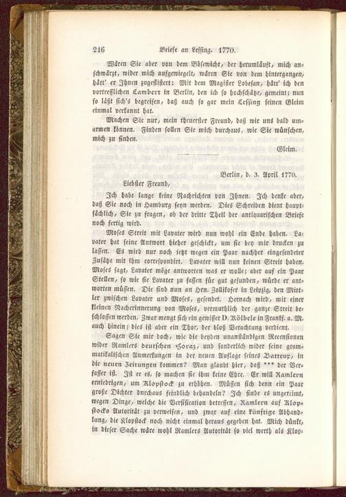 MoseS Streit mit Lavater wird nun wohl ein Ende haben. La-vatcr hat seine Antwort Hieher geschickt, um sie bey mir drucken zulassen. Es wird nur noch jetzt wegen ein Paar nachher eingesendeterZusätze mit ihm corrcspondirt. Lavater will nun keinen Streit haben.Moses sagt, Lavater möge antworten was er wolle; aber auf ein PaarStellen, so wie sie Lavater zu fasse» für gut gefunden, würde er ant-worten müssen. Die sind nun an Hrn. Zollikofcr in Leipzig , den Mitt-ler zwischen Lavater und MoseS , gesendet. Hernach wird, mit einerkleinen Nacherinnerung von MoseS , vermuthlich der ganze Streit be-schlossen werden. Zwar mengt sich ein gewisser l), Rölbcle in Franks, a. M.auch hinein; dies ist aber ein Thor, der bloß Verachtung verdient.