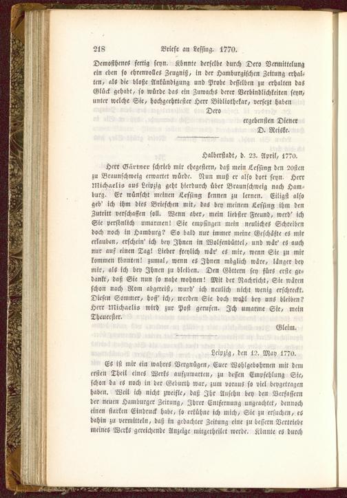 Herr Gärtner schrieb mir chegcstcrn, daß mein Lessing den ?ostenzu Braunschweig erwartet würde. Nun muß er also dort seyn, HerrMichaelis aus Leipzig geht hierdurch über Braunschwcig nach Ham-burg . Er wünscht meinen Lessing kennen zu lernen. Eiligst alsogeb' ich ihm dies Bricfchen mit, das bey meinem Lessing ihm denZutritt verschaffen soll. Wenn aber, mein liebster Freund, werd' ichSie persönlich umarmen! Sie empfinge» mein neulicheS Schreibendoch noch in Hamburg ? So bald nur immer meine Geschäfte cS mirerlauben, erschein' ich bey Ihnen in Wolfcnbüttcl, und wär' es auchnur auf einen Tag! Lieber freylich wär' es mir, wenn Sie zu mirkommen könnten! zumal, wenn cS Ihnen möglich wäre, länger beymir, als ich bey Ihnen zu bleiben. Den Göttern sey fürs erste ge-dankt, daß Sie nun so nahe wohnen! Mit der Nachricht, Sie wärenschon nach Rom abgereist, würd' ich neulich nicht wenig erschreckt.Diesen Sommer, hoff' ich, werden Sie doch woHl bey uns bleiben?Herr Michaelis wird zur Post gerufen. Ich umarme Sie, meinTheuerster.