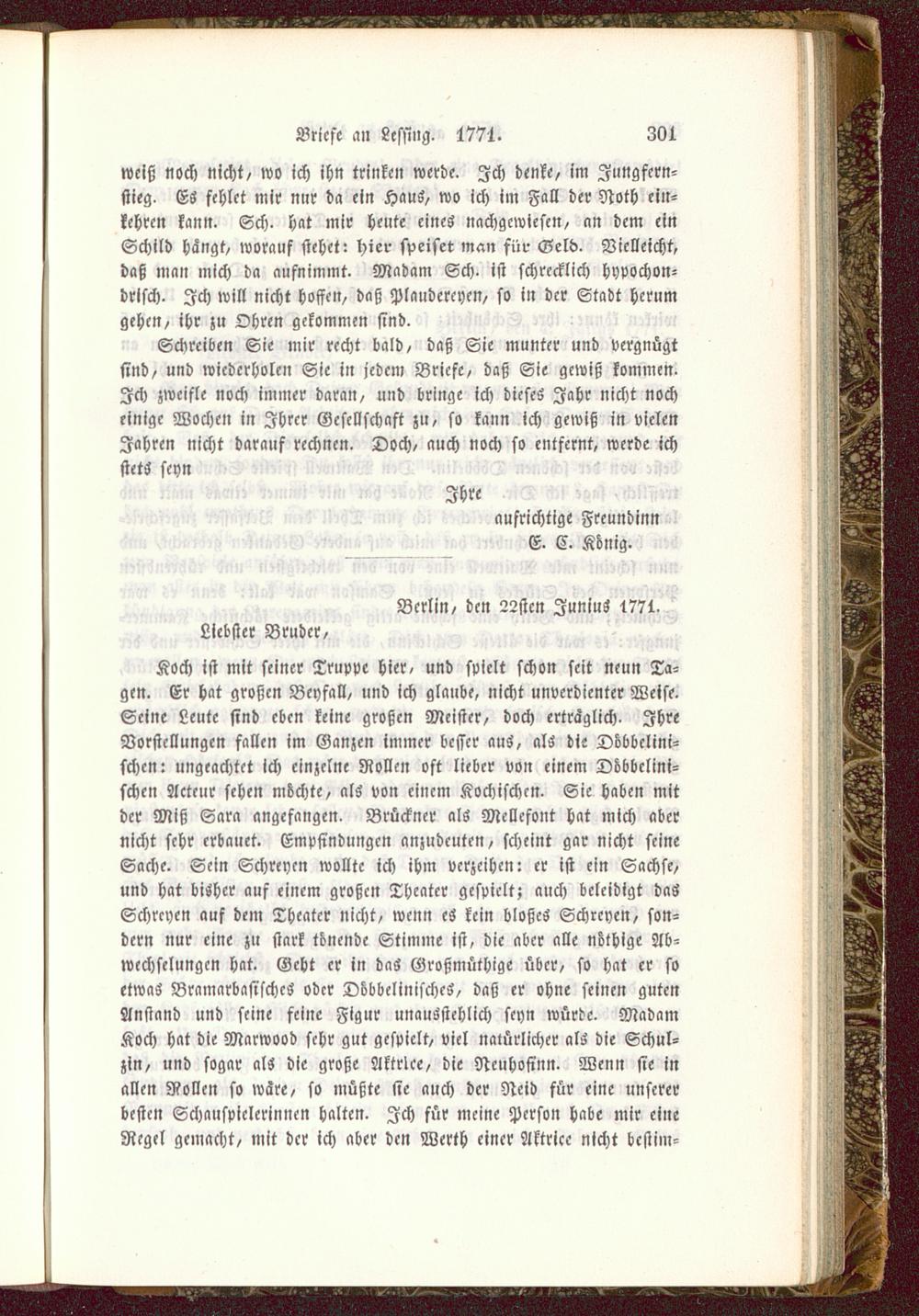 Koch ist mit seiner Truppe hier, und spielt schon seit neun Ta-gen. Er hat großen Beyfall, und ich glaube, nicht unverdienter Weise.Seine Leute sind eben keine großen Meister, doch erträglich. IhreVorstellungen fallen im Ganzen immer besser aus, als die Döbbclini-schcn: ungeachtet ich einzelne Rollen oft lieber von einem Döbbclini-schcn Acteur sehen möchte, als von einem Kochischcn. Sie haben mitder Miß Sara angefangen. Brückner als Mellefont hat mich abernicht sehr erbauet. Empfindungen anzudeuten, scheint gar nicht seineSache. Sein Schreyen wollte ich ihm verzeihen: er ist ein Sachse,und hat bisher auf einem großen Theater gespielt; auch beleidigt dasSchreyen auf dem Theater nicht, wenn cS kein bloßes Schreyen, son-dern nur eine zu stark tönende Stimme ist, die aber alle nöthige Ab-wechselungen hat. Geht er in das Großmüthige über, so hat er soetwas BramarbasischcS oder Döbbelinisches, daß er ohne seinen gutenAnstand und seine feine Figur unausstehlich seyn würde. MadamKoch hat die Marwood sehr gut gespielt, viel natürlicher als die Schul-zin, und sogar als die große Aktrice, die Neuhofinn. Wenn sie inallen Rollen so wäre, so müßte sie auch der Neid für eine unsererbesten Schauspielerinnen halten. Ich für meine Person habe mir eineRegel gemacht, mit der ich aber den Werth einer Aktrice nicht bcstim-