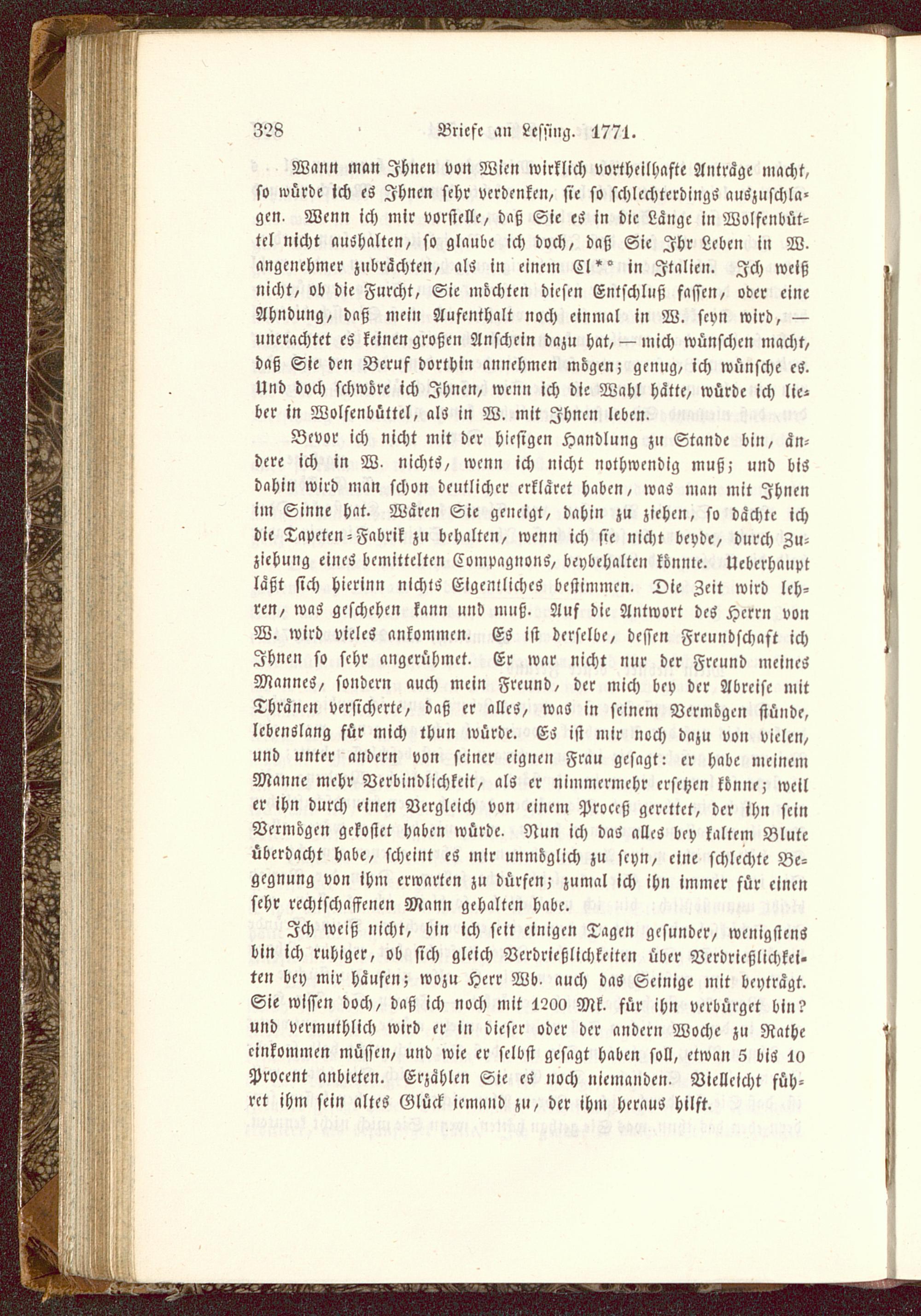 Bevor ich nicht mit der hiesigen Handlung zu Stande bin, än-dere ich in W- nichts, wenn ich nicht nothwendig muß; und bisdahin wird man schon deutlicher erkläret haben, was man mit Ihnenim Sinne hat. Wären Sie geneigt, dahin zu ziehen, so dächte ichdie Tapeten-Fabrik zu behalten, wenn ich sie nicht beyde, durch Zu-ziehung eines bemittelten Compagnons, beybehalten könnle. Ucberhanptläßt sich hicrinn nichts EigenilichcS bestimmen. Die Zeit wird leh-ren, was geschehen kann nnd muß. Auf die Antwort dcS Herrn vonW. wird vieles ankommen, ES ist derselbe, dessen Freundschaft ichIhnen so sehr angerühmct. Er war nicht nur der Freund meinesMannes, sondern auch mein Freund, der mich bey der Abreise mitThränen versicherte, daß er alles, was in seinem Vermögen stünde,lebenslang für mich thun würde. ES ist mir noch dazu von vielen,und unter andern von seiner eignen Frau gesagt: er habe meinemManne mehr Verbindlichkeit, als er nimmermehr ersehen könne, weiler ihn durch einen Vergleich von einem Proceß gerettet, der ihn seinVermögen gekostet haben würde. Nun ich das alles bey kaltem Bluteüberdacht habe, scheint es inir unmöglich zu seyn, eine schlechte Be-gegnung von ihm erwarten zu dürfen; zumal ich ihn immer für einensehr rechtschaffenen Mann gehalten habe.