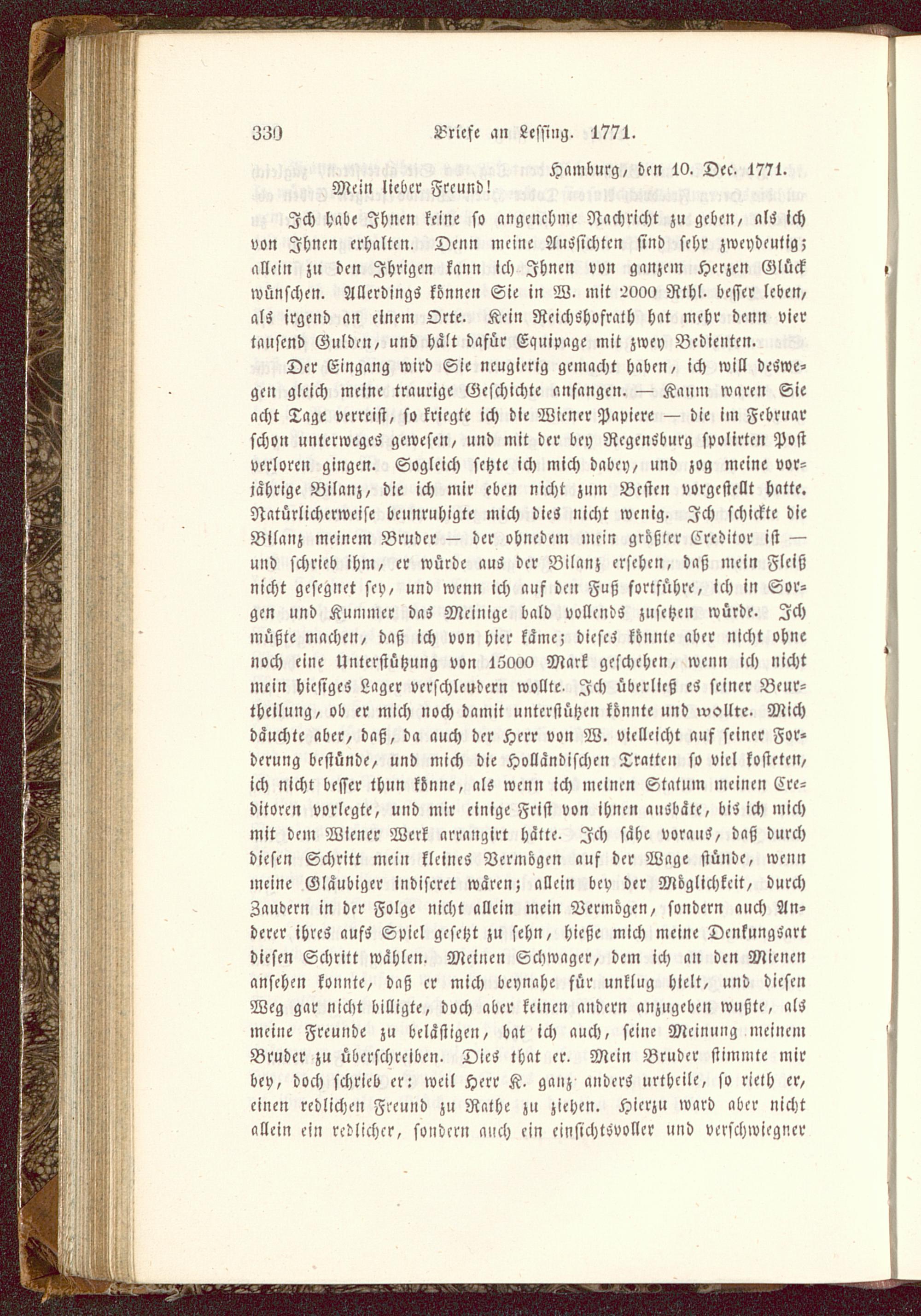 Der Eingang wird Sie neugierig gemacht haben, ich will deswe-gen gleich meine traurige Geschichte anfangen. — Kaum waren Sieacht Tage verreist, so kriegte ich die Wiener Papiere — die im Februarschon unterwegeS gewesen, und mit der bey RcgcnSburg spolirtcn Postverloren gingen. Sogleich setzte ich mich dabey, und zog meine vor-jährige Bilanz, die ich mir eben nicht zum Besten vorgestellt hatte.Natürlicherweise beunruhigte mich dies nicht wenig. Ich schickte dieBilanz meinem Bruder — der ohnedem mein größter Crcditor ist —und schrieb ihm, er würde aus der Bilanz ersehen, daß mein Fleißnicht gesegnet sey, und wenn ich auf den Fuß fortführe, ich in Sor-gen und Kummer daS Meinige bald vollends zusetzen würde. Ichmüßte machen, daß ich von hier käme; dieses könnte aber nicht ohnenoch eine Unterstützung von lüooo Mark geschehen, wenn ich nichtmein hiesiges Lager verschleudern wollte. Ich überließ cS seiner Beur-theilung, ob er mich noch damit unterstützen könnte und wollte. Michdäuchtc aber/ daß, da auch der Herr von W. vielleicht auf seiner For-derung bestünde, und mich die Holländischen Tratten so viel kosteten,ich nicht besser thun könne, als wenn ich meinen Statum meinen Crc-ditoren vorlegte, und mir cinige Frist von ihnen ausbäte, bis ich michmit dem Wiener Werk arrangirt hätte- Ich sähe voraus, daß durchdiesen Schritt mein kleines Vermögen auf der Wage stünde, wennmeine Gläubiger indiscret waren; allein bey der Möglichkeit, durchZaudern in der Folge nicht allein mein Vermögen, sondern auch An-derer ihres aufs Spiel gesetzt zu sehn, hieße mich meine Dcnkungsartdiesen Schritt wählen. Meinen Schwager, dem ich an den Mienenansehen konnte, daß cr mich beynahe für unklug hielt, und diesenWeg gar nicht billigte, doch aber keinen andern anzugeben wußte, alsmeine Freunde zu belästigen, bat ich auch, seine Meinung meinemBruder zu überschreiben. Dies that er. Mein Bruder stimmte mirbey, doch schrieb cr: weil Herr K- ganz anders urtheile, so rielh er,einen redlichen Freund zu Rathe zu ziehen. Hierzu ward aber nichtallein ein redlicher, sondern auch ein einsichtsvoller und verschwiegner