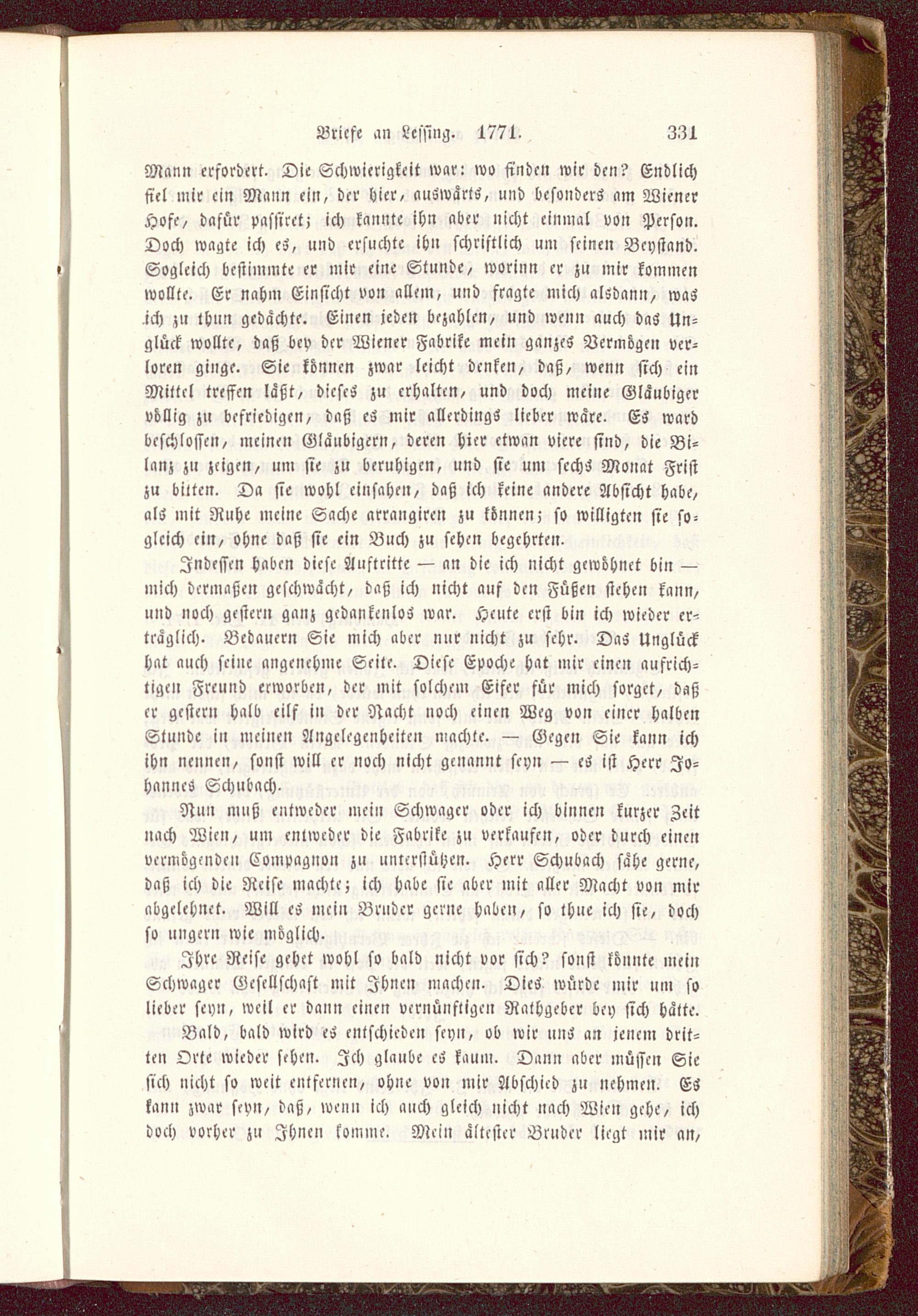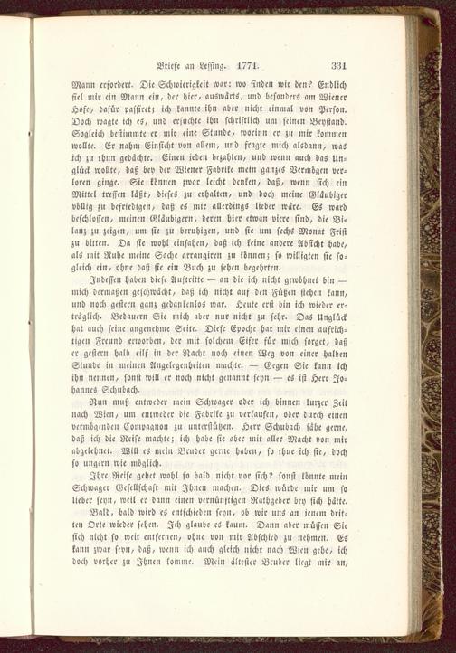 Nun muß entweder mein Schwager oder ich binnen kurzer Zeitnach Wien , um entweder die Fabrike zu verkaufen, oder durch einenvermögenden Compagnon zu uimrstützen. Herr Schubach sähe gerne,daß ich die Reise machte; ich habe sie aber mit aller Macht von mirabgelehnet. Will es mein Bruder gerne haben, so thue ich sie, dochso ungern wie möglich.