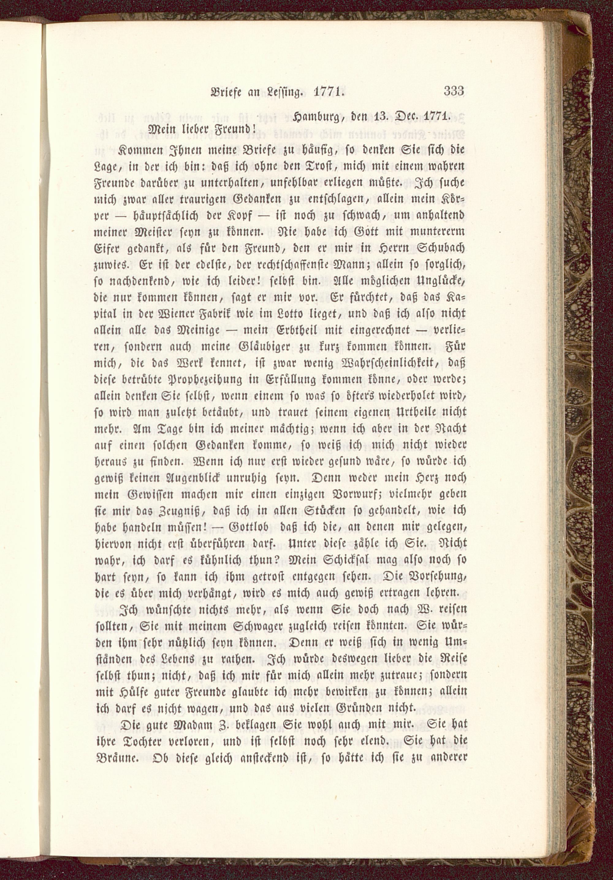 Kommen Ihnen meine Briefe zu häufig, so denken Sie sich dieLage, in der ich bin: daß ich ohne den Trost, mich mit einem wahrenFreunde darüber zu unterhalten, unfehlbar erliegen müßte. Ich suchemich zwar aller traurigen Gedanken zu einschlagen, allein mein Kör-per — häuptsächlich der Kopf — ist noch zu schwach, um anhaltendmeiner Meister seyn zu können. Nie habe ich Gott mit munterermEifer gedankt, als für den Freund, den er mir in Herrn Schubachzuwies. Er ist der edelste, der rechtschaffenste Mann; allein so sorglich,so nachdenkend, wie ich leider! selbst bin. Alle möglichen Unglücke,die nur kommen können, sagt er mir vor. Er fürchtet, daß das Ka-pital in der Wiener Fabrik wie im Lotto lieget, und daß ich also nichtallein alle das Mcinige — mein Erbtheil mit eingerechnet — verlie-ren, sondern auch meine Glaubiger zu kurz kommen können. Fürmich, die das Werk kennet, ist zwar wenig Wahrscheinlichkeit, daßdiese betrübte Prophezeihung in Erfüllung kommen könne, oder werde,allein denken Sie selbst, wenn einem so was so öfters wiederholet wird,so wird man zuletzt betäubt, und trauet seinem eigenen Urtheile nichtmehr. Am Tage bin ich meiner mächtig; wenn ich aber in der Nachtauf einen solchen Gedanken komme, so weiß ich mich nicht wiederheraus zu finden. Wenn ich nur erst wieder gesund wäre, so würde ichgewiß keinen Augenblick unruhig scvn. Denn weder mein Herz nochmein Gewissen machen mir einen einzigen Vorwurf; vielmehr gebensie mir das Zeugniß, daß ich in allen Stücken so gehandelt, wie ichhabe handeln müssen! — Gottlob daß ich die, an denen mir gelegen,hiervon nicht erst überführen darf. Unter diese zähle ich Sie. Nichtwahr, ich darf es kühnlich thun? Mein Schicksal mag also noch sohart seyn, so kann ich ihm getrost entgegen sehen. Die Vorsehung,die es über mich verhängt, wird eS mich auch gewiß ertragen lehren.