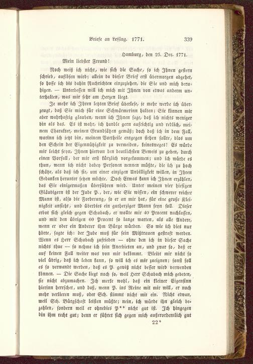 Je mehr ich Ihren letzten Brief überlese, je mehr werde ich über-zeugt, daß Sie mich für eine Schwärmerinn halten; Sie können miraber wahrhaftig glauben, wenn ich Ihnen sage, daß ich nichts wenigerbin als das. ES ist wahr, ich handle gern aufrichtig und redlich, mei-nem Charakter, meinen Grundsätzen gemäß; doch daß ich in dem Fall,worinn ich jetzt bin, meinem Vortheile entgegen stehen sollte, blos umden Schein der Eigennützigkeit zu vermeiden, keineSweacS! ES würdemir leicht seyn, Ihnen hiervon den deutlichsten Beweis zu geben, durcheinen Vorfall, der mir erst kürzlich vorgekommen; und ich würde cSthun, wenn ich nicht dabey Personen nennen müßte, die ich zu hochschätze, als daß ich sie, um einer einzigen Unbilligkeit willen, in IhrenGedanken herunter setzen möchte. Doch Etwas kann ich Ihnen erzählen,das Sie einigermaßen überführen wird. Unter meinen vier hiesigenGläubigern ist der Jude P., der, wie Sie wissen, ein schwerer reicherMann ist, also die Forderung, so er an mir hat, für eine große Klei-nigkeit ansieht, und überdies ein gutherziger Mann seyn soll. Diesererbot sich gleich gegen Schubach, er wollte mir -to Procent nachlassen,und mit den übrigen 60 Procent so lange warten, als alle Andere,wenn er oder ein Anderer ihm Bürge würden. So wie ich dicS nurhörte, sagte ich: der Jude muß für sein Mißtrauen gestraft werden.Wenn cS Herr Schubach zufrieden — ohne den ich in dieser Sachenichts thue — so nehme ich sein Anerbieten an, und zwar so, daß erauf keinen Fall weiter was von mir bekömmt. Bleibt mir nicht soviel übrig, daß ich leben kann, so will ick) cS mir zueignen; sonst sollcS so verwandt werden, daß es P, gewiß nicht besser wird verwendenkönnen. — Die Sache liegt noch so, weil Herr Schubach mich gebeten,sie nicht abzumachen. Ich merke wohl, daß ein kleiner Eigensinnhierinn herrschet, und daß, wenn P. ins Reine mit mir will, er nochmehr verlieren muß, oder Sch. stimmt nicht mit ein. Nicht ctwan,weil Sch- Bürgschaft leisten müßte; nein, ich würde ihn gleich be-zahlen, sondern weil er ohnedies P" nicht gut ist. Ich hingegenbin ihm recht gut; denn er führet sich gegen mich außerordentlich gut