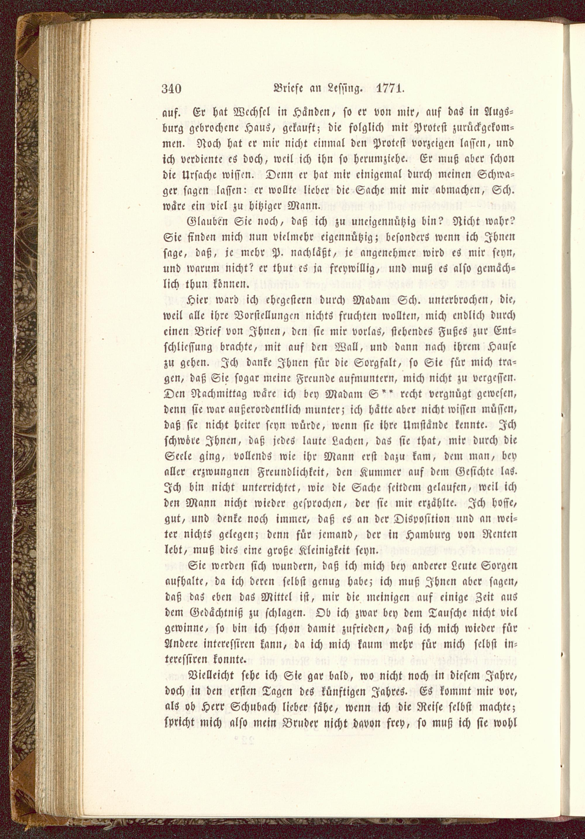 Hier ward ich chcgcstern durch Madam Sch. unterbrochen, die,weil alle ihre Vorstellungen nichts fruchten wollten, mich endlich dnrcheinen Brief von Ihnen, den sie mir vorlas, stehendes Fußes zur Ent-schließung brachte, mit auf den Wall, und dann nach ihrem Hausezu gehen. Ich danke Ihnen für die Sorgfalt, so Sie für mich tra-gen, daß Sie sogar meine Freunde aufmuntern, mich nicht zu vergessen.Den Nachmittag wäre ich bey Madam S" recht vergnügt gewesen,denn sie war außerordentlich munter, ich hätte aber Nichtwissen müssen,daß sie nicht heiter seyn würde, wenn sie ihre Umstände kennte. Ichschwöre Ihnen, daß jedes laute Lache», das sie that, mir durch dieSeele ging, vollends wie ihr Mann erst dazu kam, dem mau, beyaller crzwungncn Freundlichkeit, den Kummer auf dem Gesichte las-Ich bin nicht unterrichtet, wie die Sache seitdem gelaufen, weil ichden Mann nicht wieder gesprochen, der sie mir erzählte. Ich hoffe,gut, und denke noch immer, daß es an der Disposition und an wei-ter nichts gelegen; denn für jemand, der in Hamburg von Rentenlebt, muß die» eine große Kleinigkeit seyn.