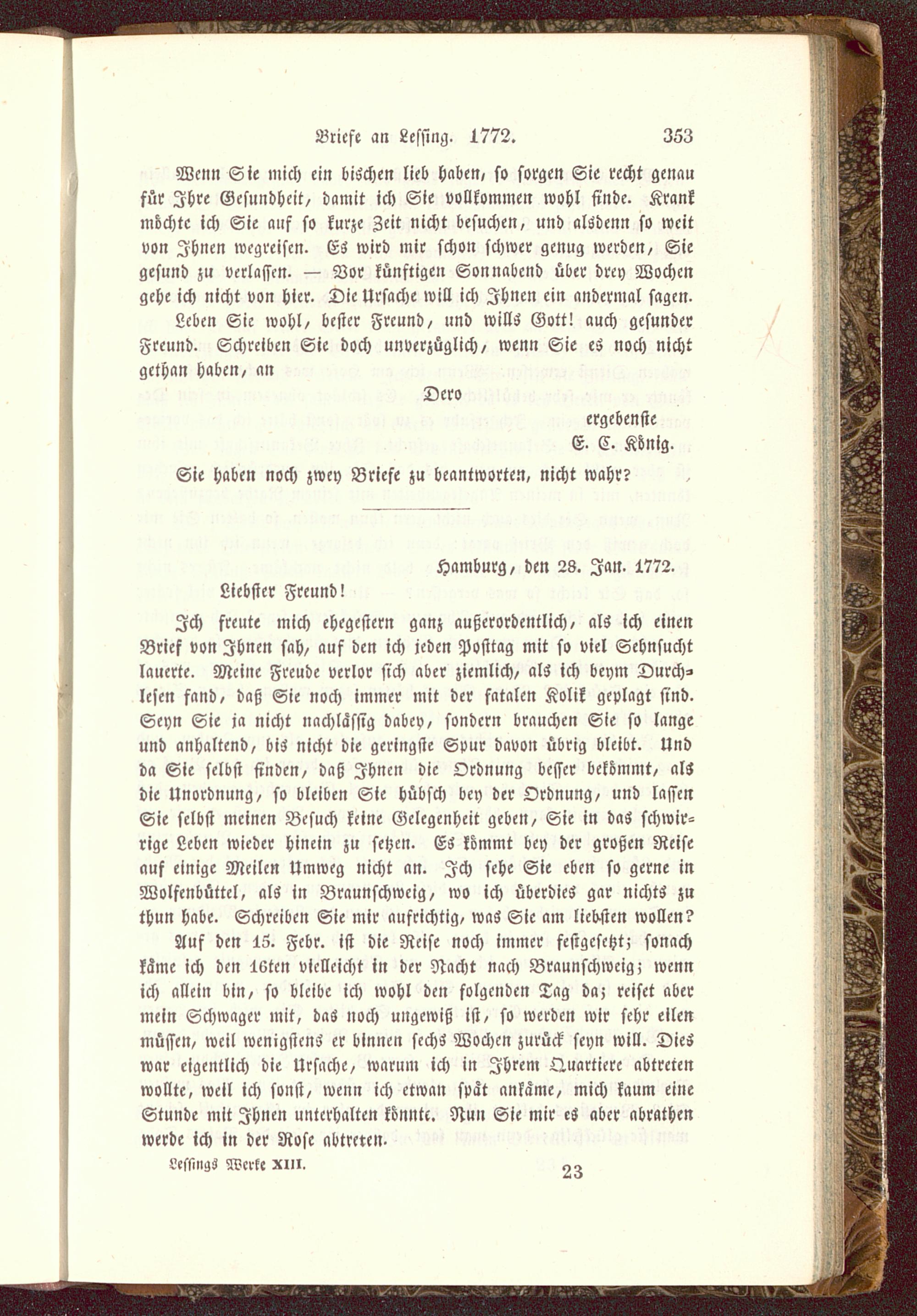 Ich freute mich chegestern ganz außerordentlich, als ich einenBrief von Ihnen sah, auf den ich jeden Posttag mit so viel Sehnsuchtlauerte. Meine Freude verlor sich aber ziemlich, als ich beym Durch-lesen fand, daß Sie noch immer mit der fatalen Kolik geplagt find.Seyn Sie ja nicht nachlässig dabey, sondern brauchen Sie so langeund anhaltend, bis nicht die geringste Spur davon übrig bleibt. Undda Sie selbst finden, daß Ihnen die Ordnung besser bekömmt, alsdie Unordnung, so bleiben Sie hübsch bey der Ordnung, und lassenSie selbst meinen Besuch keine Gelegenheit geben, Sie in das schwir-rige Leben wieder hinein zu setzen. ES kömmt bey der großen Reiseauf einige Meilen Umweg nicht an. Ich sehe Sie eben so gerne inWolfenbüttel , als in Braunschwcig, wo ich überdies gar nichts zuthun habe. Schreiben Sie mir aufrichtig, was Sie am liebsten wollen?