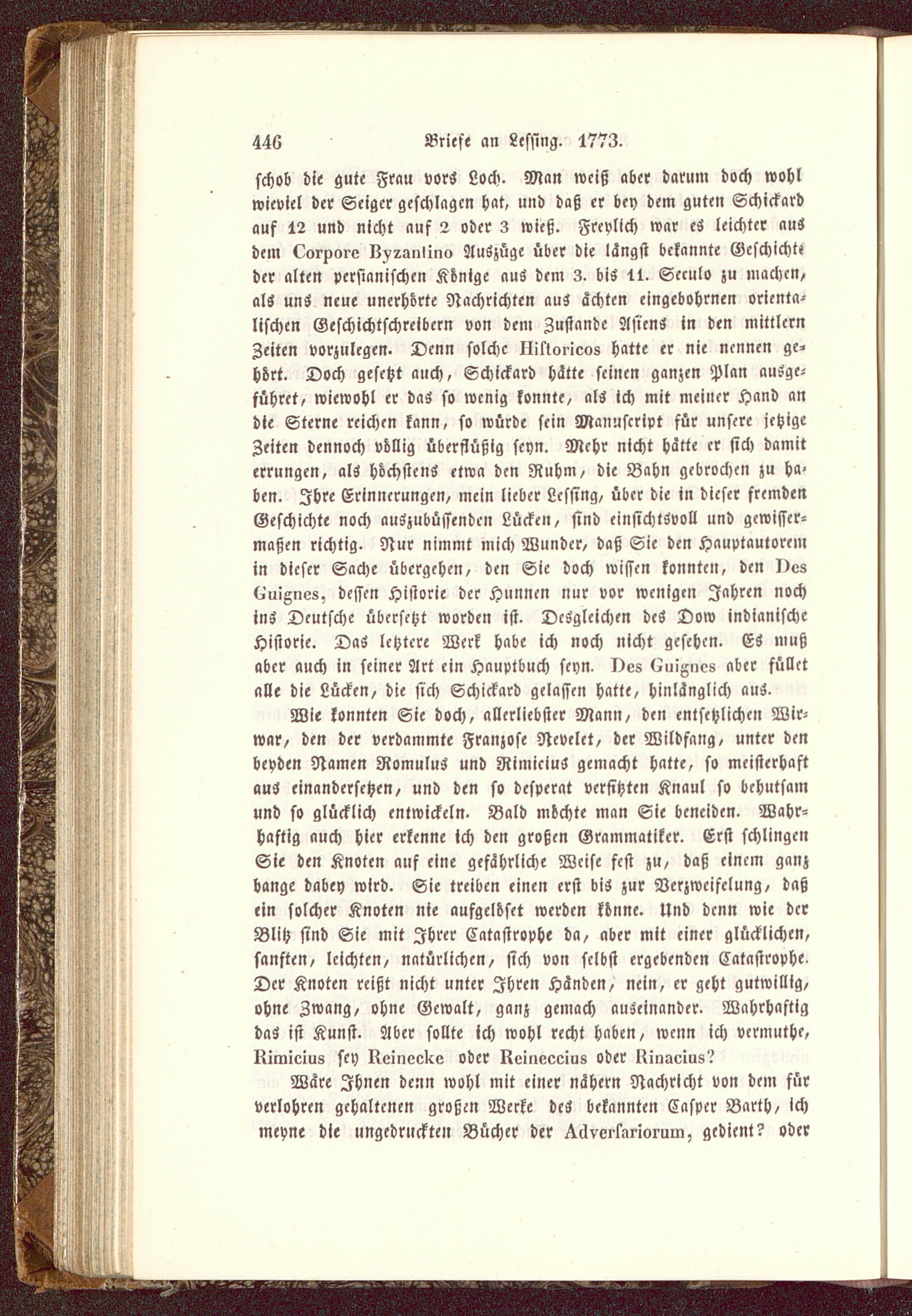 schob die gute Frau vors Loch. Man weiß aber darum doch wohlwieviel der Seiger geschlagen hat, und daß er bey dem guten Schickardauf 12 und nicht auf 2 oder 3 wieß. Freylich war es leichter ausdem Corpore L^rsnlino AuSjüge über die längst bekannte Geschichteder alten pcrsianischen Könige aus dem 3. bis 11. Seculo zu machen,als uns neue unerhörte Nachrichten aus ächten eingcbohrnen orienta-lischen Geschichtschreibern von dem Zustande Asiens in den mittlernZeiten vorzulegen. Denn solche IMtoi-ievs hatte er nie nennen ge-hört. Doch gesetzt auch, Schickard hätt- seinen ganzen Plan ausge-führet, wiewohl er das so wenig konnte, als ich mit meiner Hand andie Sterne reichen kann, so würde sein Manuscript für unsere jetzigeZeiten dennoch völlig überflüßig seyn. Mehr nicht hätte er sich damiterrungen, als höchstens etwa den Ruhm, die Bahn gebrochen zu ha-ben. Ihre Erinnerungen, mein lieber Lcsstng, über die in dieser fremdenGeschichte noch auSzubüssendcn Lücken, sind einsichtsvoll und gewisser-maßen richtig. Nur nimmt mich Wunder, daß Sie den Hauptautoremin dieser Sache übergehen, den Sie doch wissen konnten, den liesKulgnes, dessen Historie der Hunnen nur vor wenigen Jahren nochinS Deutsche übersetzt worden ist. Desgleichen deS Dow indianischeHistorie. Das letztere Werk habe ich noch nicht gesehen. Es mußaber auch in seiner Art ein Hauptbuch seyn. Des (Eignes aber fülletalle die Lücken, die sich Schickard gelassen hatte, hinlänglich aus.