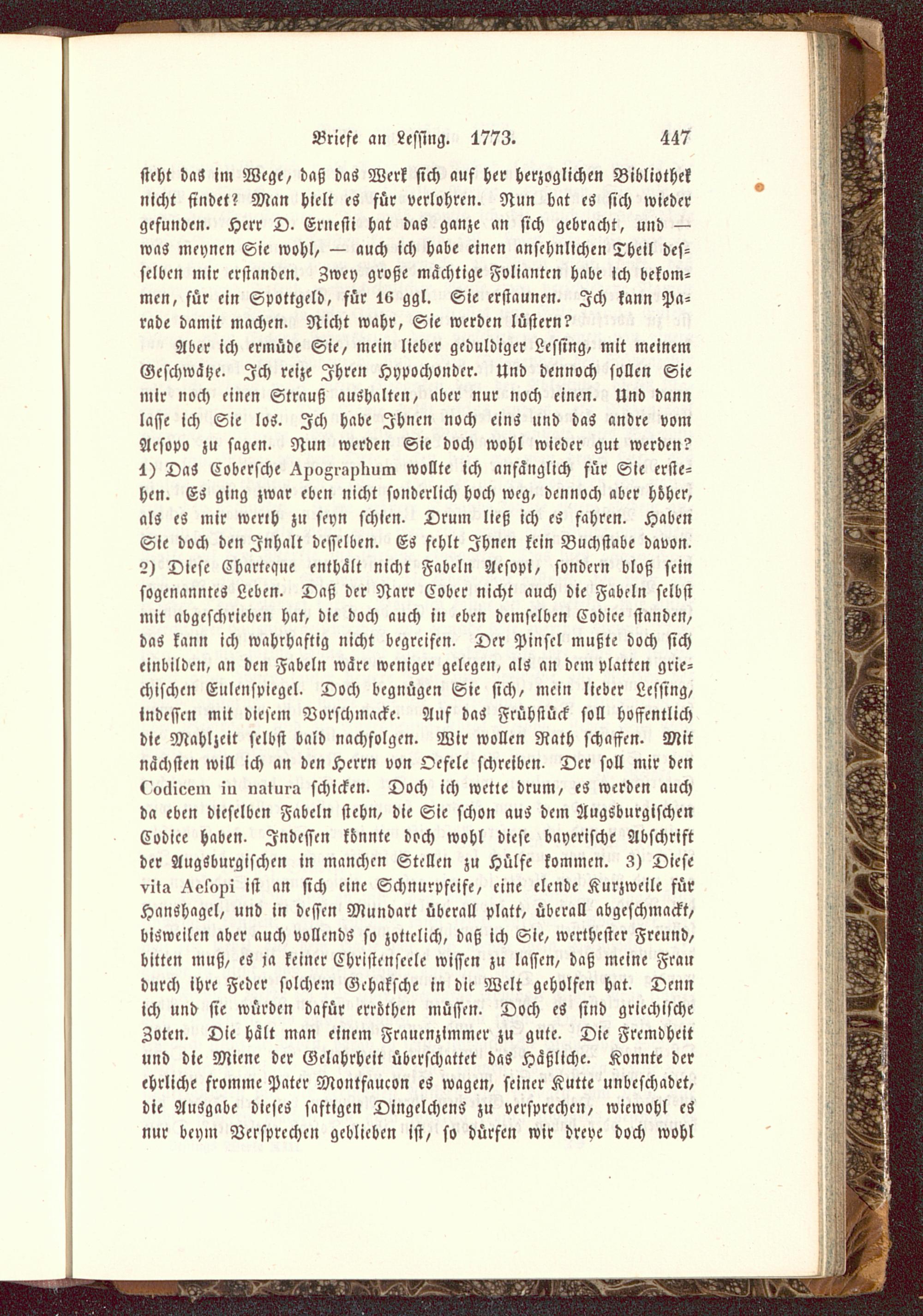 2) Diese Chartcaue enthält nicht Fabeln Acsopi, sondern bloß seinsogenanntes Leben. Daß der Narr Cover nicht auch die Fabeln selbstmit abgeschrieben hat, die doch auch in eben demselben Codice standen,daS kann ich wahrhaftig nicht begreifen. Der Pinsel mußte doch sicheinbilden, an den Fabeln wäre weniger gelegen, als an dem platten grie-chischen Eulcnspicgel. Doch begnügen Sie sich, mein lieber Lessing ,indessen mit diesem Vorschmacke, Auf daS Frühstück soll hoffentlichdie Mahlzeit selbst bald nachfolgen. Wir wollen Rath schaffen. Mitnächsten will ich an den Herrn von Oefelc schreiben. Der soll mir dent^oclioein !» natura schicken. Doch ich wette drum, es werden auchda eben dieselben Fabeln stehn, die Sie schon aus dem AugSburgischcnCodice haben. Indessen könnte doch wohl diese bayerische Abschriftder AugSburgischcn in manchen Stellen zu Hülfe kommen. Z) Diesevila ^elopi ist an sich eine Schnurpfeife, eine elende Kurzweile fürHanshagel, und in dessen Mundart überall platt, überall abgeschmackt,bisweilen aber auch vollends so zoticlich, daß ich Sie, werthester Freund,bitten muß, eS ja keiner Christenscele wissen zu lassen, daß meine Fraudurch ihre Feder solchem Gchaksche in die Welt geholfen hat. Dennich und sie würden dafür errötyen müssen. Doch es sind griechischeZoten. Die hält man einem Frauenzimmer zu gute. Die Fremdheitund die Miene der Gelahrheit überschattet da§ Häßliche. Konnte derehrliche fromme Pater Montfaucon cS wagen, seiner Kutte unbeschadet,die Ausgabe dieses saftigen Dingelchens zu versprechen, wiewohl cSnur beym Versprechen geblieben ist, so dürfen wir dreve doch wohl