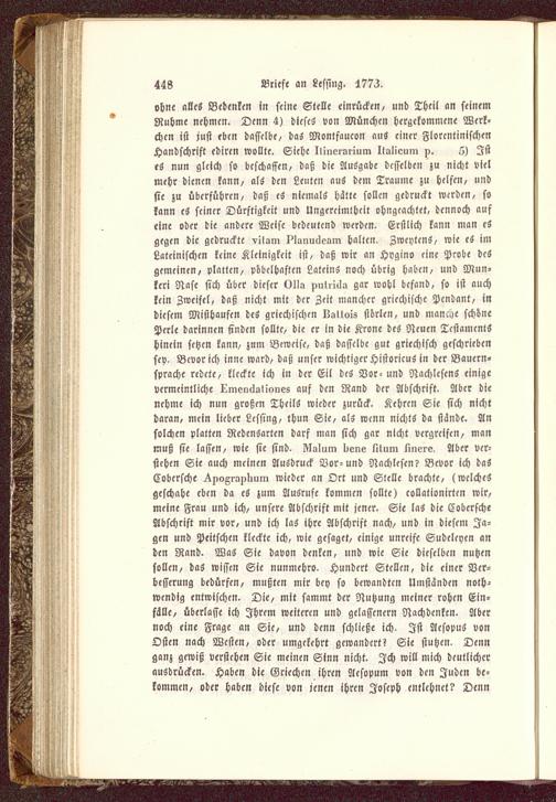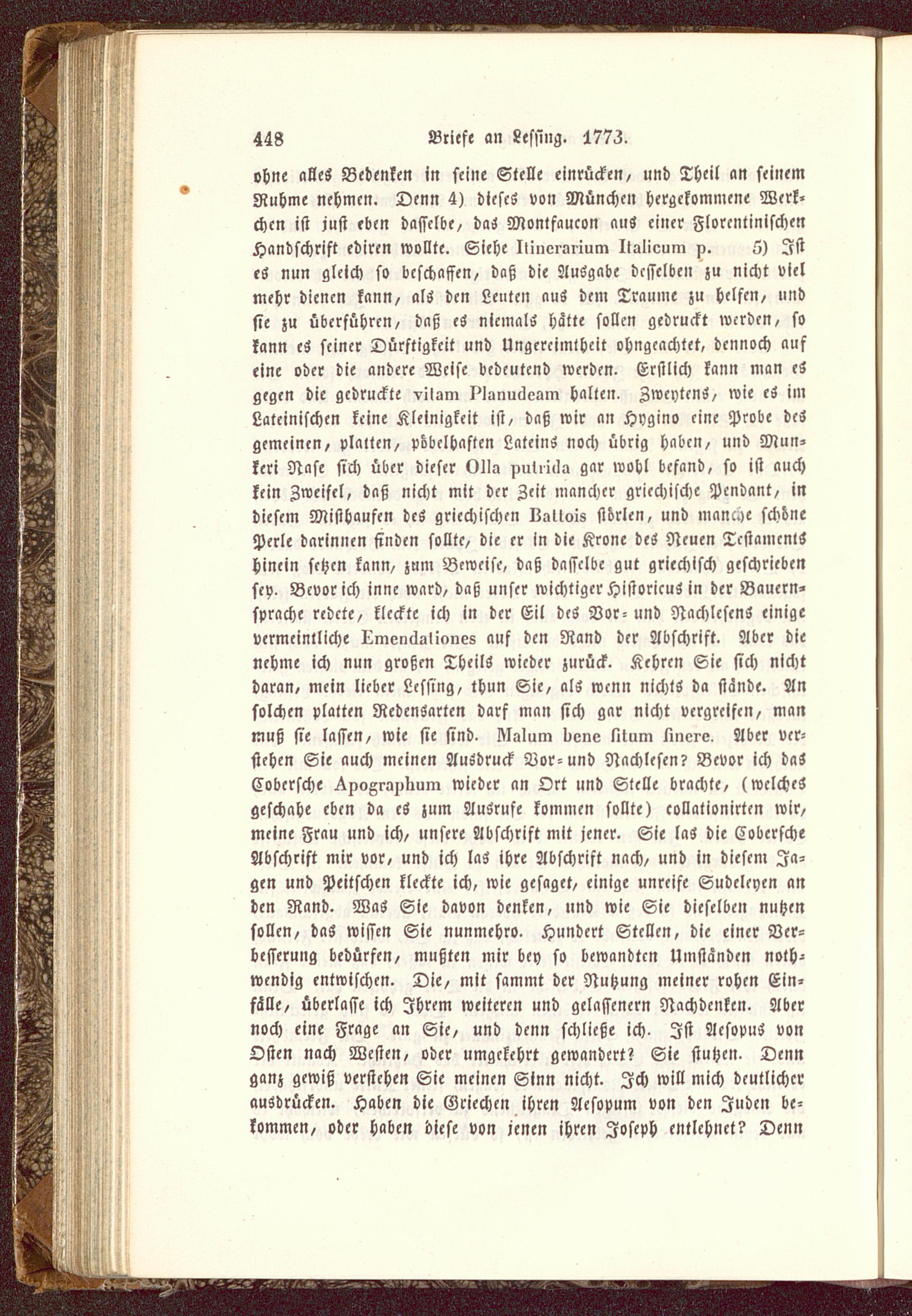 ohne alles Bedenken in seine Stelle einrücken, und Theil an seinemRuhme nehmen. Denn 4) dieses von München hergekommen« Werk-chcn ist just eben dasselbe/ das Monifaucon aus einer FlorcntinischenHandschrist ediren wollte. Siehe Itiuerarium Italioum p. 5) IsteS nun gleich so beschaffen, daß die Ausgabe desselben zu nicht vielmehr dienen kann, als den Leuten aus dem Traume zu helfen, undsie zu überführen, daß eS niemals hätte sollen gedruckt werden, sokann es seiner Dürftigkeit und Ungereimtheit ohngeachtet, dennoch aufeine oder die andere Weise bedeutend werden. Erstlich kann man eSgegen die gedruckte vil-im ?Ianucleam halte». Zwcytcns, wie eS imLateinischen keine Kleinigkeit ist, daß wir an Hygino eine Probe deSgemeinen, platten, pöbelhaften Lateins noch übrig haben, und Mun-keri Nase sich über dieser Olla puilüla gar wohl befand, so ist auchkein Zweifel, daß nicht mit der Zeit mancher griechische Pendant, indiesem Misthaufen des griechischen L->lloi8 störlen, und manc.,e schönePerle darinnen finden sollte, die er in die Krone deS Neuen Testamentshinein setzen kann, zum Beweise, daß dasselbe gut griechisch geschriebensey. Bevor ich inne ward, daß unser wichtiger HistoricuS in der Baucrn-sprache redete, klcckte ich in der Eil des Vor- und NachlcsenS einigevermeintliche KmenäglinneZ auf den Rand der Abschrift. Aber dienehme ich nun großen Theils wieder zurück. Kehren Sie sich nichtdaran, mein lieber Lessing , thun Sie, als wenn nichts da stände. Ansolchen platten Redensarten darf man sich gar nicht vergreifen, manmuß sie lassen, wie sie sind, ülalum lione litum kinero. Aber ver-siehe» Sie auch meinen Ausdruck Vor-und Nachlesen? Bevor ich dasCobersche ^poxrnplium wieder an Ort und Stelle brachte, (welchesgeschahe eben da eS zum Ausrufe kommen sollte) collationirten wir,meine Frau und ich, unsere Abschrift mit jener. Sie las die CoberscheAbschrift mir vor, und ich las ihre Abschrift nach, und in diesem Ja-gen und Peitschen kleckte ich, wie gcsaget, einige unreife Sudeleyen anden Rand. Was Sie davon denken, »nd wie Sie dieselben nutzensollen, das wissen Sie nunmehr». Hundert Stellen, die einer Ver-besserung bedürfen, mußten mir bey so bewandtcn Umständen noth-wendig entwischen. Die, mit sammt der Nutzung meiner rohen Ein-fälle, überlasse ich Ihrem weiteren und gelassenem Nachdenken. Abernoch eine Frage an Sie, und denn schließe ich. Ist AesopuS vonOsten nach Westen, oder umgekehrt gewandert? Sie stutzen. Dennganz gewiß verstehen Sie meinen Sinn nicht. Ich will mich deutlicherausdrücken. Haben die Griechen ihren Aesopum von den Juden be-kommen, oder haben diese von jenen ihren Joseph entlehnet? Denn