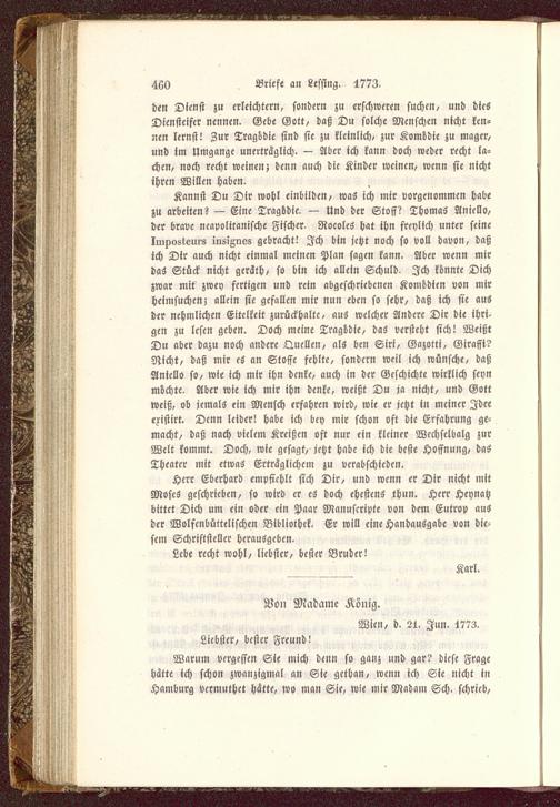 Kannst Du Dir wohl einbilden, was ich mir vorgenommen habezu arbeiten? — Eine Tragödie. — Und der Stoff? Thomas Aniello,der brave neapolitanische Fischer. Rocoles hat ihn freylich unter seineImpo8teui's iosiANL8 gebracht! Ich bin jetzt noch so voll davon, daßich Dir auch nicht einmal meinen Plan sagen kann. Aber wenn mirdas Stück nicht geräth/ so bin ich allein Schuld. Ich könnte Dichzwar mit zwey fertigen und rein abgeschriebenen Komödien von mirheimsuchen; allein sie gefallen mir nun eben so sehr, daß ich sie ausder nehmlichen Eitelkeit zurückhalte, aus welcher Andere Dir die ihri-gen zu lesen geben. Doch meine Tragödie, das versteht sich! WeißtDu aber dazu noch andere Quellen/ als den Siri/ Gazotti, Girafft?Nicht, daß mir cS an Stoffe fehlte, sondern weil ich wünsche, daßAniello so, wie ich mir ihn denke, auch in der Geschichte wirklich seynmöchte. Aber wie ich mir ihn denke, weißt Du ja nicht, und Gottweiß, ob jemals ein Mensch erfahren wird, wie er jetzt in meiner Ideecxistirt. Denn leider! habe ich bey mir schon oft die Erfahrung ge-macht, daß nach vielem Kreißen oft nur ein kleiner Wechselbalg zurWelt kommt. Doch, wie gesagt, jetzt habe ich die beste Hoffnung, dasTheater mit etwas Erträglichem zu verabschieden.