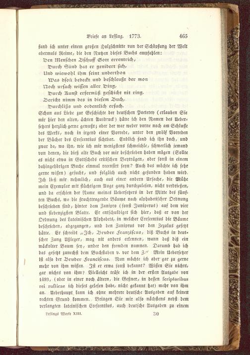 Durchlisis und ordentlich ersuch.Schon aus Liebe zur Geschichte der deutschen Poeterey (erlauben Siemir hier den alten, ächten Ausdruck) hätte ich den Namen des Ueber-sctzcrS herzlich gerne gewußt; aber der war weder vorne noch am Schlüssedes Werks, noch in irgend einer Vorrede, unter den zwölf Vorredender Bücher des CrescentiuS sichtbar. Endlich fand ich ihn doch, undzwar da, wo ihn, wie ich mir wenigstens schmeichle, schwerlich jemandvon denen, die dieß alte Buch vor mir beschrieben haben mögen (SollteeS nicht etwa in Gottscheds critischcn Beyträgen, oder sonst in einemdahingchörigcn Buche einmal recensirt seyn? Auch das möchte ich sehegerne wissen) gesucht, und folglich auch nicht gefunden haben wird.Ich ließ mir nehmlich, auch auS einer andern Ursache, die Mühemein Exemplar mit flüchtigem Auge ganz durchzulcsen, nicht verdrießen,und da erschien der Name meines UcbcrsctzerS in der Mitte des fünf-ten BuchS, wo die fruchttragende Bäume nach alphabetischer Ordnungbeschrieben sind, hinter dem Zanipro (sonst AuniperuS) auf dem vierund sicbcnzigsten Blatte. Er entschuldiget sich hier, daß er von derOrdnung des Lateinischen Alphabets, in welcher CrescentiuS die Bäumebeschrieben, abgegangen, und den ZanipruS vor den ZezuluS gesetzthätte. Er schreibt »Ich, Bruder Franziscuo, diß Buchs in deut-scher Zung Ußlcger, mag nit anders erkennen, wann daß diß einwäckolter Baum sey, under den fremden namnen. Darumb hab ichdaS gesetzt zuncchst dem Buchstaben v. vor dem Z>" Mein Ucbersetzcrist also der Bruder Franciscus. Nun möchte ich aber gar zu gernemehr von ihm wissen. Ist er etwa sonst bekannt? Wissen Sie nichts,gar nichts von ihm? Vielleicht träfe ich in der ersten Ausgabe von1493, (oder in einer noch ältern, die Gcßncr, in dessen seiiptoiiliusrei rutliL!»: ich dieses gelesen habe, nicht gekannt hat) mehr von ihman. Ucbcrhaupt kann ich ohne mehrere deutsche Ausgaben auf keinenrechten Grund komme». Bringen Sie mir also nächstens nebst demverlangten lateinischen CrescentiuS, auch deutsche Ausgaben zu einemL-ssings Werk- xm. Zy