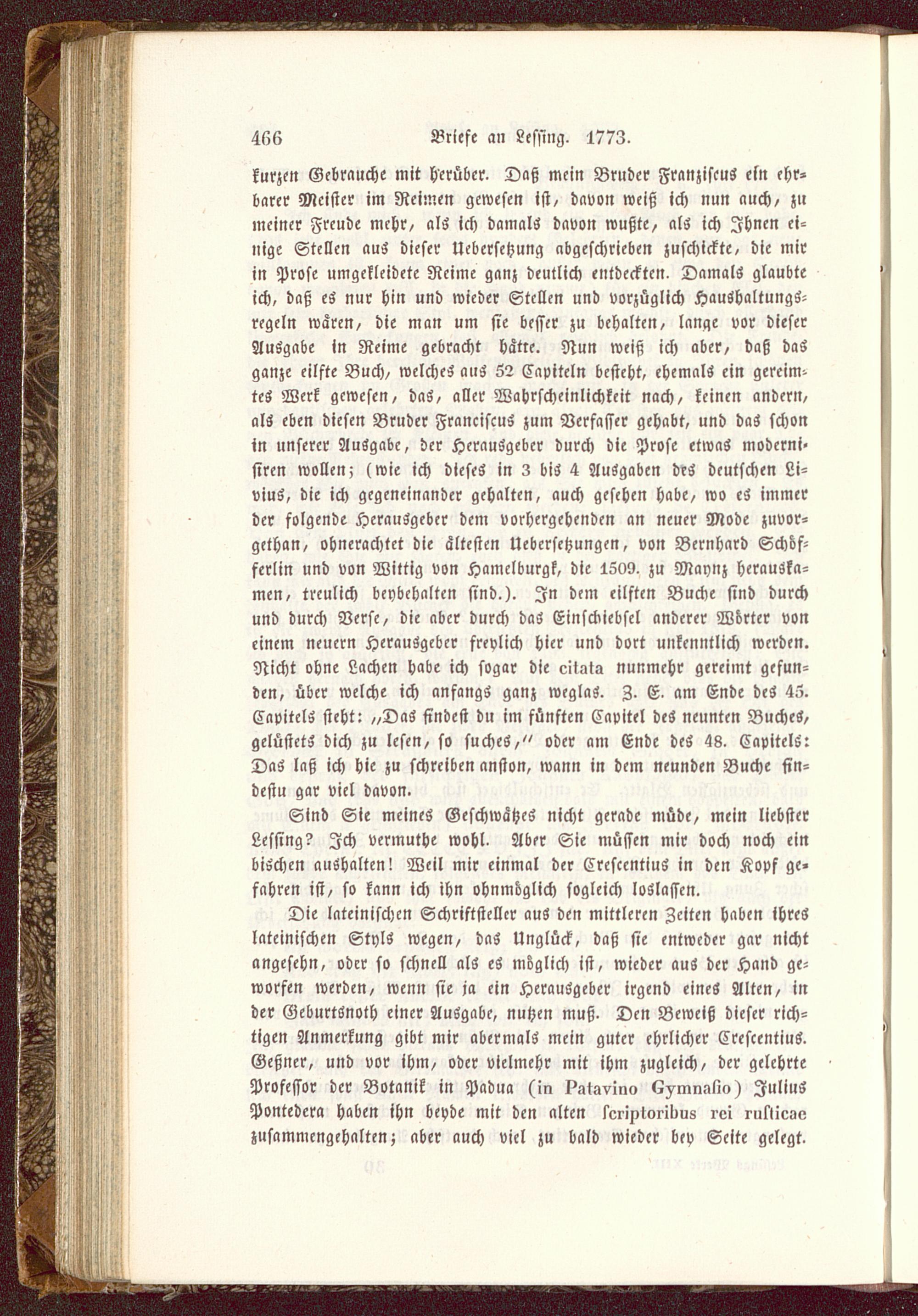 Sind Sie meines Geschwätzes nicht gerade müde, mein liebsterLessing? Ich vermuthe wohl. Aber Sie müssen mir doch noch einbischen aushalten! Weil mir einmal der CrescentiuS in den Kopf ge-fahren ist, so kann ich ihn ohnmöglich sogleich loslassen.