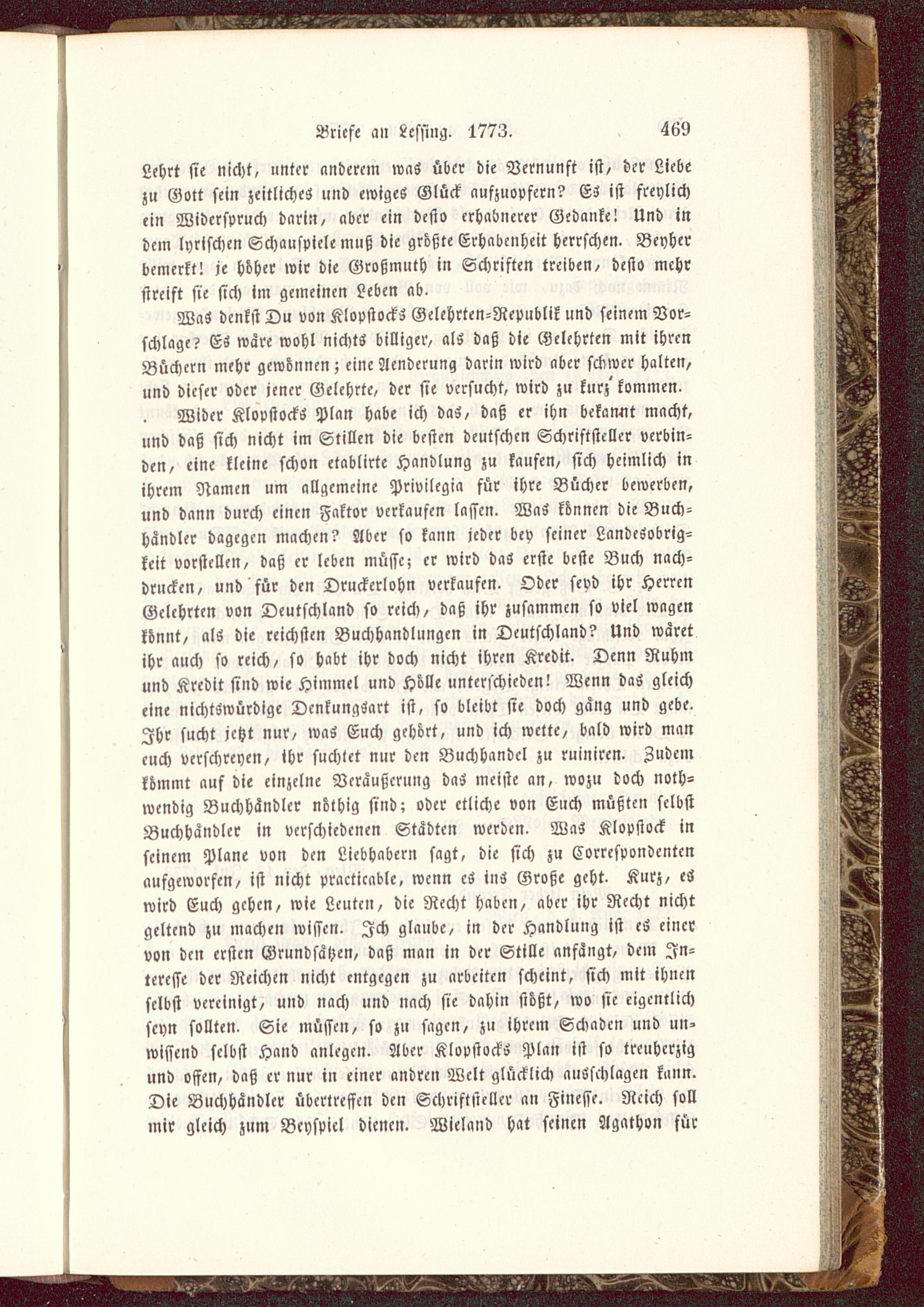 WaS denkst Du von KlopstockS Gelehrten-Republik und seinem Vor-schlage? ES wäre wohl nichts billiger/ als daß die Gelehrten mit ihrenBüchern mehr gewönnen; eine Aenderung darin wird aber schwer halte»/und dieser oder jener Gelehrte, der sie versucht, wird zu kur/kommen.