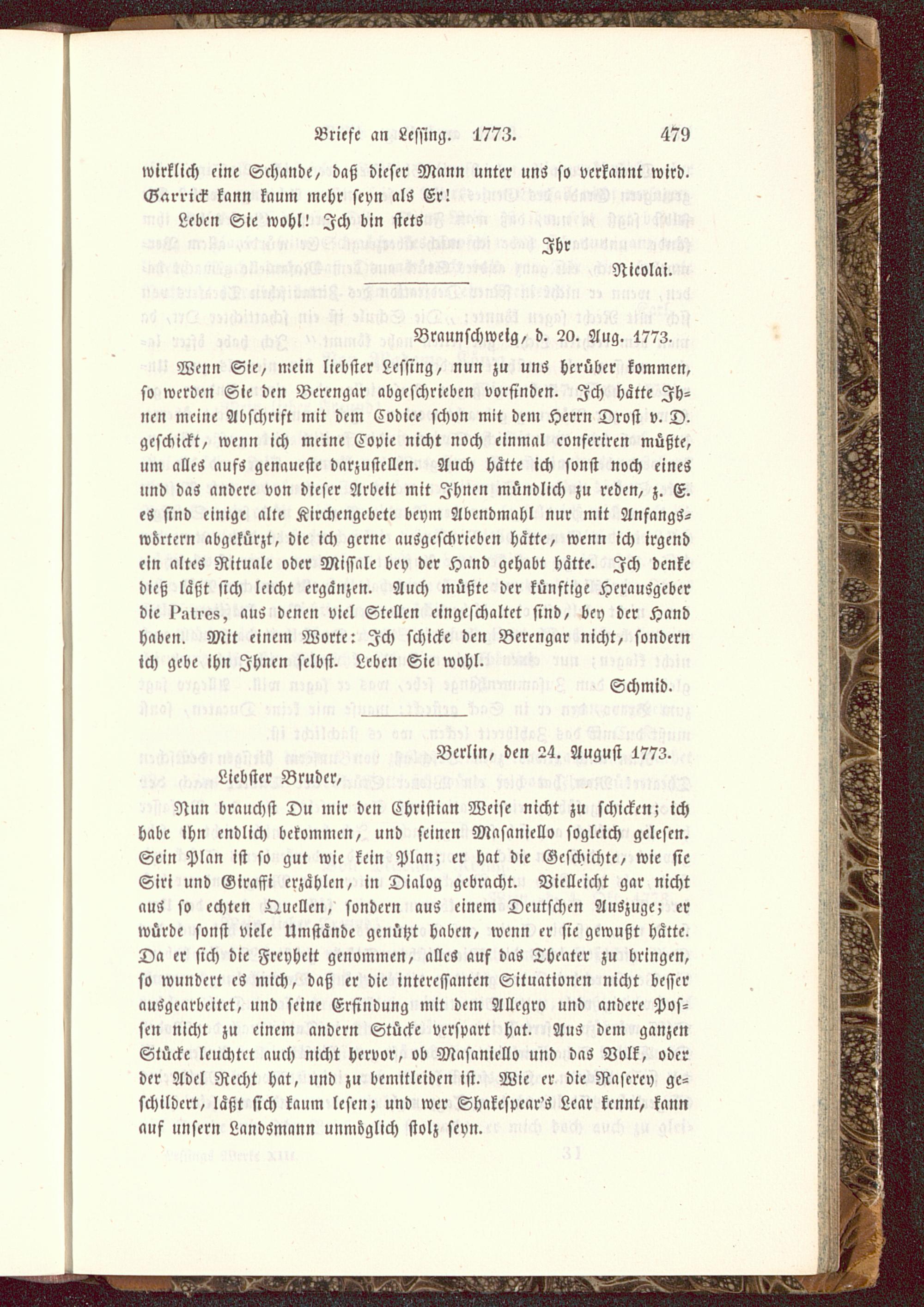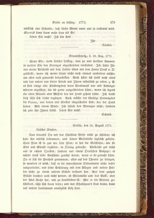 Nun brauchst Du mir den Christian Weise nicht zu schicken; ichhabe ihn endlich bekommen, und seinen Masanicllo sogleich gelesen.Sein Plan ist so gut wie kein Plan, er hat die Geschichte, wie sieSiri und Giraffi erzählen, in Dialog gebracht. Vielleicht gar nichtaus so echten Quellen, sondern aus einem Deutschen Auszuge, erwürde sonst viele Umstände genützt haben, wenn er sie gewußt hätte.Da er sich die Freyheit genommen, alles auf das Theater zu bringen,so wundert es mich, daß er die interessanten Situationen nicht besserausgearbeitet, und seine Erfindung mit dem Allcgro und andere Pos-sen nicht zu einem andern Stücke verspätt hat. AuS dem ganzenStücke leuchtet auch nicht hervor, ob Masanicllo und das Volk, oderder Adel Recht hat, und zu bemitleiden ist. Wie er die Raserey ge-schildert, läßt sich kaum lesen; und wer Shakespcar'S Lear kennt, kannauf unsern Landsmann unmöglich stolz seyn.