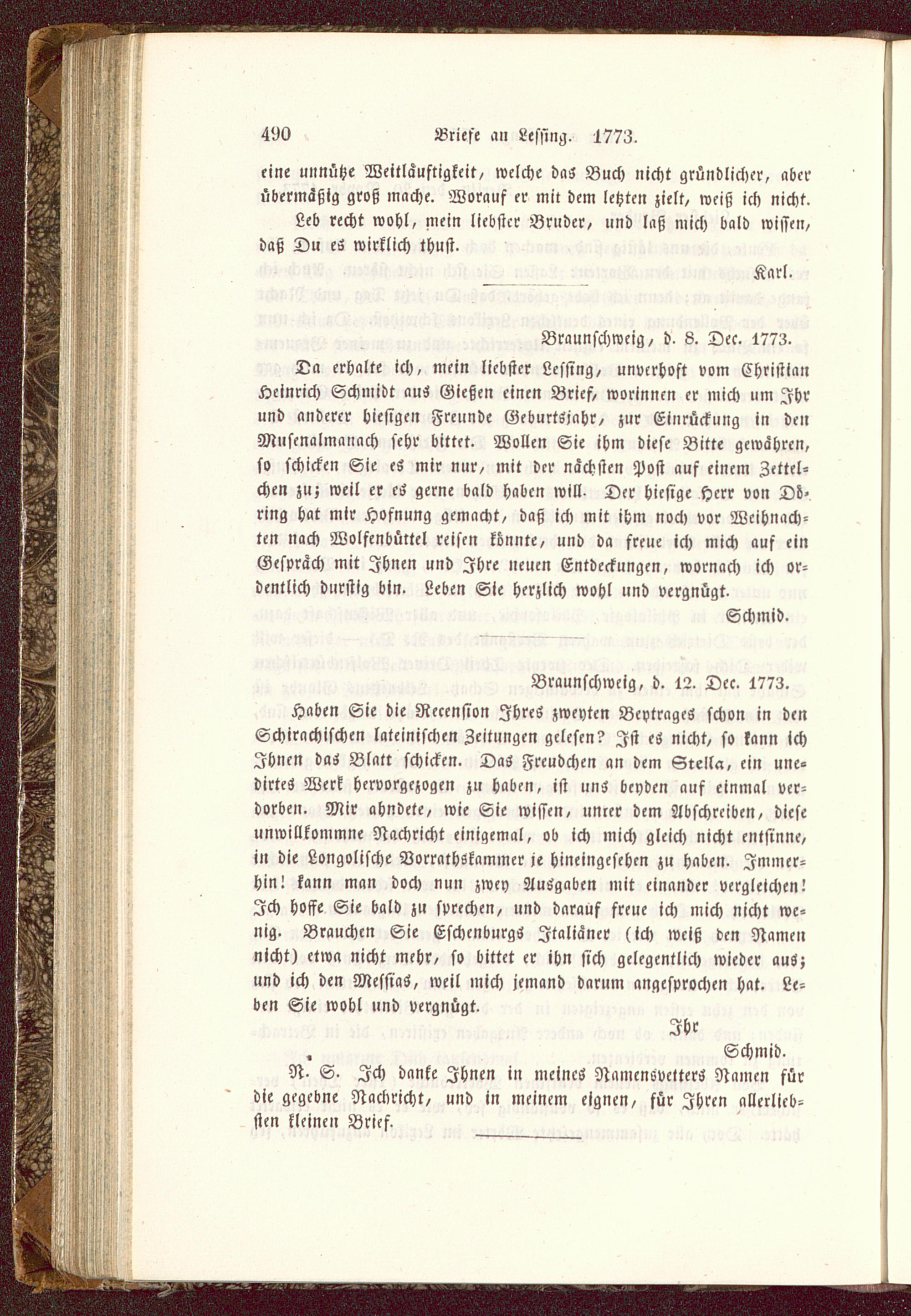 Da erhalte ich, mein liebster Lcssing, unvcrhoft vom ChristianHeinrich Schmidt aus Gießen einen Brief, worinncn er mich um Ihrund anderer hiesigen Freunde Geburtsjahr, zur Etnrückung in denMusenalmanach sehr bittet. Wollen Sie ihm diese Bitte gewähren,so schicken Sie cS mir nur, mit der nächsten Post auf einem Zettel-chen zu; weil er cS gerne bald haben will- Der hiesige Herr von Dö-ring hat mir Hofnung gemacht, daß ich mit ihm noch vor Weihnach-ten nach Wolfcnbüttel reisen konnte, und da freue ich mich auf einGespräch mit Ihnen und Ihre neuen Entdeckungen, wornach ich or-dentlich durstig bin. Leben Sie herzlich wohl und vergnügt.
