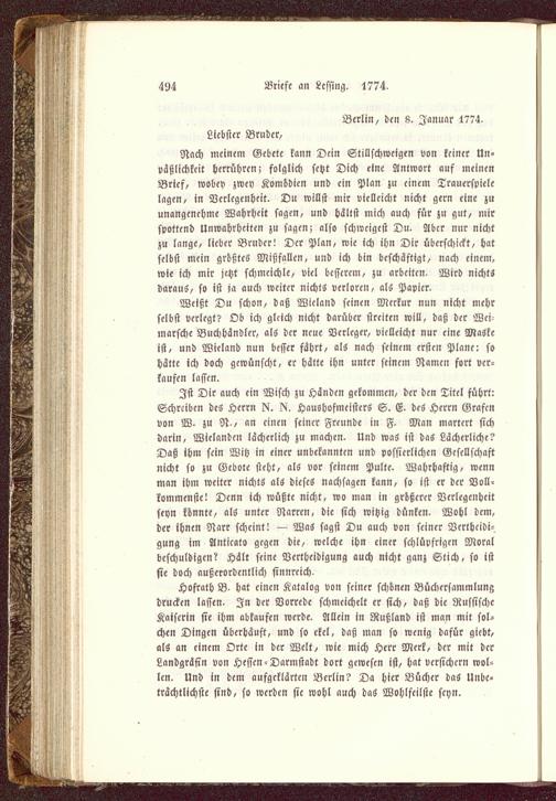 Nach meinem Gebete kann Dein Stillschweigen von keiner Un-päßlichkeit herrühren; folglich setzt Dich eine Antwort auf meinenBrief, wobey zwey Komödien und ein Plan zu einem Trauerspielelagen, in Verlegenheit. Du willst mir vielleicht nicht gern eine zuunangenehme Wahrheit sagen, und hältst mich auch für zu gut, mirspottend Unwahrheiten zu sagen; also schweigest Du. Aber nur nichtzu lange, lieber Bruder! Der Plan, wie ich ihn Dir überschickt, hatselbst mein größtes Mißfallen, und ich bin beschäftigt, nach einem,wie ich mir jetzt schmeichle, viel besserem, zu arbeiten. Wird nichtsdaraus, so ist ja auch weiter nichts verloren, als Papier.