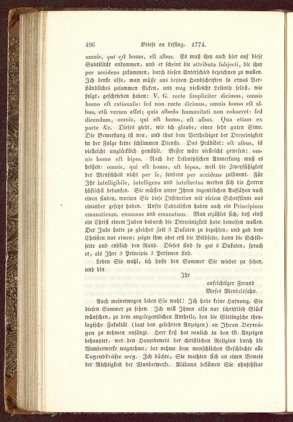 omnis, </,U Iiomo, ett allius. Es muß ihm auä) hier auf dieseSubtilität ankommen, und er scheint dieüUrikuw lulijeeli, die ihmper aeeiäens zukommen/ durch diesen Unterschied bezeichnen zu wollen.Ich denke also, man müsse aus beyden Handschriften so etwas Ver-ständliches zusammen flicken, und mag vielleicht Leiblich selbst, wiefolgt, geschrieben haben: V. reete Lmpliciter äicimus, omnisIiomo oft rütionalis: 5ecl von reete ilicimus, omnis üomo ekt al-Iius, etü verum eilet; c^uia all)e6o Immaiiitati non eoliaeret: kelltlicenllum, omnis, «zui eli Iiomo, e5t allius. <)ua etiam exparlo <^o. Dieses giebt, wie ich glaube, einen sehr guten Sinn.Die Bemerkung ist neu, und thut dem Vertheidiger der Dreyeinigkeitin der Folge keine schlimmen Dienste. Das Prädikat: elt almis, istvielleicht unglücklich gewählt. Besser wäre vielleicht gewesen: om-nis Iiomo ett dipes. Nach der Lcibnitzischen Anmerkung muß esheißen: omnis, cmi ett Iiomo, eü Iiipes, weil die Zwcyfüßigkeitder Menschheit nicht per 1e, sondern per aeei6ens zukömmt. FürIhr intelligidile, intelligens und iutellecius werden sich die Herrenhöflichst bedanken. Sie müssen unter Ihren jugendlichen Aufsätzen nocheinen finden, worinn Sie diese Distinction mit vielem Scharfsinne auseinander gesetzt haben. Unsre Cabbalistcn haben auch ein prinoipiumvmimalienm. emanans und emanatum. Man erzählet sich, daß einstein Christ einem Juden dadurch die Dreyeinigkeit habe beweisen wollen.Der Jude hatte zu gleicher Zeit 3 Dukaten zu bezahlen, und gab demChristen nur einen; zeigte ihm aber erst die Bildseite, dann die Schild-seite und endlich den Rand. Dieses sind so gut 3 Dukaten, spracher, als Ihre 3 Principia 3 Personen sind.