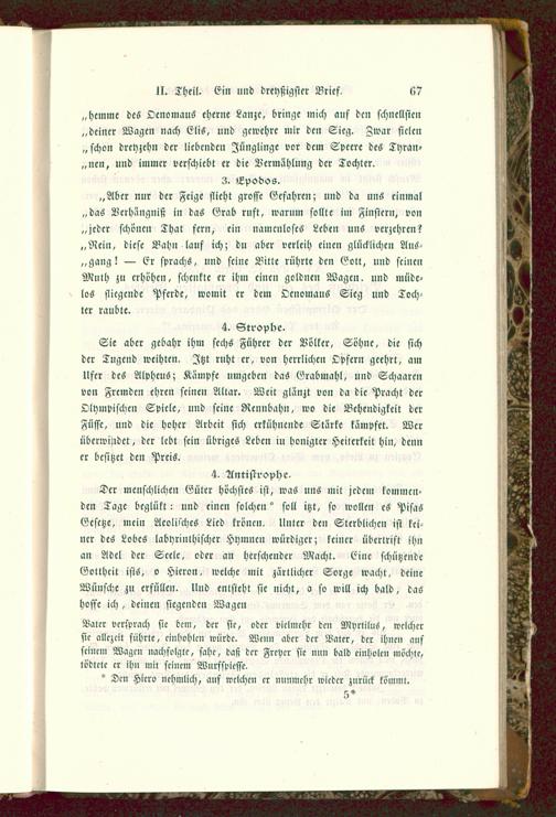 „Aber nur der Feige flicht grosse Gefahren; und da uns einmal„das Verhängnis; in das Grab ruft, warum sollte im Finstern, von„jeder schonen That fern, ein namcnloscS Leben uns verzehren?„Nein, diese Bahn lauf ich; du aber verleih einen glücklichen AuS-„gang! — l?r sprachs, und seine Bitte rührte den Gott, und sciucnMuth zu erhöhen, schenkte er ihm einen goldnen Wagen, und müdc-loS fliegende Pferde, womit er dem OcnomauS Sieg und Toch-ter raubte.