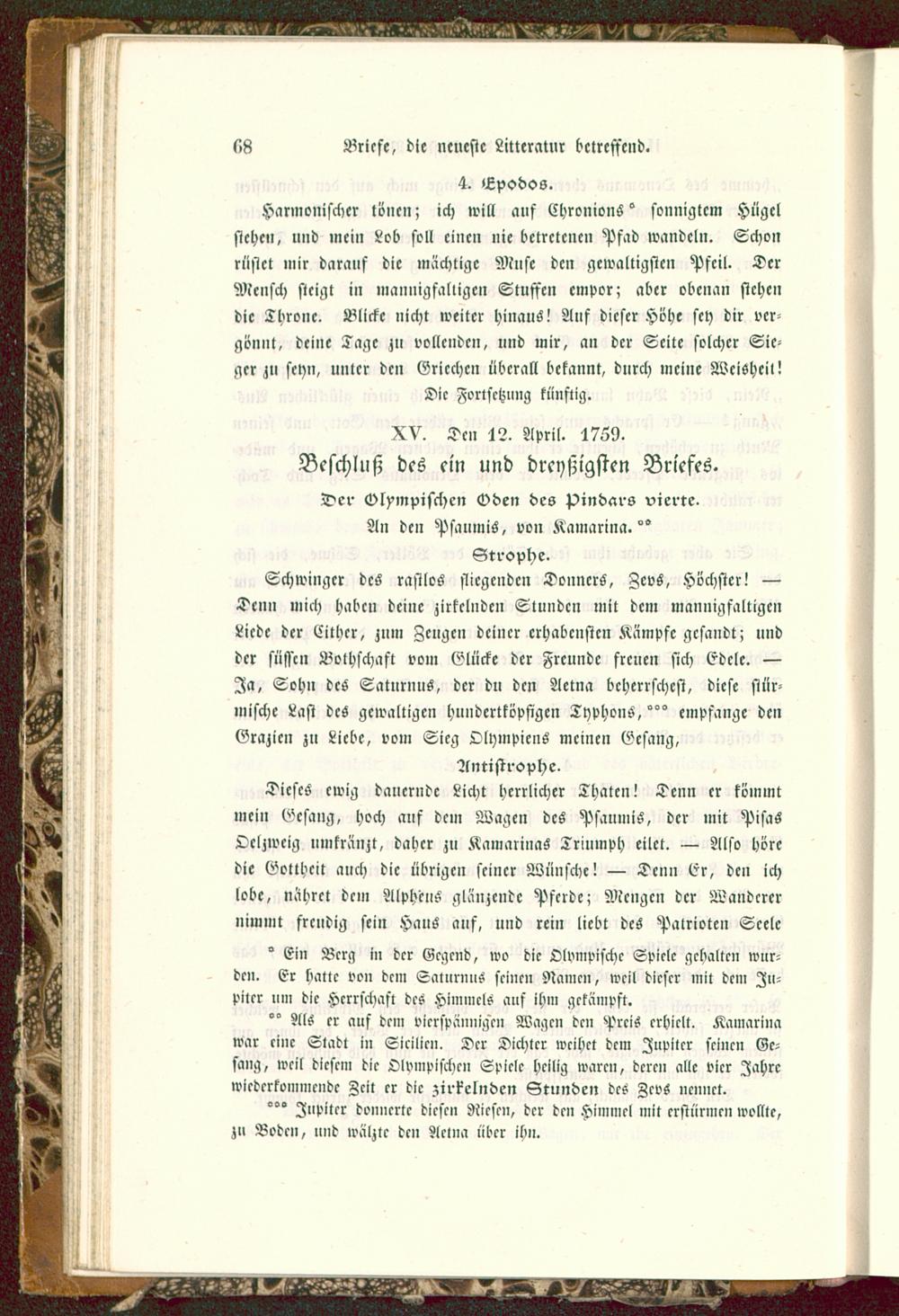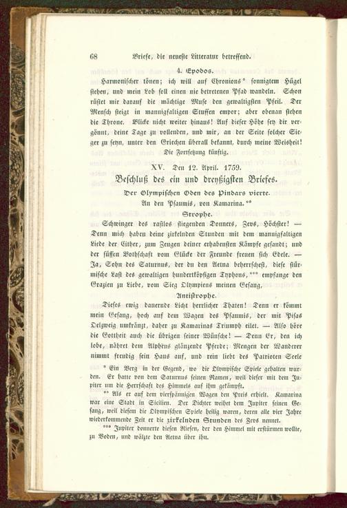 Dieses ewig dauernde Licht herrlicher Thaten! Denn er kömmtmein Gesang, hoch auf dem Wagen des Psanmis, der mit PisasOclzwcig nmkräuzt, daher zu Kamarinas Triumph eilet. — Also höredie Gottheit auch die übrigen seiner Wünsche! — Denn Er, den ichlobe, nähret dem Alphcus glänzende Pferde; Mengen der Wanderernimmt freudig sein Haus auf, und rein liebt des Patrioten Seele