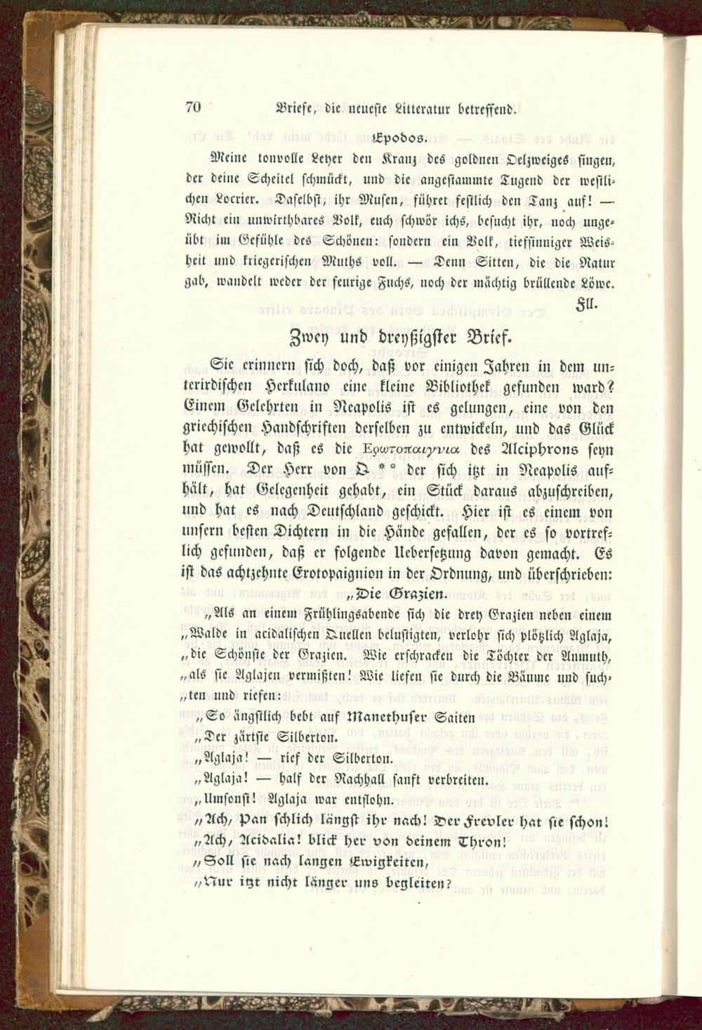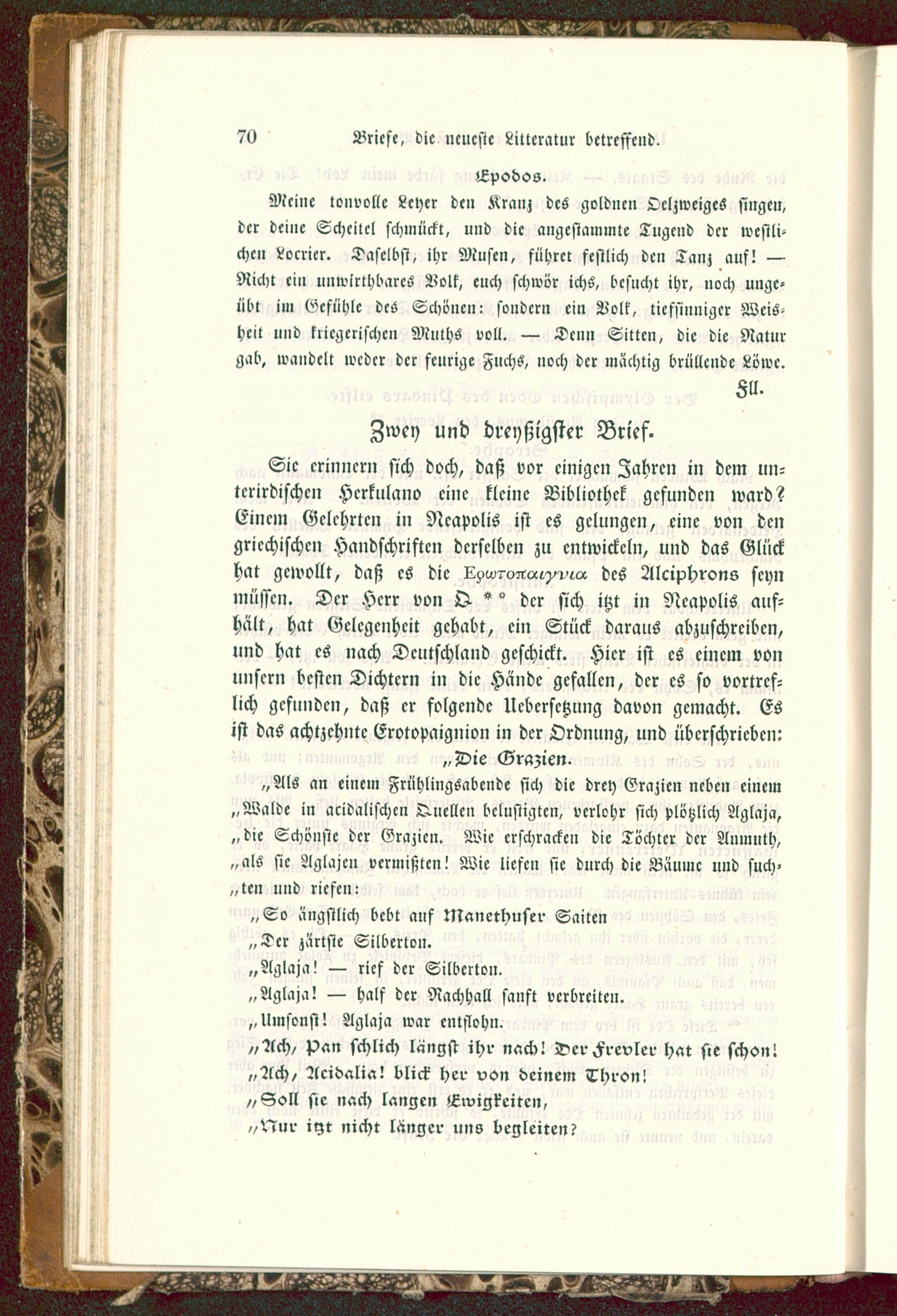 „Als an einem FrühliugSabende sich die drey Grazien neben einem„Walde in acidalischcn Luiellcn belustigten, vcrlchr sich plötzlich Aglaja,„die Schönste der Grazien. Wie crschrackcn die Töchter der Anmuth,„als sie Aglajcn vermißten! Wie liefen sie durch die Bäume und such-„tcn und riefen: