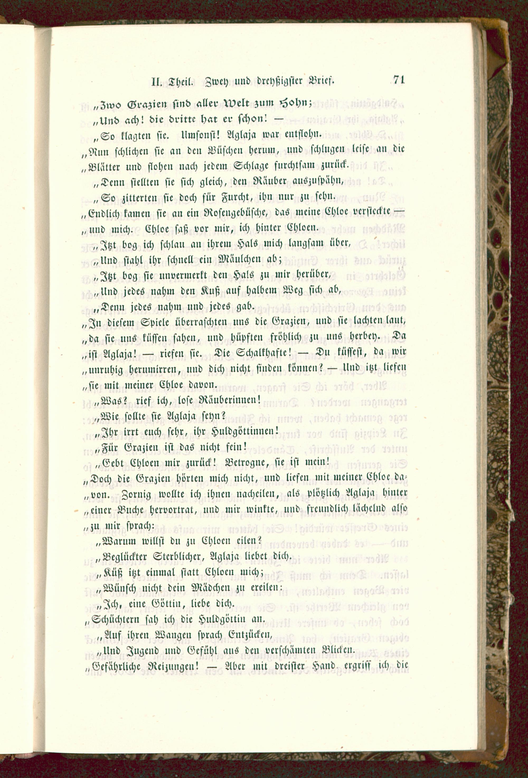 „Demi jedes »ahm und jedes gab.„I» diesem Spiele überraschte» u»S die Grazien, und sie lachte» la»t,„da sie uns küsse» sahe», und hüpfte» fröhlich z» u»s herbey. Da„ist Aglaja! — riefe» sie. Die Schalkhafte! — D» küssest, da wir„»»ruhig herumirrc», und dich nicht finde» könne»? — Und itzt liefe»„sie mit meiner Chloe davon.