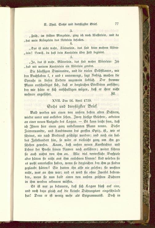 Bald werden wir einen von unsern besten alten Dichtern,wieder unter uns aufleben sehen. Zwey hiesige Gelehrte, arbeitenan einer neuen Ausgabe des L.ogau. — Es kann leicht seyn, daßich Ihnen hier einen ganz unbekannten Mann nenne. DieserZcitverwandtc, und Landsmann des grossen Gpiiz, ist, wie esscheinet, nie nach Verdienst geschätzt worden; und noch ein hal-bes Jahrhundert hin, so wäre es vielleicht ganz um ihn ge-schehen gewesen. Kaum, daß unsere neuen Kunstrichtcr undLehrer der Poesie seinen Namen noch anführen; weiter führensie auch nichts von ihm an. Wie viel vortrcflichc Beyspieleaber hätten sie nicht aus ihm entlehnen können! Und würden siees wohl unterlassen haben, wenn sie dergleichen bey ihm zu findengeglaubt hätten? Sie hatten ihn also nie gelesen; sie wußtennicht, was an ihm war; und es wird sie ohne Zweifel befrem-den, wenn sie nun bald einen von uuscru größten Dichternin ihm werden erkennen müssen.