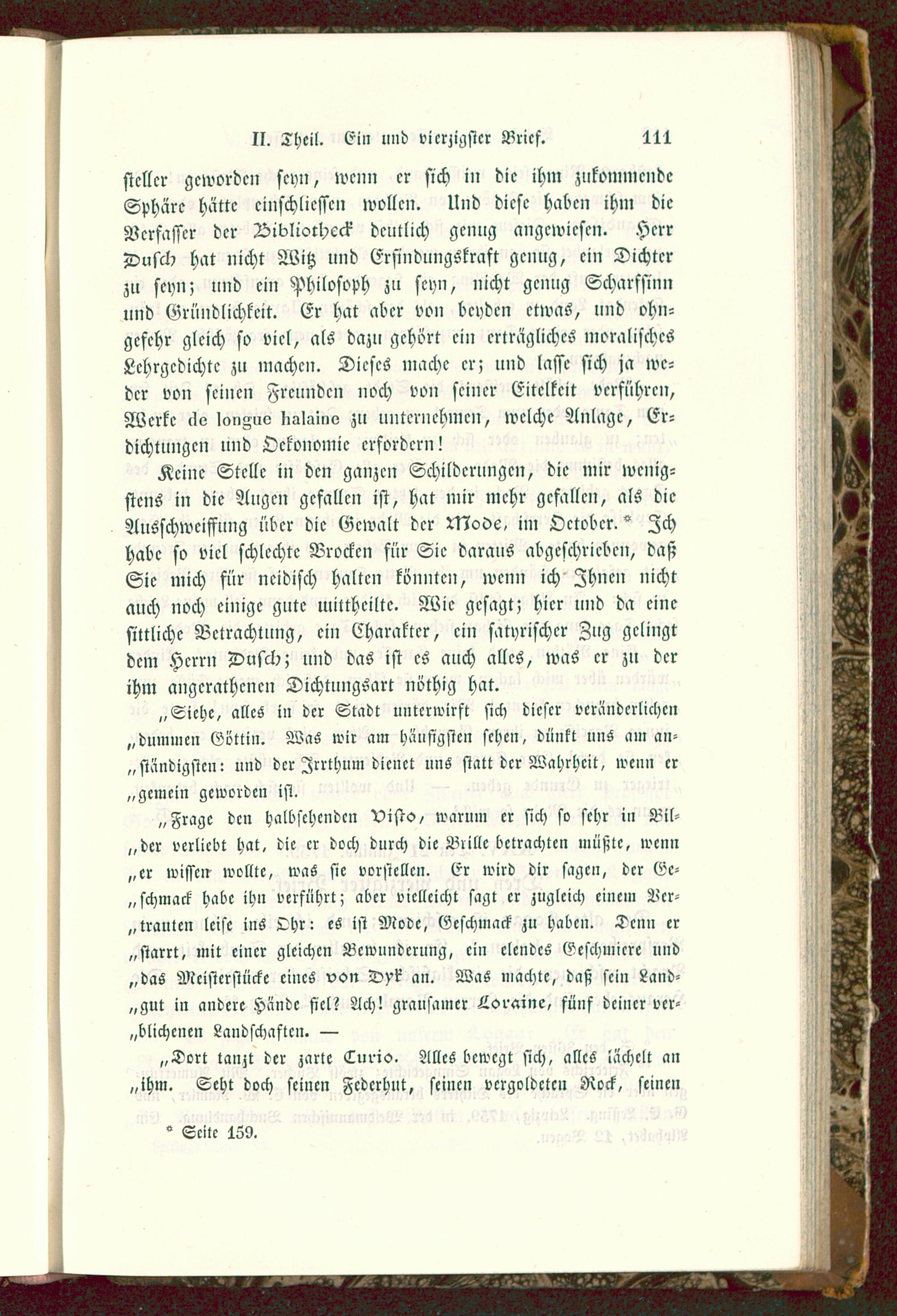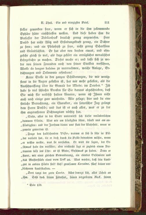 Keine Stelle in den ganzen Schilderungen, die mir wenig-stens in die Augen gefallen ist, hat mir mehr gefallen, als dieAusschwciffung über die Gewalt der Mode, im Octobcr." Ichhabe so viel schlechte Brocken für Sie daraus abgeschrieben, daßSie mich für neidisch halten könnten, wenn ich Ihnen nichtauch noch einige gute mittheilte. Wie gesagt; hier und da einesittliche Betrachtung, ein Charakter, ein satyrischcr Zug gelingtdem Herrn Duscli; und das ist es auch alles, was er zu derihm angcrathcncn Dichtungsart nöthig hat.