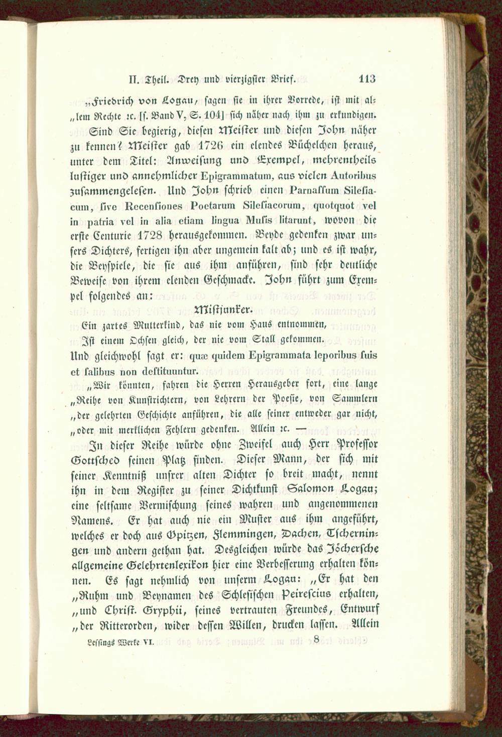 Zn dieser Reihe würde ohne Zweifel auch Herr ProfessorGottsched seinen Platz finden. Dieser Mann, der sich mitseiner Kenntniß nnsrcr alten Dichter so breit macht, nenntihn in dem Register zu seiner Dichtkunst Salomon Z.ogau;eine seltsame Vermischung seines wahren und angenommenenNamens. Er hat auch nie ein Muster aus ihm angeführt,welches er doch aus Gpiizen, Flemmingen, Dachen, Tschernin-gen und andern gethan hat. Desgleichen würde das Ischerscheallgemeine Gelehrrenlerir'on hier eine Verbesserung erhalten kön-nen. Es sagt nehmlich von unserm Aogau: „Er hat den„Ruhm und Bcynamen des Schlcsischcn Peirescius erhalten,„und Lhrist. Gryphii, seines vertrauten Freundes, Entwurf„der Ritterorden, wider dessen Willen, drucken lassen. AlleinLeslmgs Werk- vi, 8