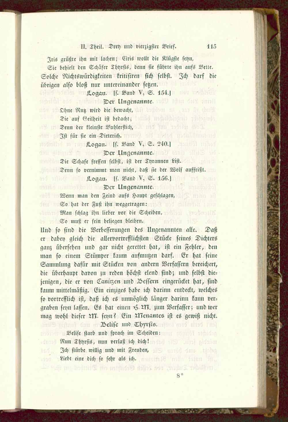 L.ogan. ss. Band V, S.Der Ungenannte-Die Schafe fressen selbst, ist der Tyrannen List.Vciin so vernimmt man nicht, daß sie der Wolf auffrißt.A.ogan. >s. Band V, S. 166.jDer Ungenannte-Wenn man den Feind aufs Haupt geschlagen,So hat der Fuß ihn weggetragen:Man schlag ihn lieber vor die Scheiben,So muß er fein beilegen bleiben.Und so sind die Verbesserungen des Ungenannten alle. Daßer dabey gleich die allcrvortrcfflichstcn Stücke seines Dichtersganz übersehen und gar nicht gerettet hat, ist ein Fehler, denman so einem Stümper kaum aufmutzen darf. Er hat seineSammlung dafür mit Stücken von andern Verfassern bereichert,die überhaupt davon zu reden höchst elend sind; und selbst die-jenigen, die er von Tanirzen und Bessern eingerücket hat, sindkaum mittelmäßig. Ein einziges habe ich darin» entdeckt, welchesso vortrefflich ist, daß ich es unmöglich länger darin» kann ver-graben seyn lassen. Es hat einen H 5N. zum Verfasser; und wermag wohl dieser N7 seyn? Ein Menantcs ist es gewiß nicht.Delisc und Thesis.Belisc starb und sprach im Scheiden:Nun Thyrsis, nun verlaß ich dich!Ich stürbe willig und mit Freuden,Liebt eine dich so sehr als ich.