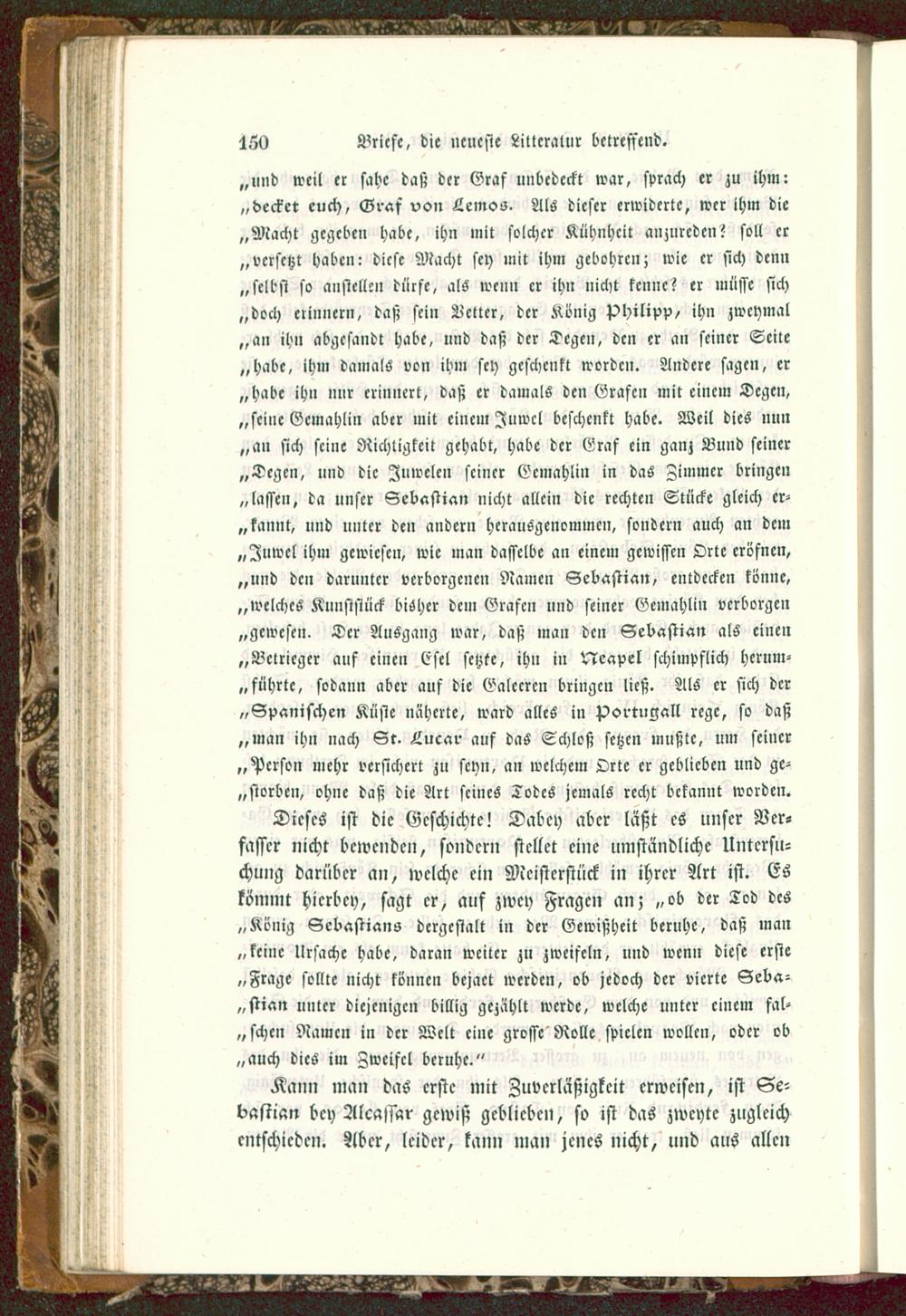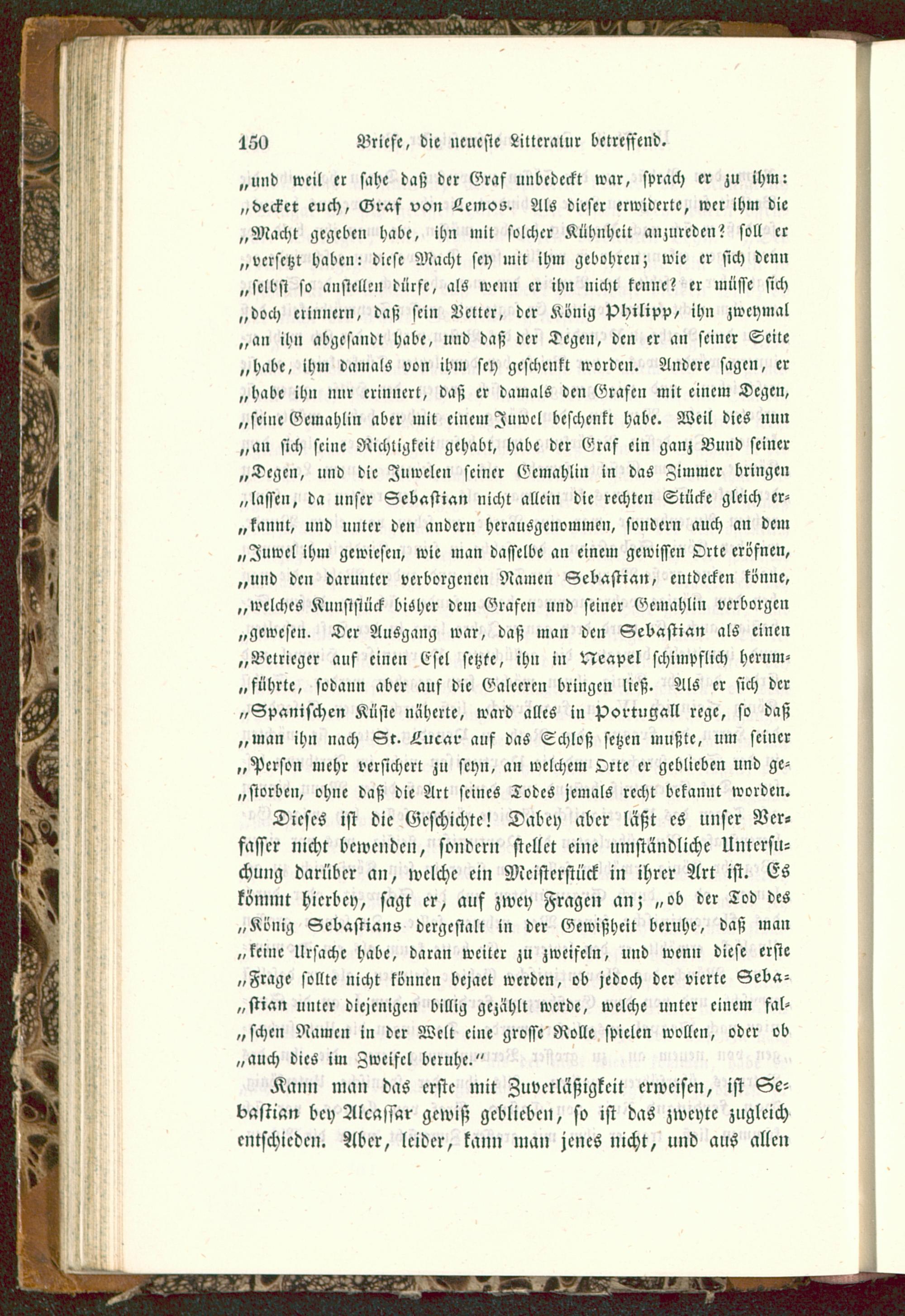 „und weil er sahe daß der Graf unbedeckt war, sprach er zu ihm:„decket euch, Graf von Lemos. Als dieser erwiderte, wer ihm die„Macht gegeben habe, ihn mit solcher Kühnheit anzureden? soll er„versetzt haben: diese Macht sey mit ihm gebohrcn; wie er sich denn„selbst so anstellen dürfe, als wenn er ihn nicht kenne? er müsse sich„doch erinnern, daß sein Letter, der König Philipp/ ihn zwcymal„an ihn abgesandt habe, und daß der Degen, den er an seiner Seite„habe, ihm damals von ihm sey geschenkt worden. Andere sagen, er„habe ihn nur erinnert, daß er damals den Grafen mit einem Degen,„seine Gemahlin aber mit einem Juwel beschenkt habe. Weil dies nun„an sich seine Richtigkeit gehabt, habe der Graf ein ganz Bund seiner„Degen, und die Juwelen seiner Gemahlin in das Zimmer bringe»„lassen, da unser Sebastian nicht allein die rechten Stücke gleich er-„kannt, und unter den andern herausgenommen, sondern auch an dem„Juwel ihm gewiesen, wie man dasselbe an einem gewissen Orte eröfnen,„und den darunter verborgenen Namen Sebastian, entdecken könne,„welches Kunststück bisher dem Grafen und seiner Gemahlin verborgen„gewesen. Der AuSgang war, daß man den Sebastian als einen„Bclricger auf einen Esel setzte, ihn in Neapel schimpflich hernm-„ führte, sodann aber auf die Galeeren bringen ließ. Als er sich der„Spanischen Küste näherte, ward alles in Portugal ! rege, so daß„man ihn nach St. Lucar auf das Schloß setzen mußte, um seiner„Person mehr versichert zu seyn, an welchem Orte er geblieben und ge-worben, ohne daß die Art seines Todes jemals recht bekannt worden.