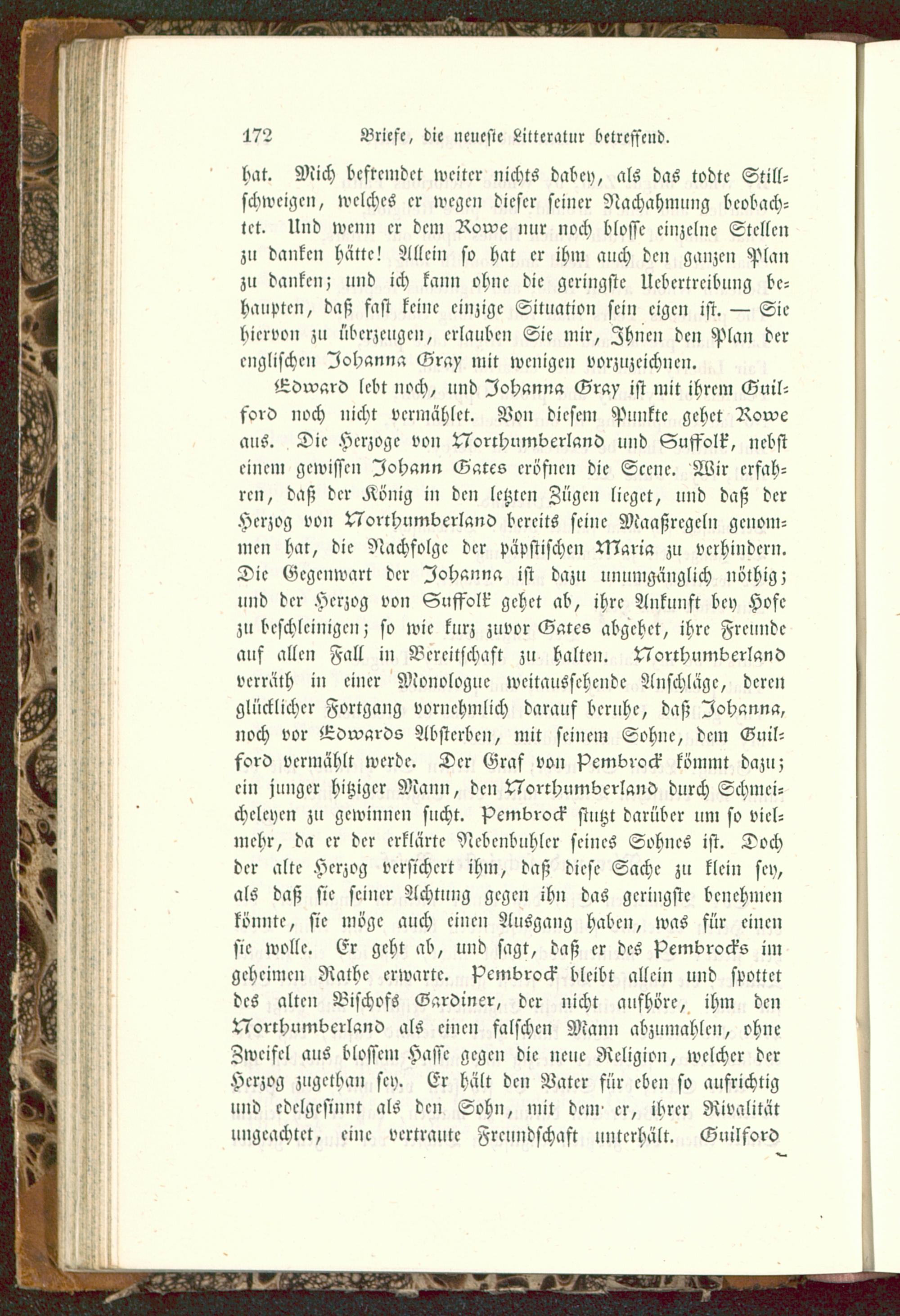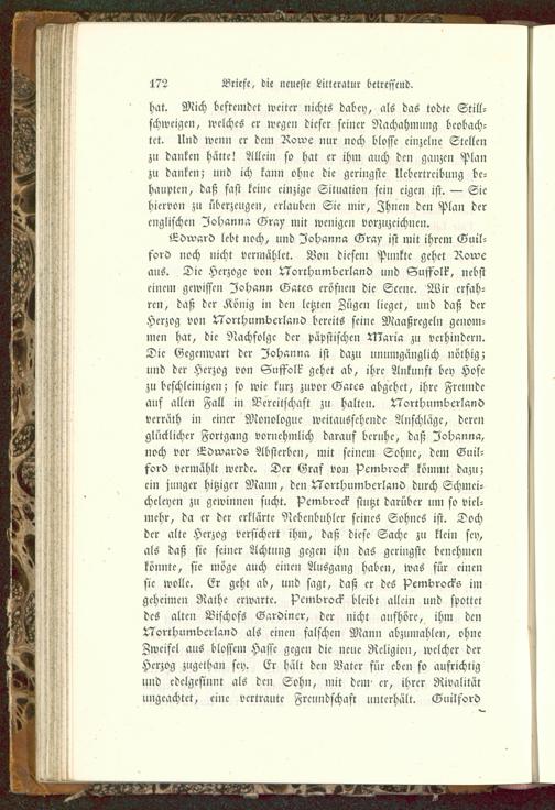 hat. Mich befremdet weiter nichts dabey, als das todte Still-schweige», welches er wegen dieser seiner Nachahmung beobach-tet. Und wenn er dem Rowe nur noch blosse einzelne Stellenzu danken halte! Allein so hat er ihm auch den ganzen Planzu danken; und ich kann ohne die geringste Uebertreibung be-haupten, daß fast keine einzige Situation sein eigen ist. — Siebicrvon zu überzeugen, erlauben Sie mir, Ihnen den Plan derenglischen Johanna Gray mit wenigen vorzuzeichncn.