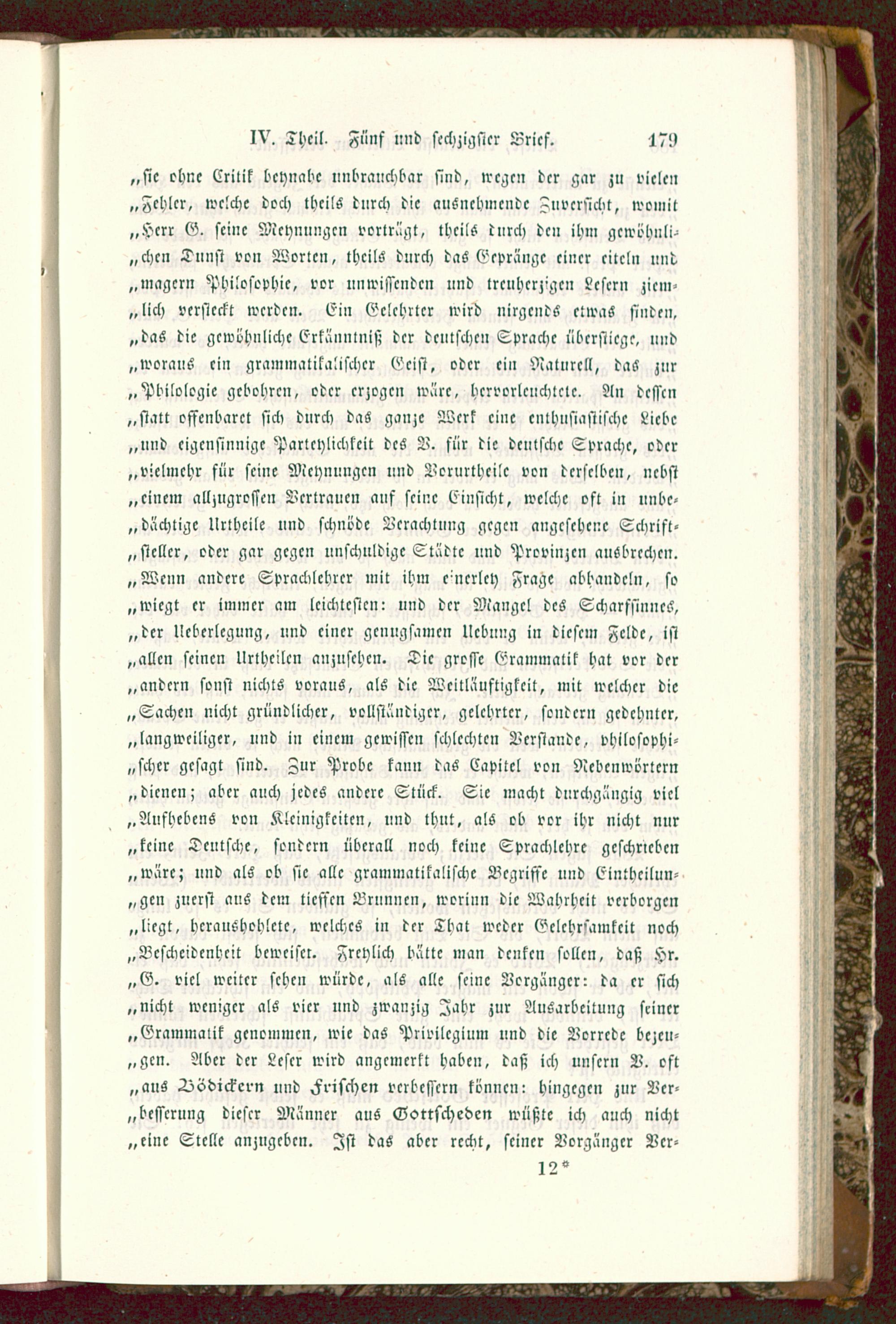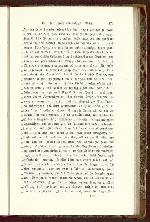 „sie ohne Critik beynahe unbrauchbar sind, wegen der gar zu viele»„Fehler, welche doch theils durch die ausnehmende Zuversicht, womit„Herr G. seine Meynungen vortragt, theils durch den ihm gcwohnli-„chcn Tnnst von Worten, theils durch das Eeprängc einer citcln und„magcrn Philosophie, vor im wissenden und lrcuhcrz'gcn Lesern ziem-„lich versteckt werden. Ein Gelehrter wird nirgends etwas sinecn,„das die gewöhnliche Erkännlniß der dcntschcn Sprache überstiege, und„woraus ein grammalikaüschcr Geist, oder ein Naturell, das zur„Philologie gcl'ohrcn, oder erzogen wäre, hervorleuchtete. An dessen„statt offenbaret fiel, durch das ganze Werk eine enthusiastische Liebe„und eigensinnige Parteylichkeit des V. für die deutsche Sprache, oder„vielmehr für seine Meynungen und Vcrurthcilc von derselben, nebst„einem allzugrossen Vertrauen auf seine Einsicht, welche oft in nnbc-„dächligc Urlheile und schnöde Verachtung gegen angesehene Schrift-„stcllcr, oder gar gegen unschuldige Stätte und Provinzen auSbrcchcn.„Wenn andere Spracklehrcr mit ihm cuicrlcy Frage abhandeln, so„wiegt er immer am leichtesten: und der Mangel des ScharfstnncS,„der Ilcberlegung, und einer genügsamen Uebung in diesem Felde, ist„allen seinen Urtheilen anzusehen. Die grosse Erammatik hat vor der„andern sonst nichts voraus, als die Weitläufigkeit, mit welcher die„Sachen nicht gründlicher, vollständiger, gelehrter, sondern gedehnter,„langweiliger, und in einem gewissen schlechten Verstände, philosophi-scher gesagt sind. Zur Probe kann das Capitel von Nebcnwörlcrn„dienen; aber auch jedes andere Stück. Sie macht durchgängig viel„Aufhebens von Kleinigkeiten, und lhut, als ob vor ihr nicht nur„keine Teutsche, sondern überall noch keine Sprachlehre geschrieben„wäre; und als ob sie alle grainmatikalische Begriffe und Einthcilun-„gen zuerst ane dem liessen Brnnnen, worinn die Wahrheit verborgen„liegt, hcrauShchlctc, welches in der That weder Gelehrsamkeit noch„Bescheidenheit beweiset. Freylich bättc man denken sollen, daß Hr.„E. viel weiter sehen würde, als alle seine Vorgänger: da er sich„nicht weniger als vier und zwanzig Jahr zur Ausarbeitung seiner„Graminalik genommen, wie das Privilegium und die Vorrede bezcn-„gen. Aber der Leser wird angemerkt haben, daß ich unsern V. oft„aus Bödickcrn und Frischen verbessern können: hingegen zur Ver-besserung dieser Männer aus Gorrscheden wüßte ich auch nicht„eine Stelle anzugeben. Ist das aber recht, seiner Vorgänger Vcr-