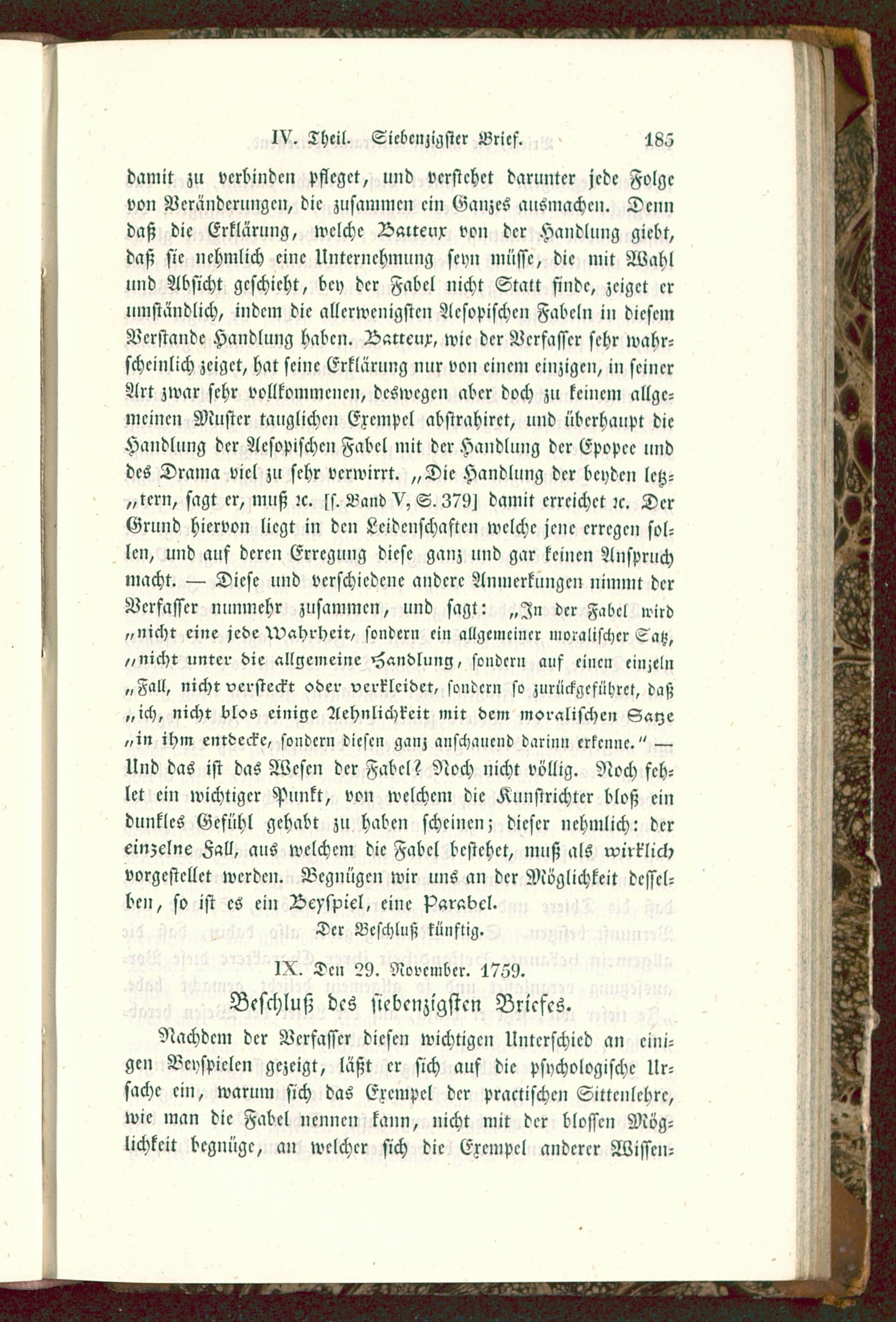 damit zu verbinde» Pfleget, und verstehet darunter jede Folgevon Veränderungen, die zusammen ein Ganzes ausmachen. Denndaß die Erklärung, welche Balteur von der Handlung giebt,daß sie nehmlich eine Unternehmung seyn müsse, die mit Wahllind Absicht geschieht, bey der Fabel nicht Statt finde, zeiget erumständlich, indem die allerwenigsten Acsopischcn Fabeln in diesemVerstände Handlung haben. Darreux, wie der Verfasser sehr wahr-scheinlich zeiget, hat seine Erklärung nur von einem einzigen, in seinerArt zwar sehr vollkommenen, deswegen aber doch zu keinem allge-meinen Muster tauglichen Exempel abstrahirct, und überhaupt dieHandlung der Acsopischcn Fabel mit der Handlung der Epopcc unddes Drama viel zu sehr verwirrt. „Die Handlung der beyden letz-„rern, sagt er, muß :c. ff. Nand V, S. 379^ damit erreichet zc. DerGrund hiervon liegt in den Leidenschaften welche jene erregen sol-len, und auf deren Erregung diese ganz und gar keinen Anspruchmacht. — Diese und verschiedene andere Anmerkungen nimmt derVerfasser nunmehr zusammen, und sagt: „In der Fabel wird„nicht eine jede'Mayrheit, sondern ein allaemcincr moralischer Latz,/,nicht unter die allgemeine Handlung, sondern auf einen eiiijcln„Fall, nicht versteckt oder verkleidet, sondern so zurückgeführet, daß„ich, nicht blos einige Aehnlichkcit mit dem moralischen Saye„in ihm entdecke, sondern diesen ganz anschauend darin» erkenne." —Und das ist das Wesen der Fabel? Noch nicht völlig. Noch feh-let ein wichtiger Punkt, von welchem die Kunstrichter bloß eindunkles Gefühl gehabt zu haben scheinen; dieser nehmlich: dereinzelne Fall, aus welchem die Fabel bestehet, muß als wirr'liclivorgestellet werden. Begnügen wir uns an der Möglichkeit dessel-ben, so ist es ein Beyspiel, eine Parabel.