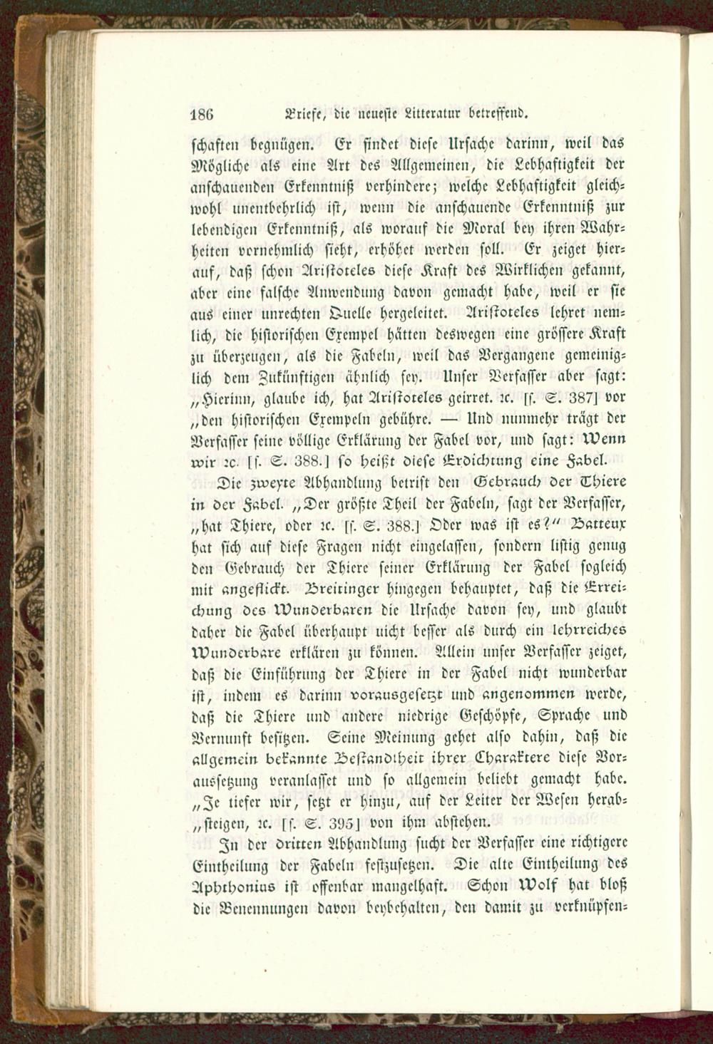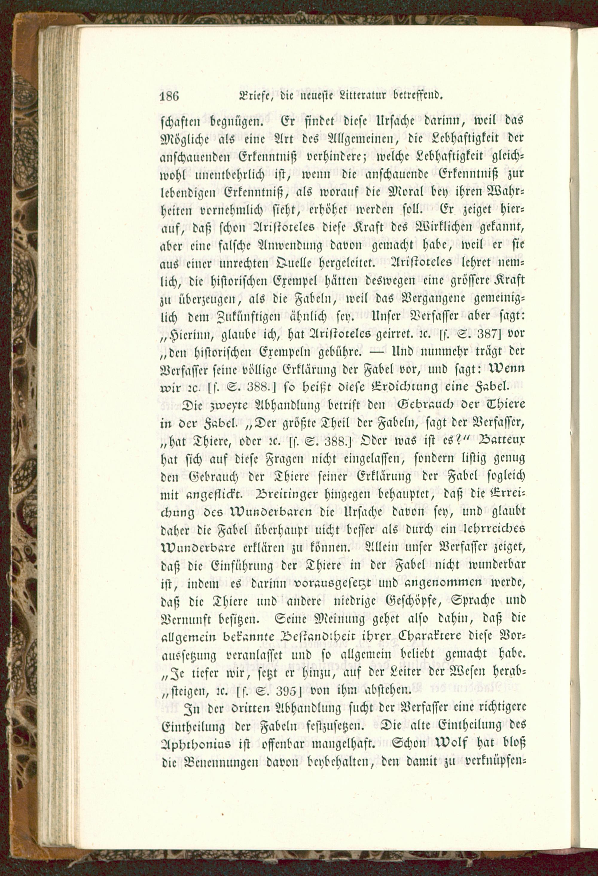 schastcn begnügen. Er findet diese Ursache darinn, weil dasMögliche als eine Art des Allgemeinen, die Lebhaftigkeit deranschauenden Erkenntniß verhindere; welche Lebhaftigkeit gleich-wohl unentbehrlich ist, wenn die anschauende Erkenntniß zurlebendigen Erkenntniß, als worauf die Moral bey ihren Wahr-heiten vornehmlich sieht, erhöhet werden soll. Er zeiget hier-auf, daß schon Aristoteles diese Kraft des Wirklichen gekannt,aber eine falsche Anwendung davon gemacht habe, weil er sieaus einer unrechten Quelle hergeleitet. Aristoteles lehret ncm-lich, die historischen Exempel hätten deswegen eine grössere Kraftzu überzeugen, als die Fabeln, weil das Vergangene gemeinig-lich dem Zukünftigen ähnlich sey. Unser Verfasser aber sagt:„Hierum, glaube ich, hat Aristoteles gcirrct. :c. fs. S. 387^ vor„den historischen Exempeln gebühre. — Und nunmehr trägt derVerfasser seine völlige Erklärung der Fabel vor, und sagt: !Vennrvir :c fs- S. 388-1 so hcisit diese Lroichrung eine Fabel.