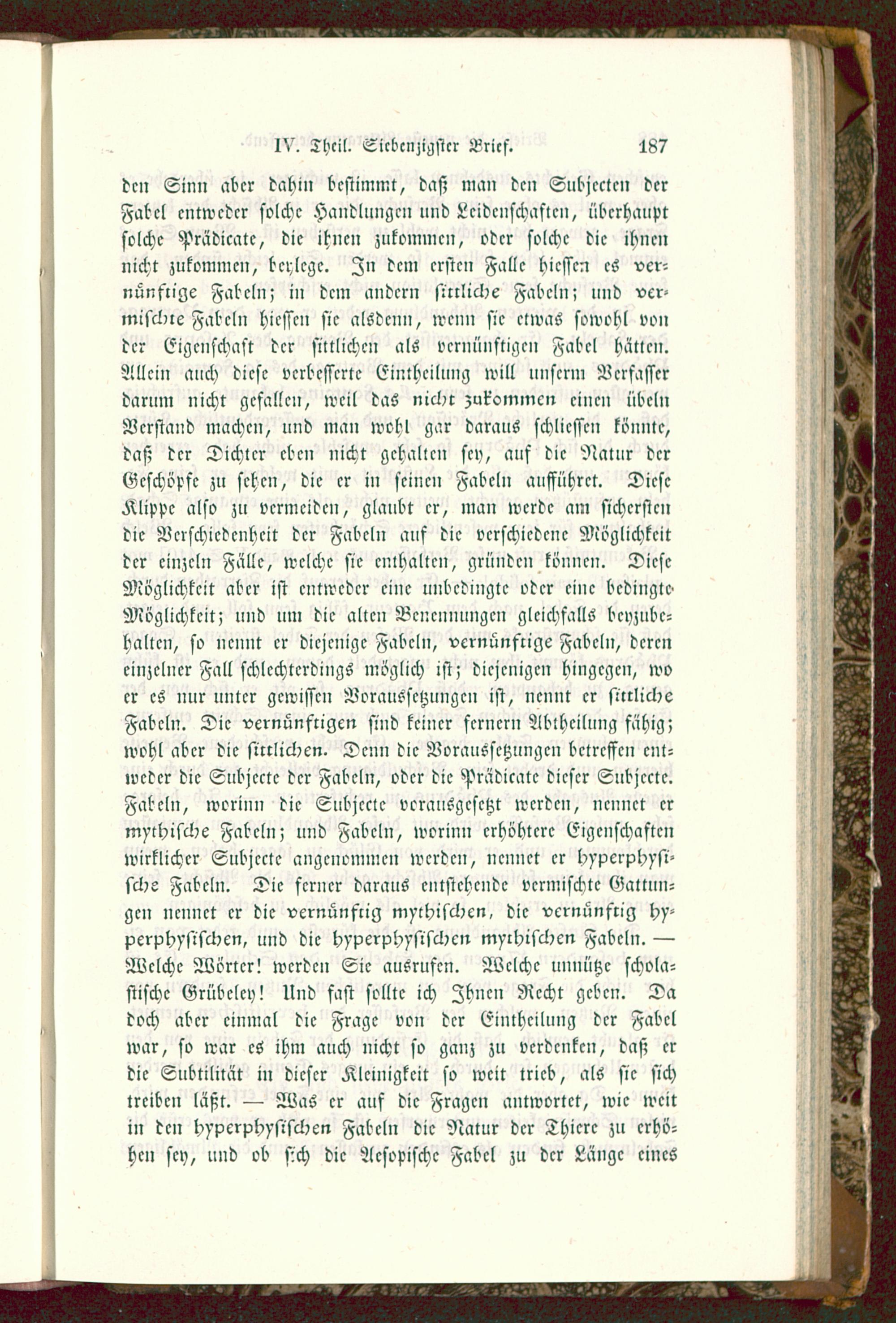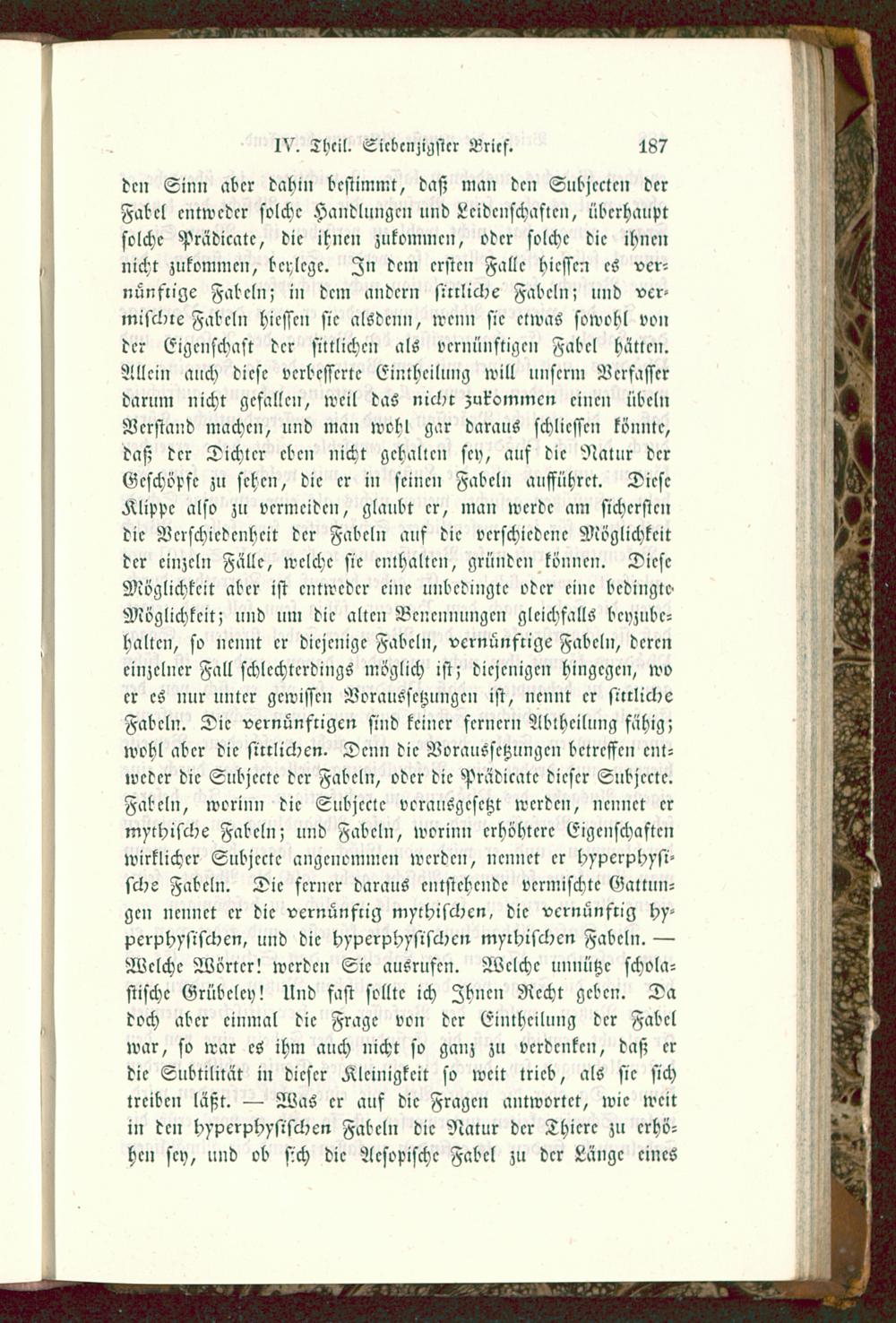 dm Sinn aber dahin bestimmt, das; man dcn Subjecten derFabel entweder solche Handlimgen und Leidenschaften, überhauptsolche Prädicate, die ihnen zukommen, oder solche die ihnennicht zukommen, beylege. In dem ersten Falle hiessen es ver-nünftige Fabeln; in dem andern sittliche Fabeln? und ver-mischte Fabeln hiessen sie alsdcnn, wenn sie etwas sowohl vonder Eigenschaft der sittlichen als vernünftigen Fabel hätten.Allein auch diese verbesserte Einthcilung will unserm Verfasserdarum nicht gefallen, weil das nicht zukommen einen ÜbelnVerstand machen, und man wohl gar daraus schlicsscn könnte,daß der Dichter eben nicht gehalten sey, auf die Natur derGeschöpfe zu sehen, die er in seinen Fabeln aufführet. DieseKlippe also zu vermeiden, glanbt er, man werde am sicherstendie Verschiedenheit der Fabeln auf die verschiedene Möglichkeitder einzeln Falle, welche sie enthalten, gründen können. DieseMöglichkeit aber ist entweder eine unbedingte oder eine bedingte«Möglichkeit; und nm die alten Benennungen gleichfalls beyzube-halten, so nennt er diejenige Fabeln, vernünftige Fabeln, dereneinzelner Fall schlechterdings möglich ist; diejenigen hingegen, woer es nur unter gewissen Voraussetzungen ist, nennt er sittlicheFabeln. Die vernünftigen sind keiner fernern Abtheilung fähig;wohl aber die sittlichen. Denn die Voraussetzungen betreffen ent-weder die Subjecte der Fabeln, oder die Prädicatc dieser Subjecte.Fabeln, worinn die Subjecte vorausgesetzt werden, nennet ermythische Fabeln; und Fabeln, worinn crhöhtcrc Eigenschaftenwirklicher Subjecte angenommen werden, nennet er hypcrphysi-sche Fabeln. Die ferner daraus entstehende vermischte Gattun-gen nennet er die vernünftig mythischen, die vernünftig hy-perphysischcn, und die hyperphysischcn mythischen Fabeln. —Welche Wörter! werden Sie ausrufen. Welche unnütze schola-stische Grübelcy! Und fast sollte ich Zhncn Recht geben. Dadoch aber einmal die Frage von der Einthcilung der Fabelwar, so war es ihm auch nicht so ganz zu verdenken, daß erdie Subtilität in dieser Kleinigkeit so weit trieb, als sie sichtreiben läßt. — Was er auf die Fragen antwortet, wie weitin den hypcrphysischcn Fabeln die Natur der Thiere zu erhö-hen sey, und ob sich die Acsopischc Fabel zu der Länge eines