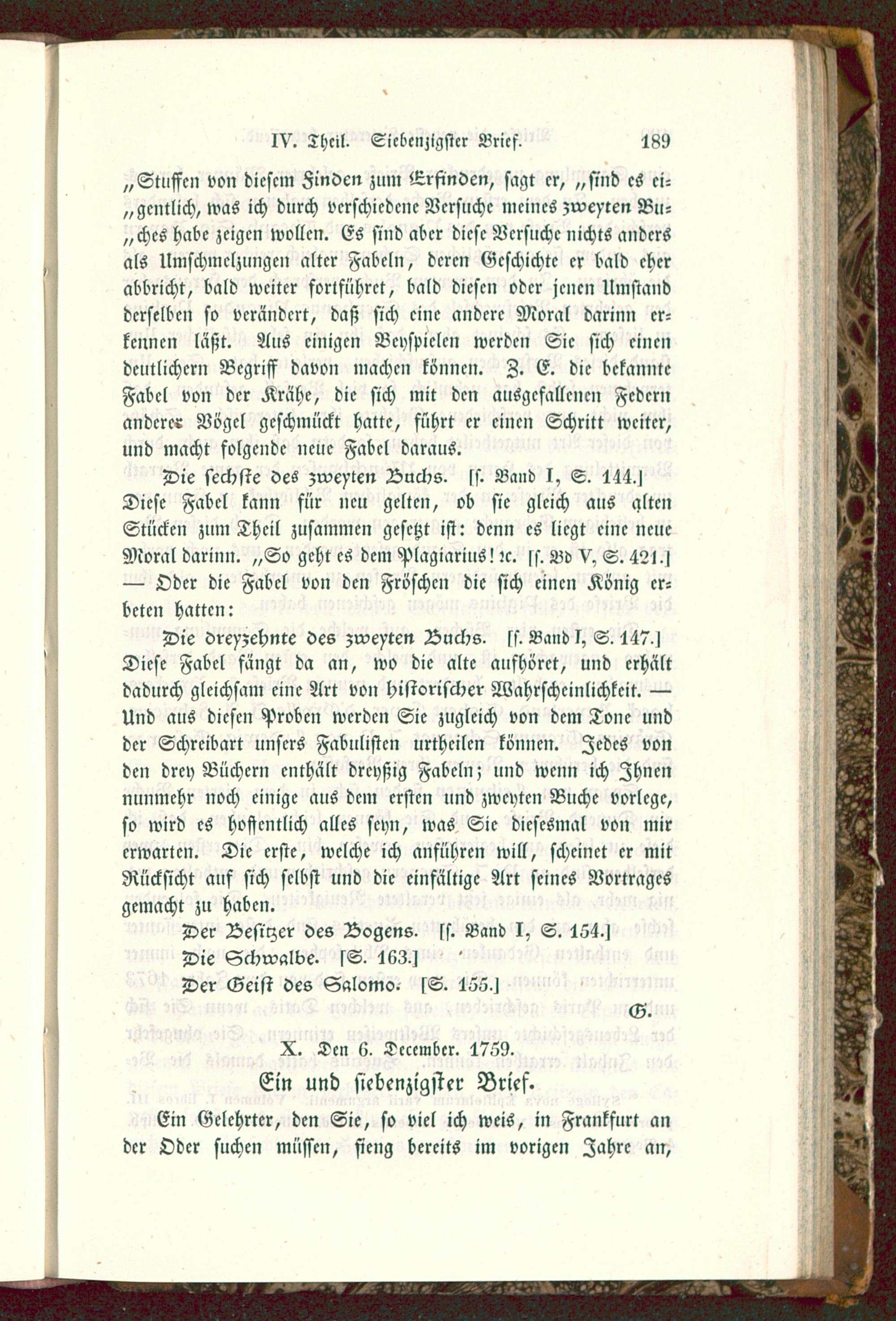 Die sechste des zweyten Buchs, ls. Band I, S. 444.jDiese Fabel kann für neu gelten, ob sie gleich aus altenStücken zum Theil zusammen gesetzt ist: denn es liegt eine neueMoral darinn. „So geht es dem Plagiarius! ?c. ss. Bd V, S. 421-1— Oder die Fabel von den Fröschen die sich einen König er-beten hatten: