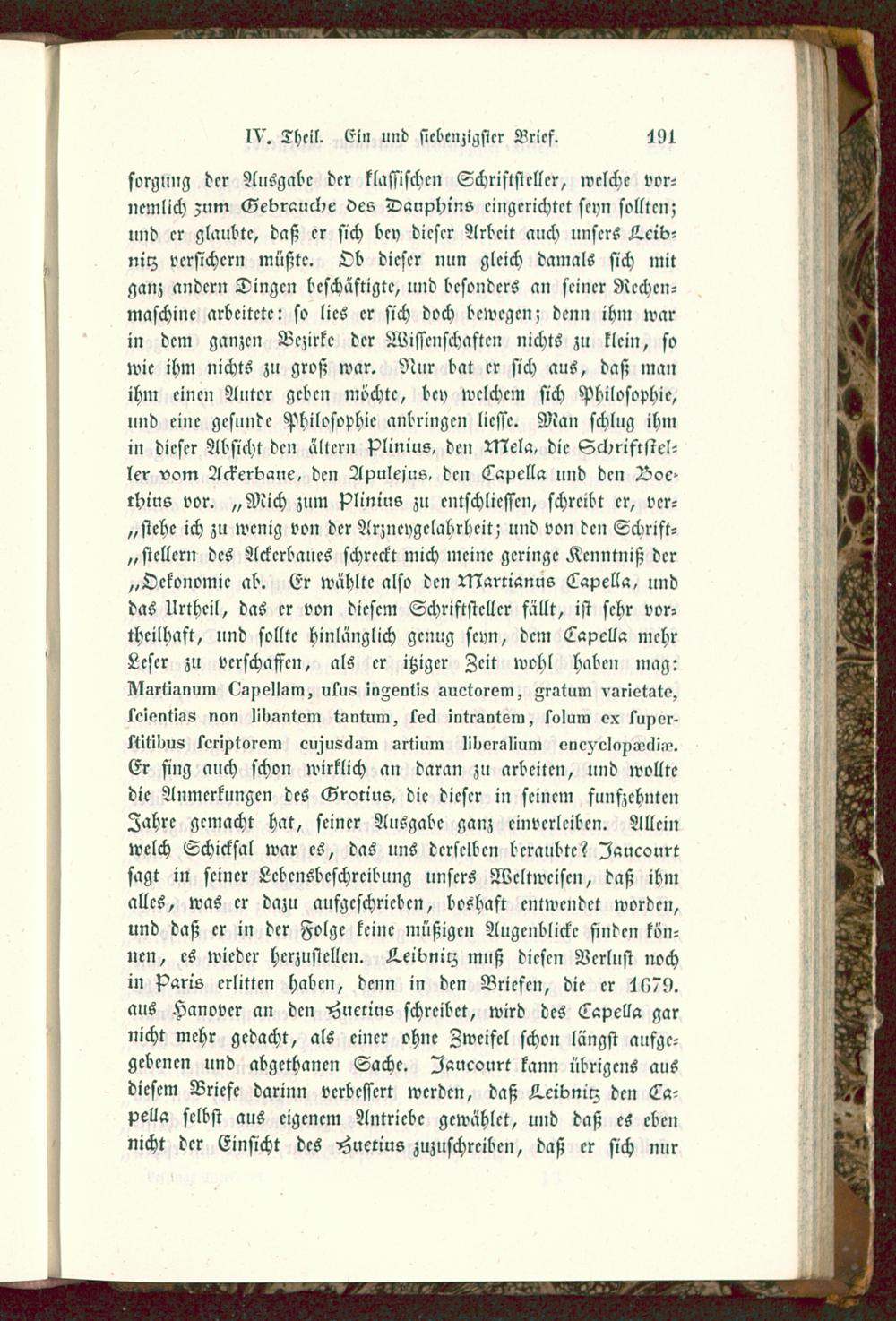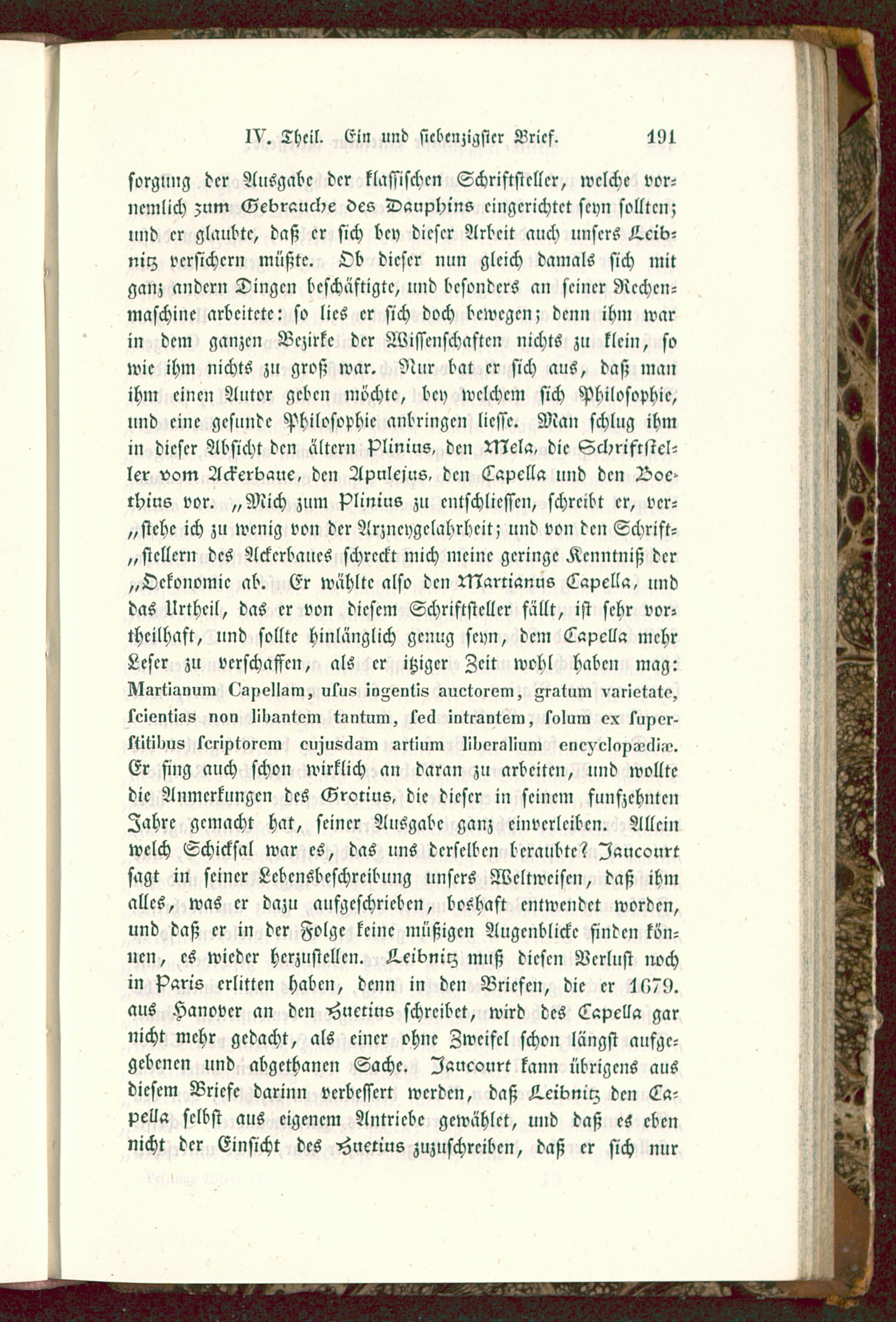 sorgling der Ausgabe der klassischen Schriftsteller, welche vor-ncmlich zum Gebrauche Vcs Dauphins eingerichtet seyn sollten;und er glaubte, daß er sich bey dieser Arbeit auch unsers K.cib-nilz versichern müßte. Ob dieser nun gleich damals sich mitganz andern Dingen beschäftigte, und besonders an seiner Rechen-maschine arbeitete: so lies er sich doch bewegen; denn ihm warin dem ganzen Bezirke der Wissenschaften nichts zu klein, sowie ihm nichts zu groß war. Nur bat er sich aus, daß manihm einen Autor geben möchte, bey welchem sich Philosophie,und eine gesunde Philosophie anbringen liesse. Man schlug ihmin dieser Absicht den ältern Plinius, den N7ela, die Schriftstel-ler vom Ackerbaue, den Apulejus, den Lapclla nnd den Boc>thi'ns vor. „Mich zum Plinius zu entschlicssen, schreibt er, vcr-„stehc ich zu wenig von der ArziM)gclahrhcit; und von den Schrift-„ stellen: des Ackerbaues schreckt mich meine geringe Kenntniß der„Ockonomic ab. Er wählte also den N?artianus Lapella, unddas Urtheil, das er von diesem Schriftsteller fällt, ist sehr vor-thcilhaft, und sollte hinlänglich genug seyn, dem Lapclla mehrLeser zu verschaffen, als er itziger Zeit wehl haben mag:Alsrt'ianum (.'g^ellsm, utus !nA<znt!s auctorom, gratum variotato,lcientlss non liliantoin tkmtuin, secl intrantem, solum ex sur,or-stltil^us scriritarom cu^jusiZiiin srtium lilior.iüum encz clnn-Llli,?.