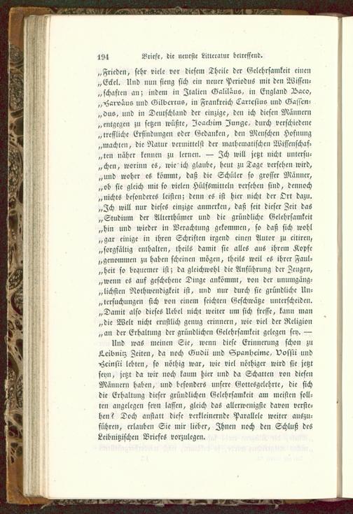 „Frieden, sehr viele vor diesem Theile der Gelehrsamkeit einen„Eckcl. Und nun sicng sich ein neuer Pcriodus mir den Wissen-schaften an; indem in Italien Galilöus, in England Zdaco,„Harvaus und Gilbcrcus, in Frankreich Lartesius und Gajscn-„dus, und in Deutschland der einzige, den ich diesen Männern„entgegen zu setzen wüßte, Joachim Iunge, durch verschiedene„treffliche Erfindungen oder Gedanken, den Menschen Hofnung„machten, die Natur vermittelst der mathematischen Wissenschaf-ten näher kennen zu lernen. — Zch will jetzt nicht untcrsu-„chcn, worinn es, wieich glaube, heut zu Tage versehen wird,„und woher es kömmt, daß die Schüler so grosser Männer,„ob sie gleich mit so vielen Hülfsmitteln versehen sind, dennoch„nichts besonderes leisten; denn es ist hier nicht der Ort dazu.„Zch will nur dieses einzige anmerken, daß seit dieser Zeit das„Studium der Alterthümer und die gründliche Gelehrsamkeit„hin und wieder in Verachtung gekommen, so daß sich wohl„gar einige in ihren Schriften irgend einen Autor zu citiren,„sorgfältig enthalten, theils damit sie alles aus ihrem Kopfe„genommen zu haben scheinen mögen, theils weil es ihrer Faul-heit so bequemer ist; da gleichwohl die Anführung der Zeugen,„wenn es auf geschehene Dinge ankömmt, von der unumgäng-„ liebsten Nothwendigkeit ist, und Nur durch sie gründliche Un-tersuchungen sich von einem seichten Geschwätze unterscheiden.„Damit also dieses Uebel nicht weiter um sich fresse, kann man„die Welt nicht ernstlich genug erinnern, wie viel der Religion„an der Erhaltung der gründlichen Gelehrsamkeit gelegen sey. —Und was meinen Sie, wenn diese Erinnerung schon zuAeibniiz Zeiten, da noch GuSu und Spanhcime, vossii undHcmsii lebten, so nöthig war, wie viel nöthiger wird sie jetztseyn, jetzt da wir noch kaum hier und da Schatten von diesenMännern haben, und besonders unsere Gottcsgclchrte, die sichdie Erhaltung dieser gründlichen Gelehrsamkeit am meisten soll-ten angelegen seyn lassen, gleich das allerwenigste davon verste-hen? Doch anstatt diese verkleinernde Parallele weiter auszu-führen, erlauben Sie mir lieber, Ihnen noch den Schluß desLcibnitzischcn Briefes vorzulegen.