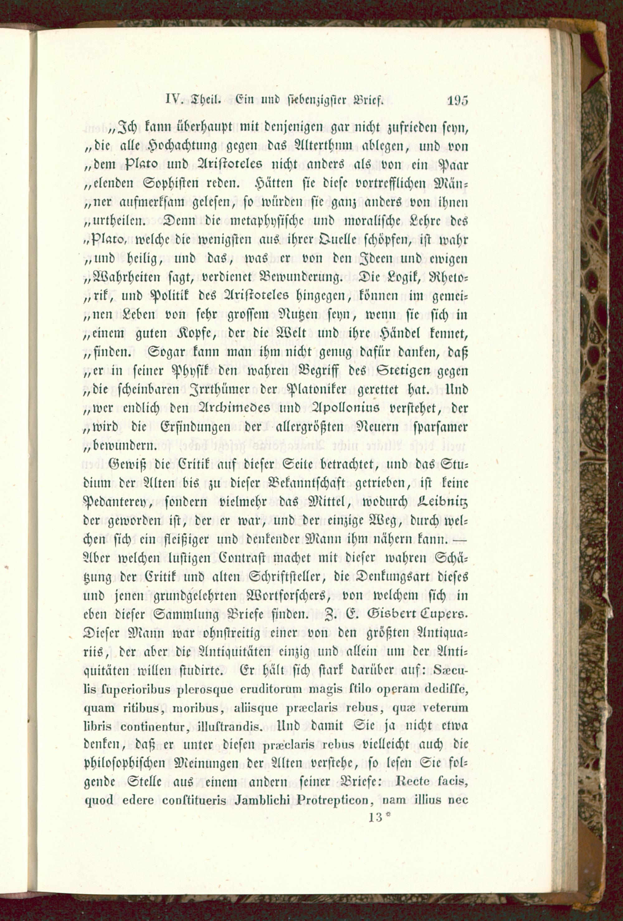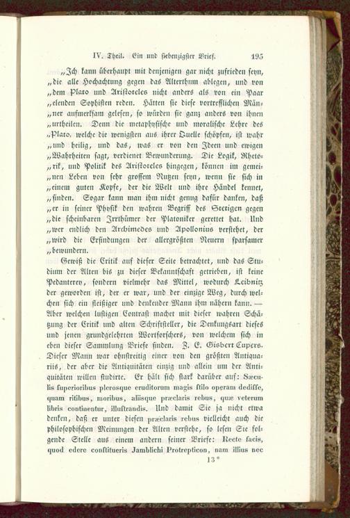 Gewiß die Eritik auf dieser Seite betrachtet, und das Stu-dium der Alten bis zu dieser Bekanntschaft getrieben, ist keinePcdantcrev, sondern vielmehr das Mittel, wodurch L.cibnirzder geworden ist, der er war, und der einzige Weg, durch wel-chen sich ein fleißiger und denkender Mann ihm nähern kann. —Aber welchen lustigen Conlrast machet mit dieser wahren Schä-tzung der Critik und alten Schriftsteller, die Dcnkungsart diesesund jenen grundgelehrten Wortforschcrs, von welchem sich ineben dieser Sammlung Briefe finden. Z. E. Gisbcrr Cupcrs.Dieser Mann war ohnstrcitig einer von den größten Antiqua-riis, der aber die Antiquitäten einzig und allein um der Anti-quitäten willen studirtc. Er hält sich stark darüber auf: 8-eeu-lis tunorioiilius plei'oslzuo oruclitorum msZIs ttiln operan» llecliflo,ljUÄM ritiuus, morivus, uliis<zuo nrlvel-iris ivlius, «ju-e veterumIibri5 contmentiir, illustr-inclis. Und damit Sie ja nicht etwadenken, daß er unter diesen ni-Lelaris rvliu« vielleicht auch diephilosophischen Meinungen der Alten verstehe, so lesen Sie fol-gende Stelle aus einem andern seiner Briefe: lieetv tueit-,«zuoll eclere conktitueris ^amdlicki protrepticon. nsm ilüus nee