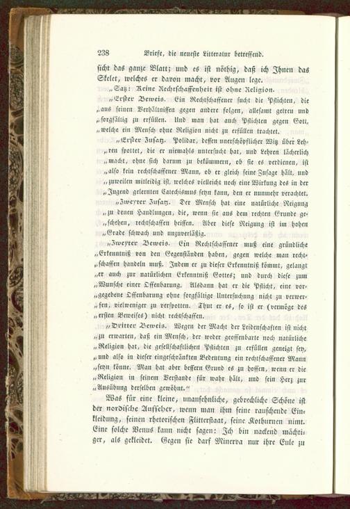 „Dritter Beweis. Wegen der Macht der Leidenschaften ist nicht„zu erwarten, daß ein Mensch, der weder geoffenbarte noch natürliche„Religion hat, die gesellschaftlichen Pflichten zu erfüllen geneigt sey,„und also in dieser eingeschränkten Bedeutung ein rechtschaffener Manu„seyn könne. Man hat aber bessern Grund es zu hoffen, wenn er die„Religion in seinem Verstände für wahr hält, und sein Herz zur„Ausübung derselben gewöhnt."