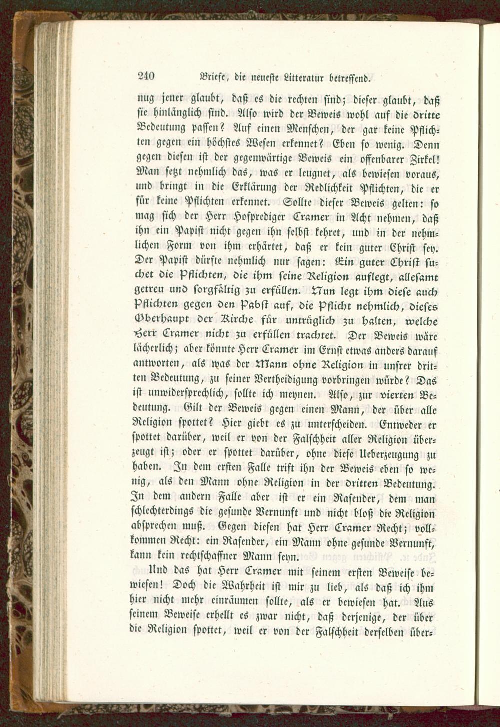 nug jener glaubt, daß es die rechten sind; dieser glaubt, daßsie hinlänglich sind. Also wird der Beweis wohl auf die dritteBedeutung passen? Auf einen Menschen, der gar keine Pflich-ten gegen ein höchstes Wesen erkennet? Eben so wenig. Denngegen diesen ist der gegenwärtige Beweis ein offenbarer Zirkel!Man setzt nehmlich das, was er leugnet, als bewiesen voraus,und bringt in die Erklärung der Redlichkeit Pflichten, die erfür keine Pflichten erkennet. Sollte dieser Beweis gelten: somag sich der Herr Hofprcdigcr Lramer in Acht nehmen, daßihn ein Papist nicht gegen ihn selbst kehret, und :n der nehm-lichen Form von ihm erhärtet, daß er kein gurcr Christ sey.Der Papist dürfte nehmlich nur sagen: lLin guter Christ su-chet die Pflichten, die ihm seine Religion auflegt, allesamtgetreu und sorgfältig zu erfüllen. Ü57un legt ihm diese auchPflichten gegen den Pabst auf, die Pflicht nehmlich, diesesOberhaupt der Rirche für untrüglich zu halten, roelcheHerr Cramcr nicht zu erfüllen trachtet. Der Beweis wärelächerlich; aber könnte Herr Lramer im Ernst etwas anders daraufantworten, als was der Mann ohne Religion in nnsrer drit-ten Bedeutung, zu seiner Vertheidigung vorbringen würde? Dasist unwidcrsprcchlich, sollte ich meynen. Also, zur vierten Be-deutung. Gilt der Beweis gegen einen Mann, der über alleReligion spottet? Hier giebt es zu unterscheiden. Entweder erspottet darüber, weil er von der Falschheit aller Religion über-zeugt ist; oder er spottet darüber, ohne diese Ueberzeugung zuhaben. Zn dem ersten Falle trift ihn der Beweis eben so we-nig, als den Mann ohne Religion in der dritten Bedeutung.Zn dem andern Falle aber ist er ein Rasender, dem manschlechterdings die gesunde Vernunft und nicht bloß die Religionabsprechen muß. Gegen diesen hat Herr Lramer Recht; voll-kommen Recht: ein Rasender, ein Mann ohne gesunde Vernunft,kann kein rechtschaffner Mann seyn.